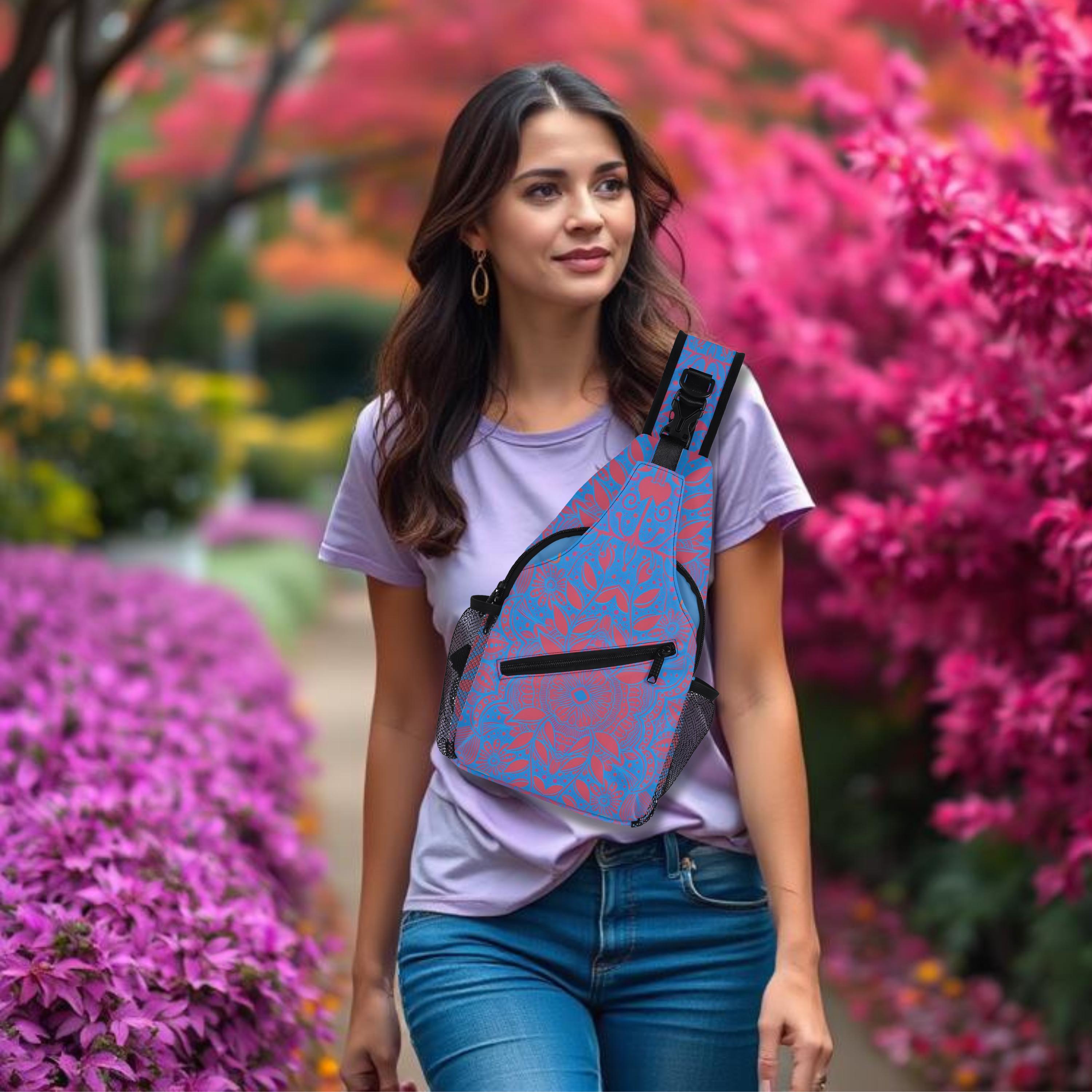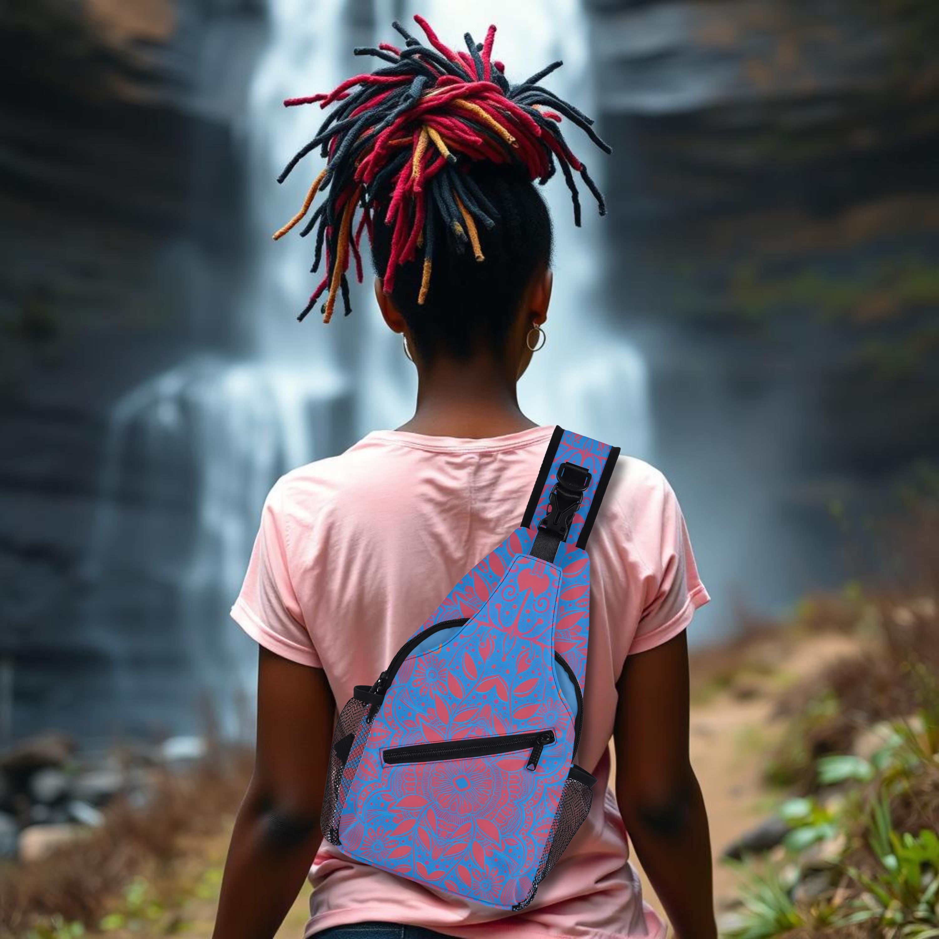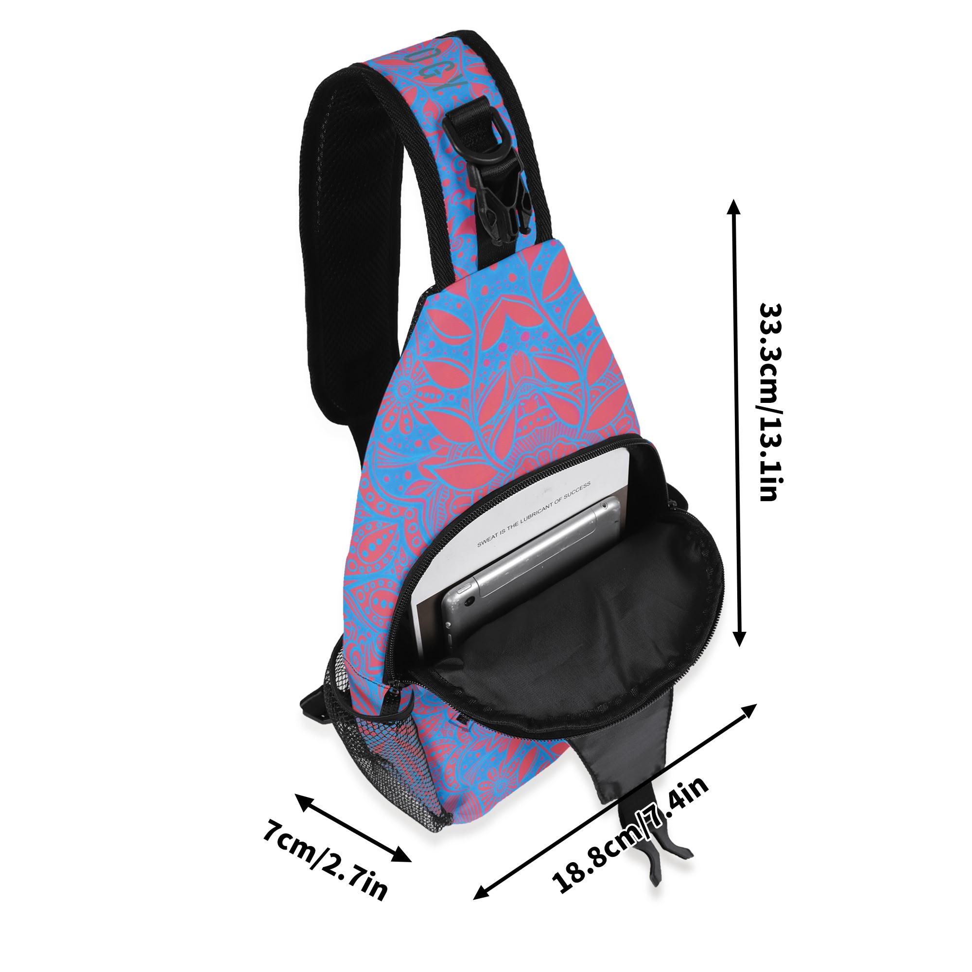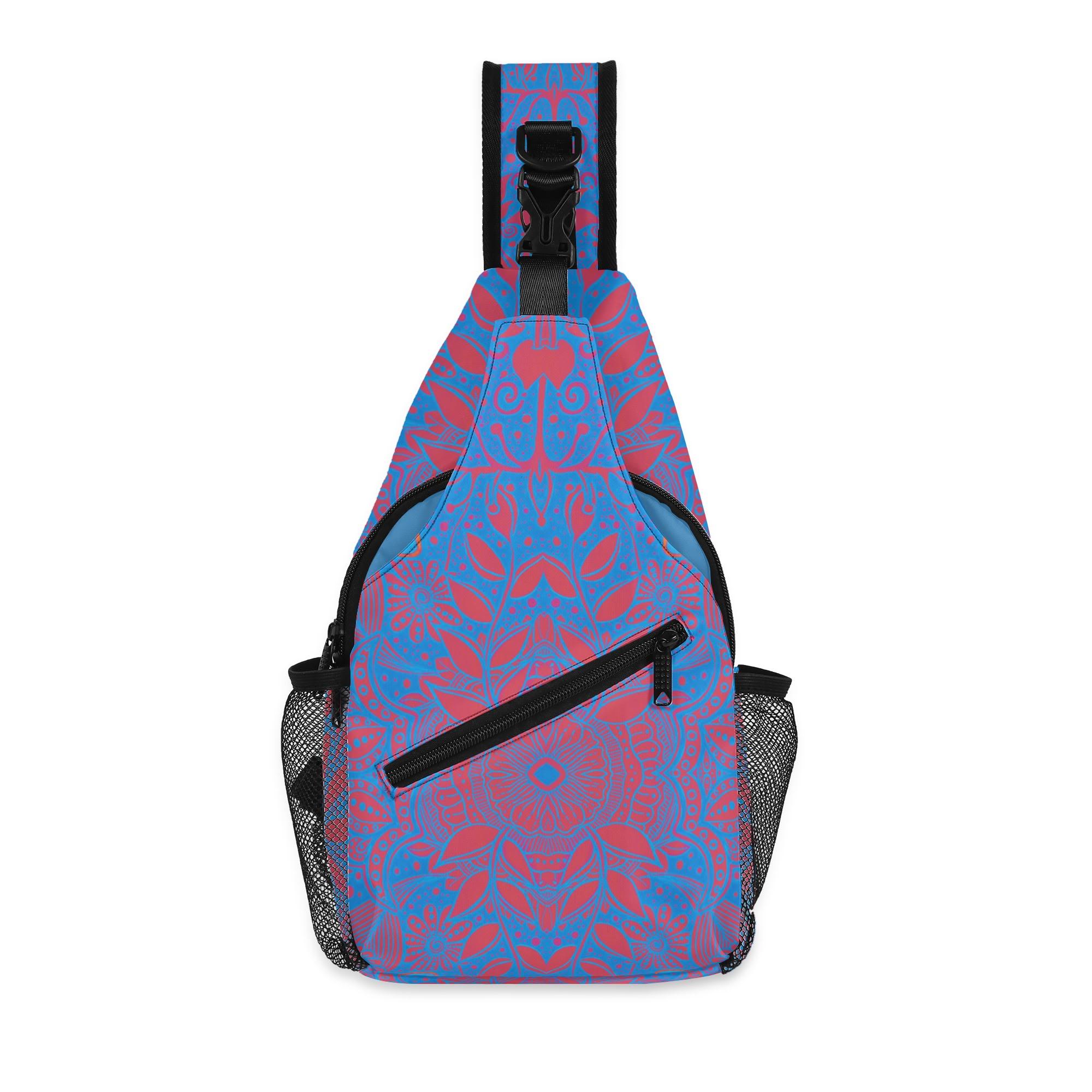 Our Crimson Brocadesque Design Crossbody Sling Bag has a surreal crimson and orange floral mosaic design. Whether you're going for a leisurely walk, hitting the gym, or exploring a new city, this versatile sling bag is the perfect companion. This small backpack is designed with both functionality and style in mind, featuring a main compartment and three small pockets to hold all your essentials, as well as a comfortable crossbody strap for easy carrying. Made from eco-friendly materials, this boho chic bag is a must-have for your vacation essentials and everyday carry. Let the uniqueness of our design inspire your adventures with our Crimson Brocadesque Design Chest Bag. Treat yourself today!