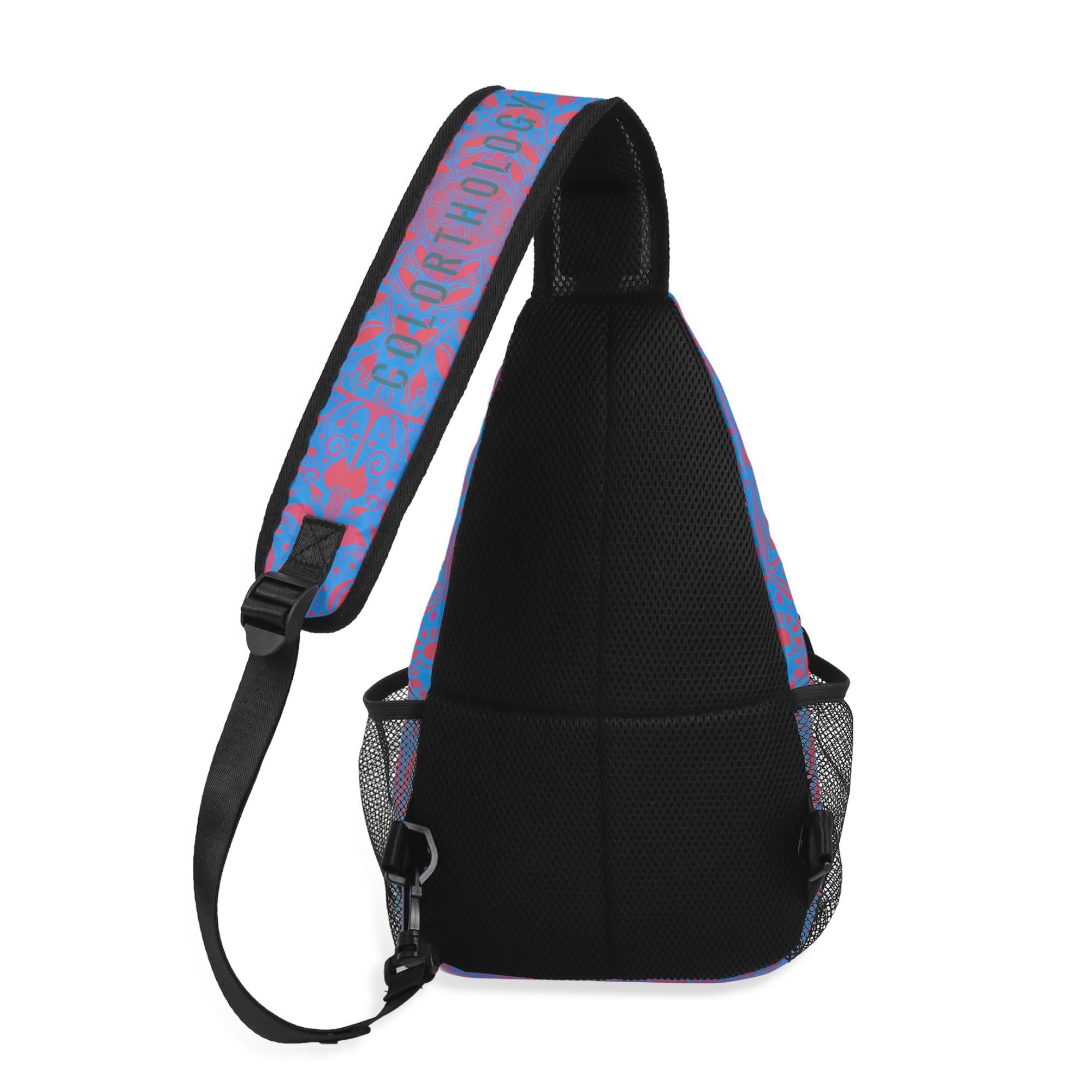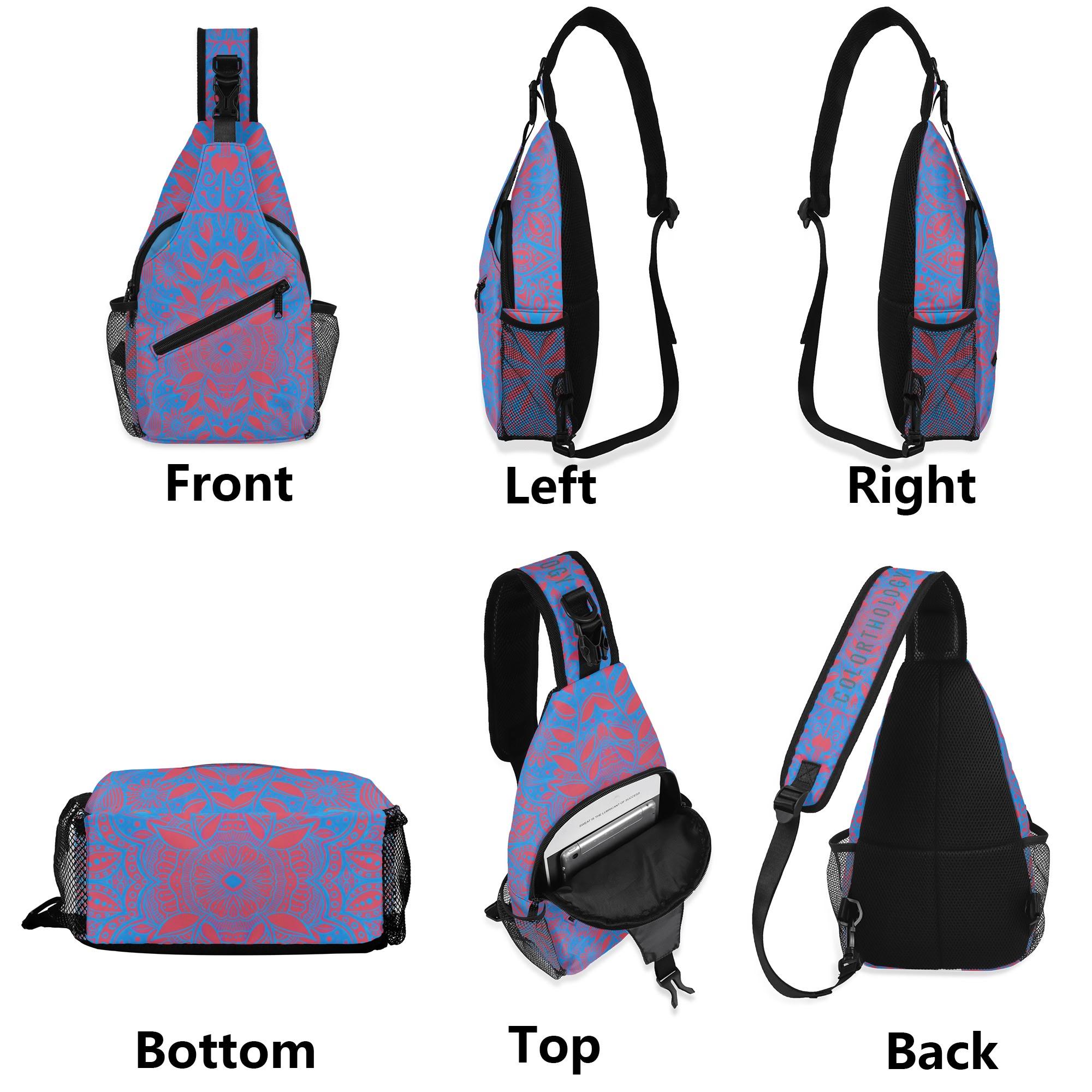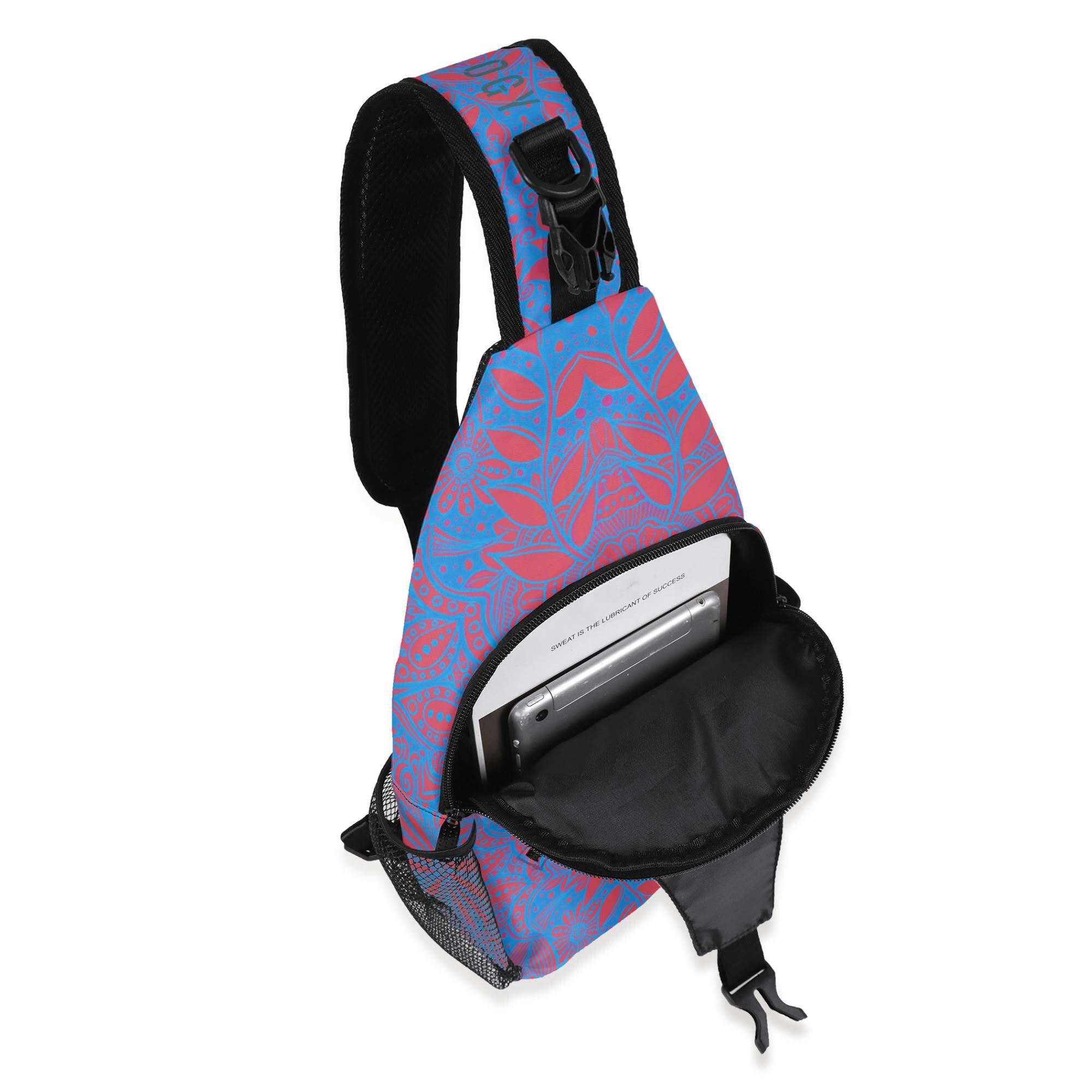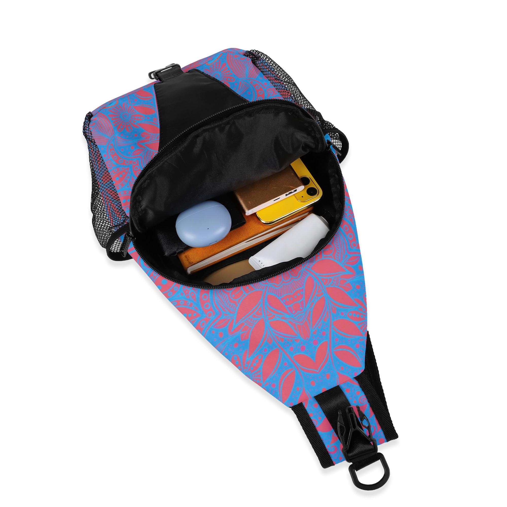 Our Crimson Brocadesque Design Crossbody Sling Bag has a surreal crimson and orange floral mosaic design. Whether you're going for a leisurely walk, hitting the gym, or exploring a new city, this versatile sling bag is the perfect companion. This small backpack is designed with both functionality and style in mind, featuring a main compartment and three small pockets to hold all your essentials, as well as a comfortable crossbody strap for easy carrying. Made from eco-friendly materials, this boho chic bag is a must-have for your vacation essentials and everyday carry. Let the uniqueness of our design inspire your adventures with our Crimson Brocadesque Design Chest Bag. Treat yourself today!