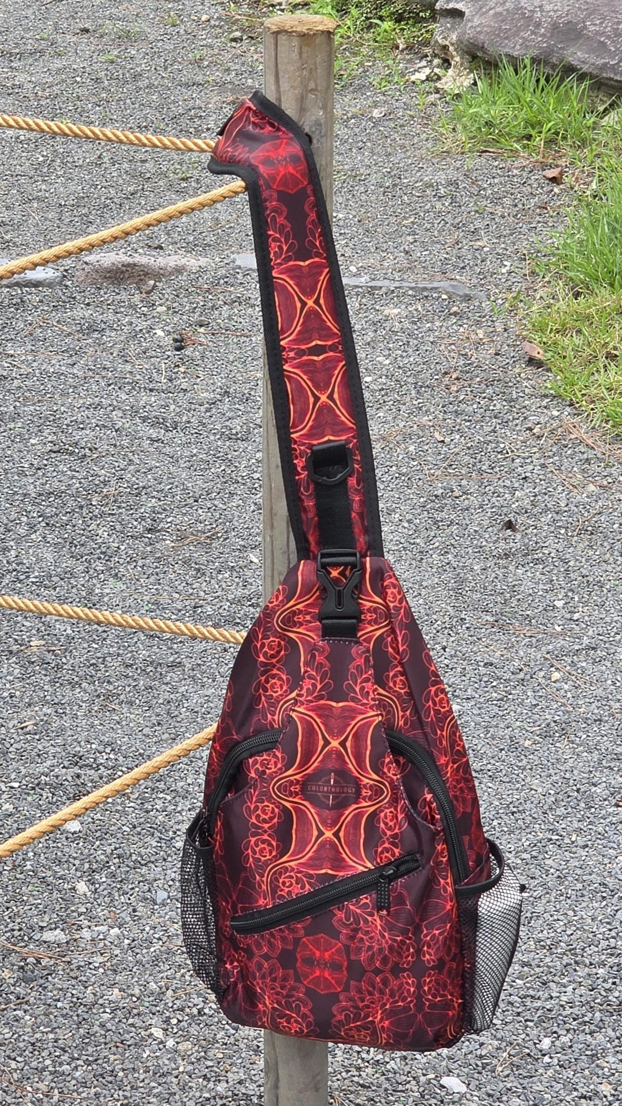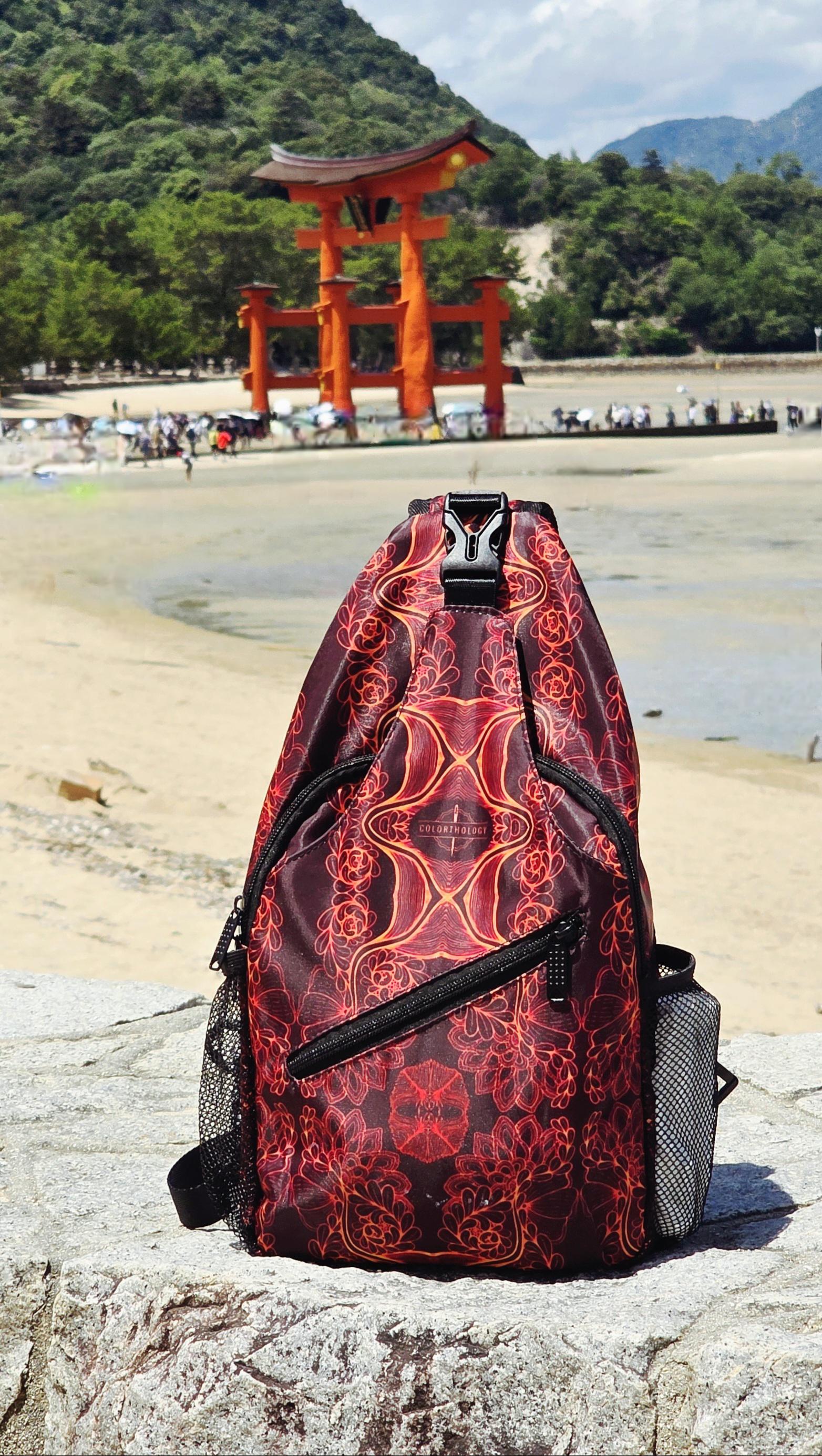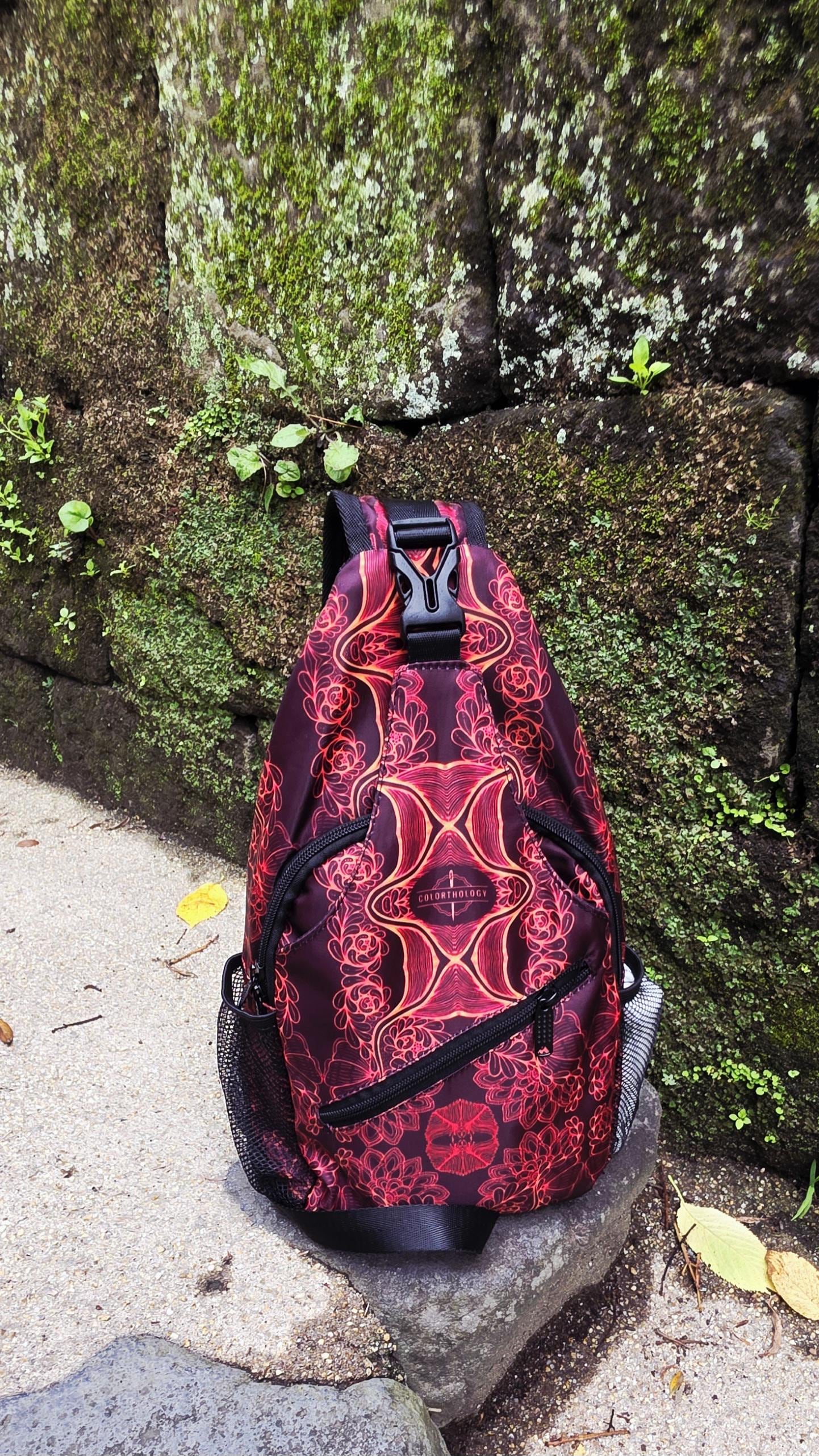 Our Crimson Brocadesque Design Crossbody Sling Bag has a surreal crimson and orange floral mosaic design. Whether you're going for a leisurely walk, hitting the gym, or exploring a new city, this versatile sling bag is the perfect companion. This small backpack is designed with both functionality and style in mind, featuring a main compartment and three small pockets to hold all your essentials, as well as a comfortable crossbody strap for easy carrying. Made from eco-friendly materials, this boho chic bag is a must-have for your vacation essentials and everyday carry. Let the uniqueness of our design inspire your adventures with our Crimson Brocadesque Design Chest Bag. Treat yourself today!