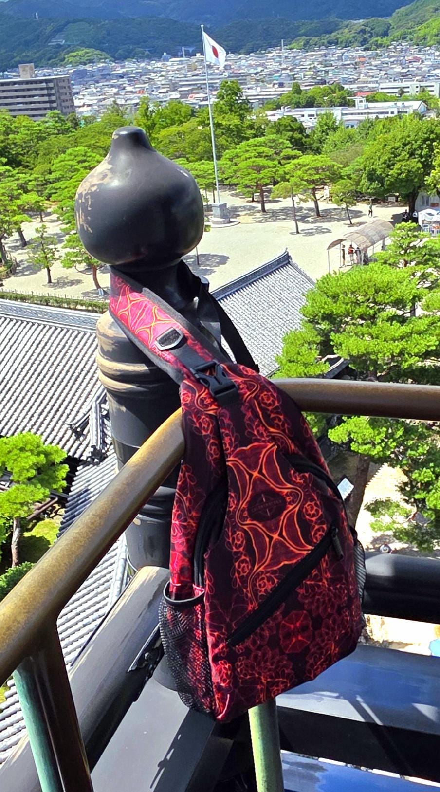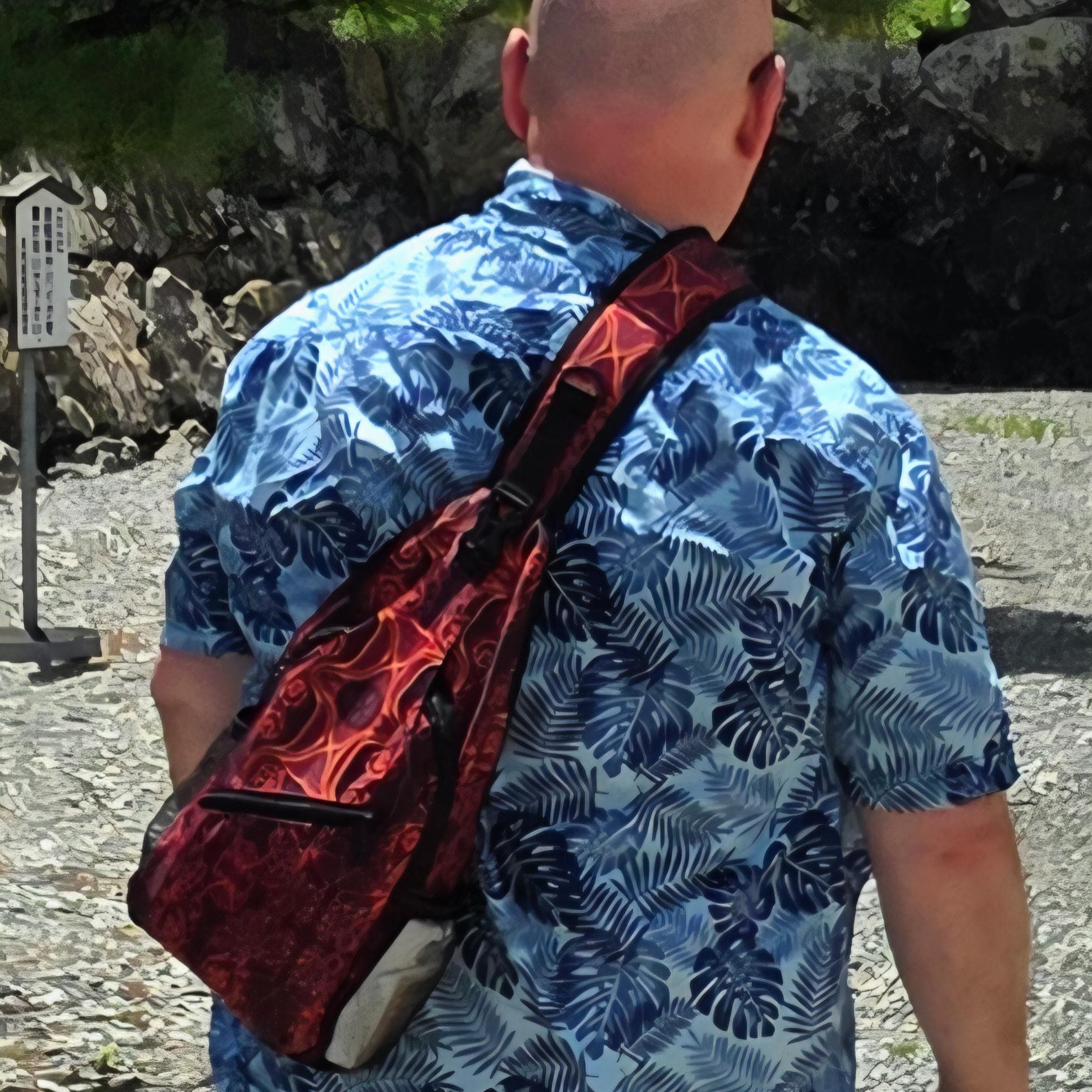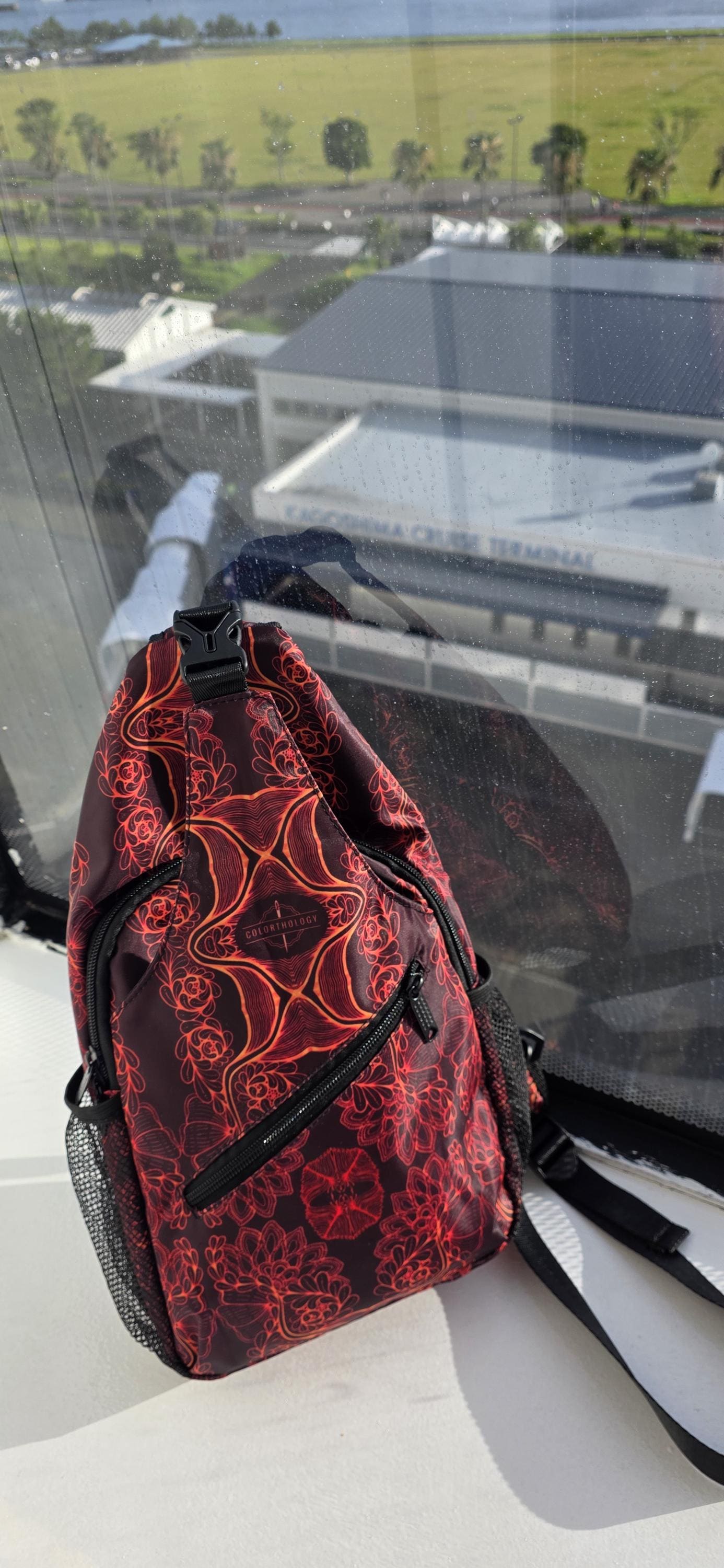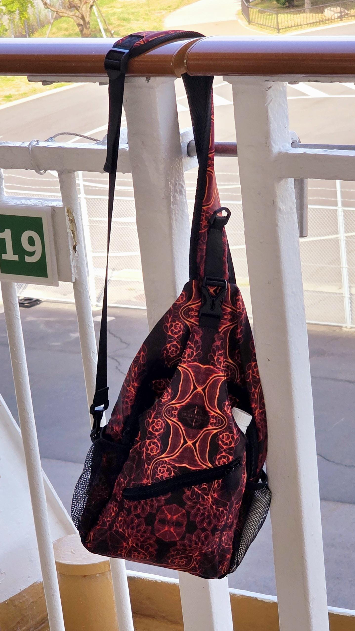 Our Crimson Brocadesque Design Crossbody Sling Bag has a surreal crimson and orange floral mosaic design. Whether you're going for a leisurely walk, hitting the gym, or exploring a new city, this versatile sling bag is the perfect companion. This small backpack is designed with both functionality and style in mind, featuring a main compartment and three small pockets to hold all your essentials, as well as a comfortable crossbody strap for easy carrying. Made from eco-friendly materials, this boho chic bag is a must-have for your vacation essentials and everyday carry. Let the uniqueness of our design inspire your adventures with our Crimson Brocadesque Design Chest Bag. Treat yourself today!