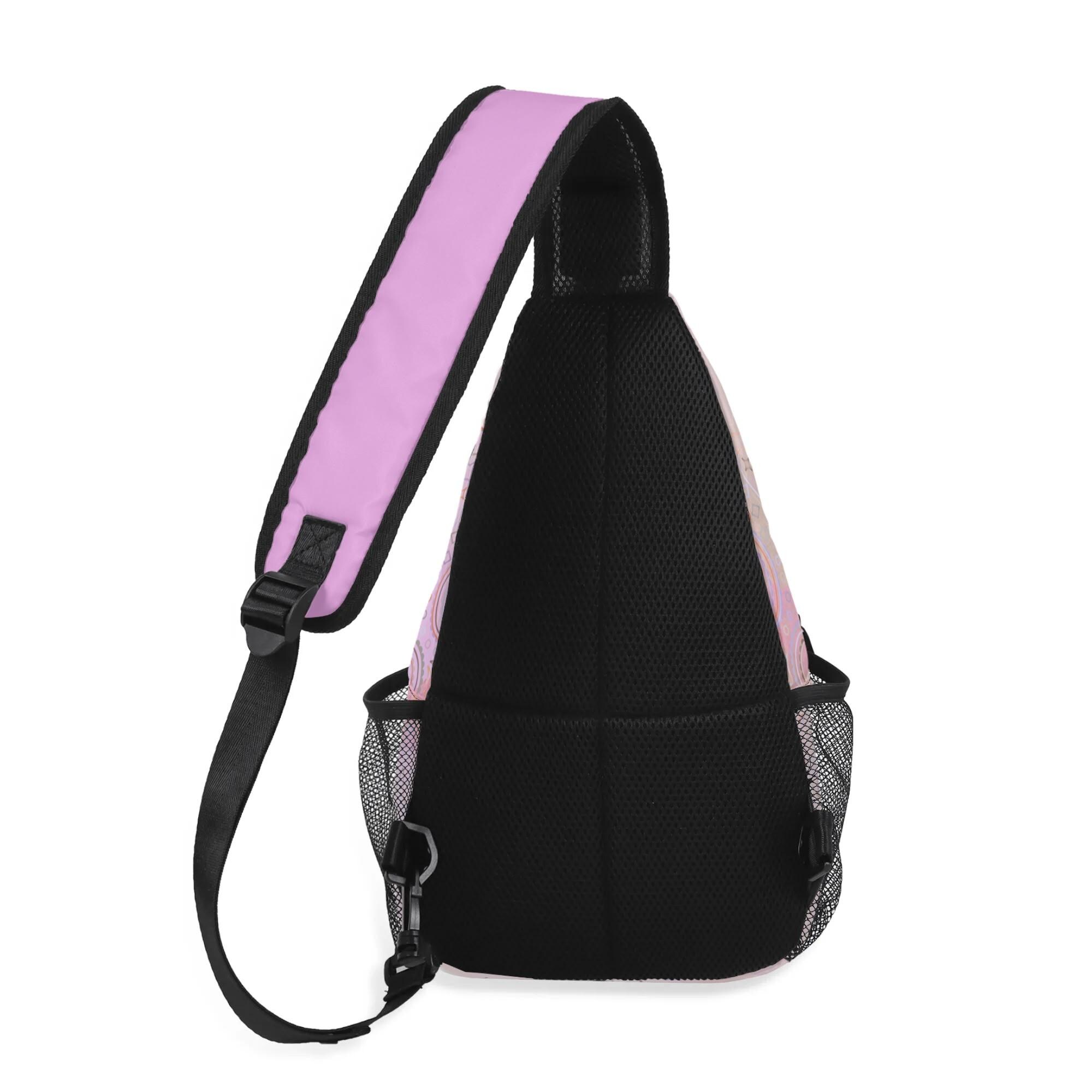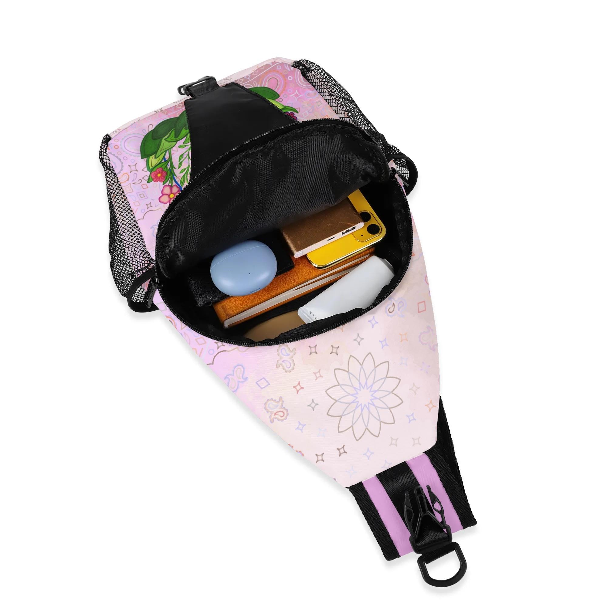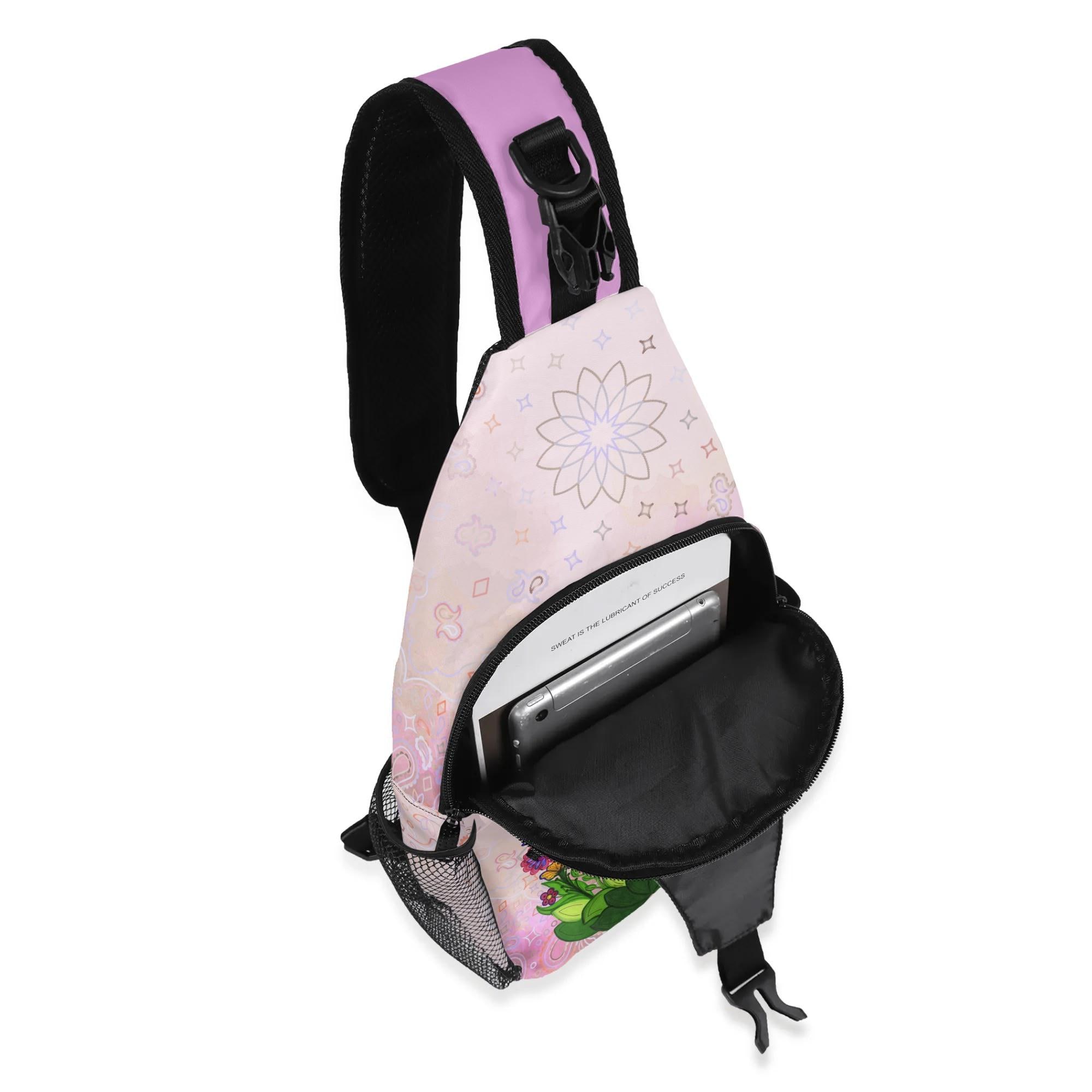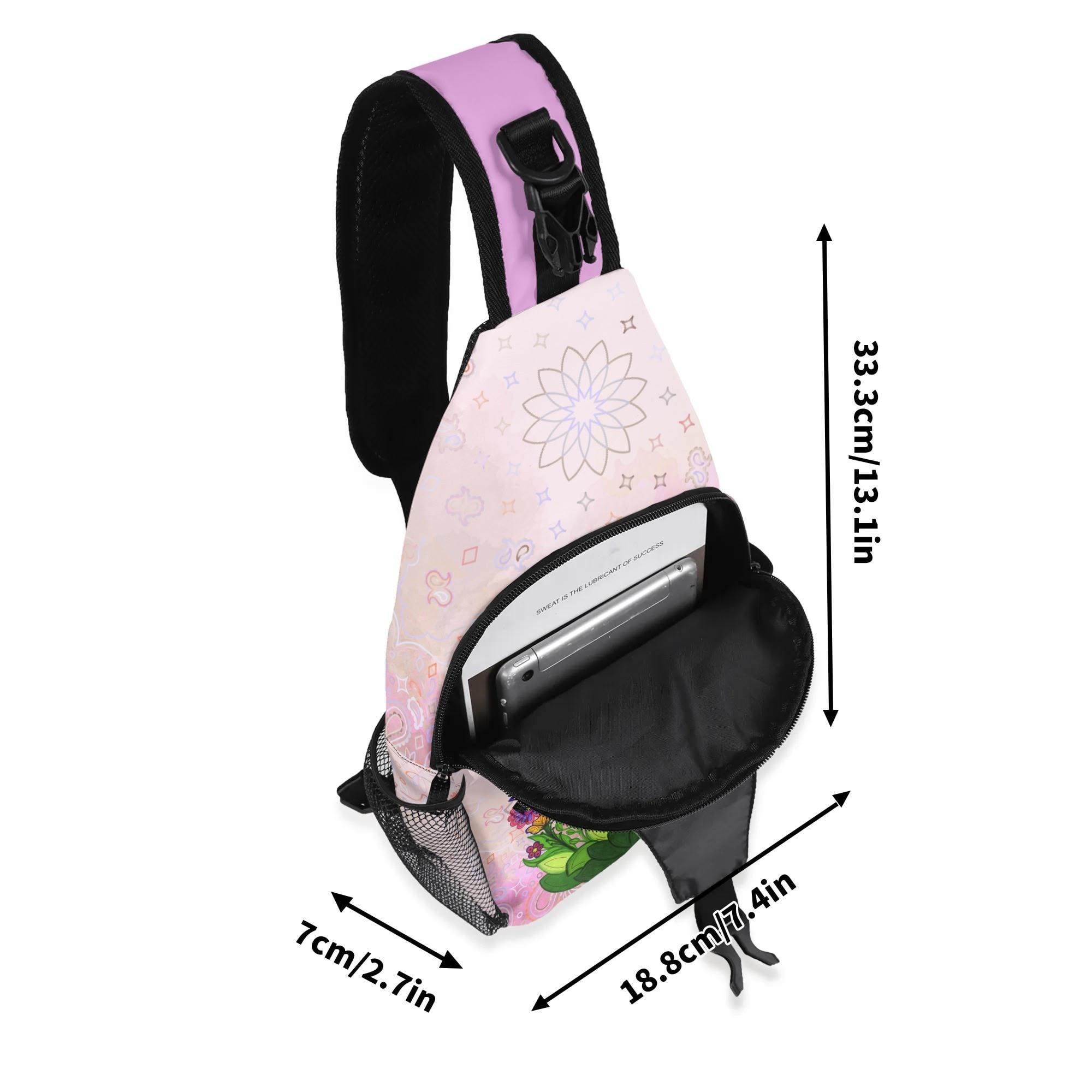 Our Pink Fairy Garden Design Crossbody Sling Bag has a surreal crimson and orange floral mosaic design. Whether you're going for a leisurely walk, hitting the gym, or exploring a new city, this versatile sling bag is the perfect companion. This small backpack is designed with both functionality and style in mind, featuring a main compartment and three small pockets to hold all your essentials, as well as a comfortable crossbody strap for easy carrying. Made from eco-friendly materials, this boho chic bag is a must-have for your vacation essentials and everyday carry. Let the uniqueness of our design inspire your adventures with our Crimson Brocadesque Design Chest Bag. Treat yourself today!