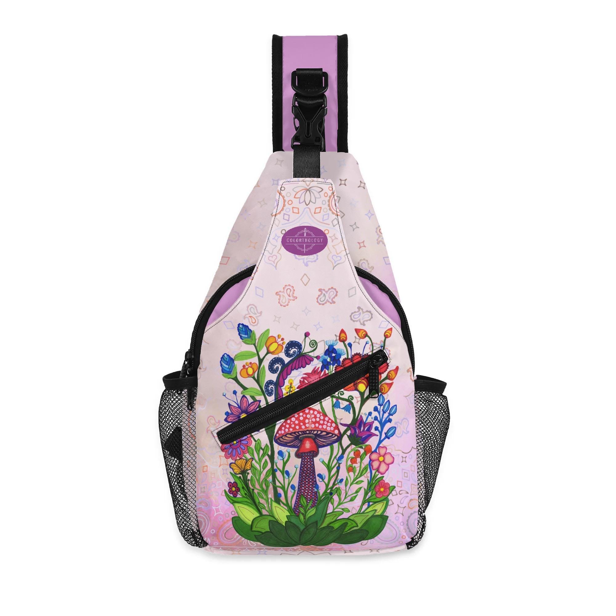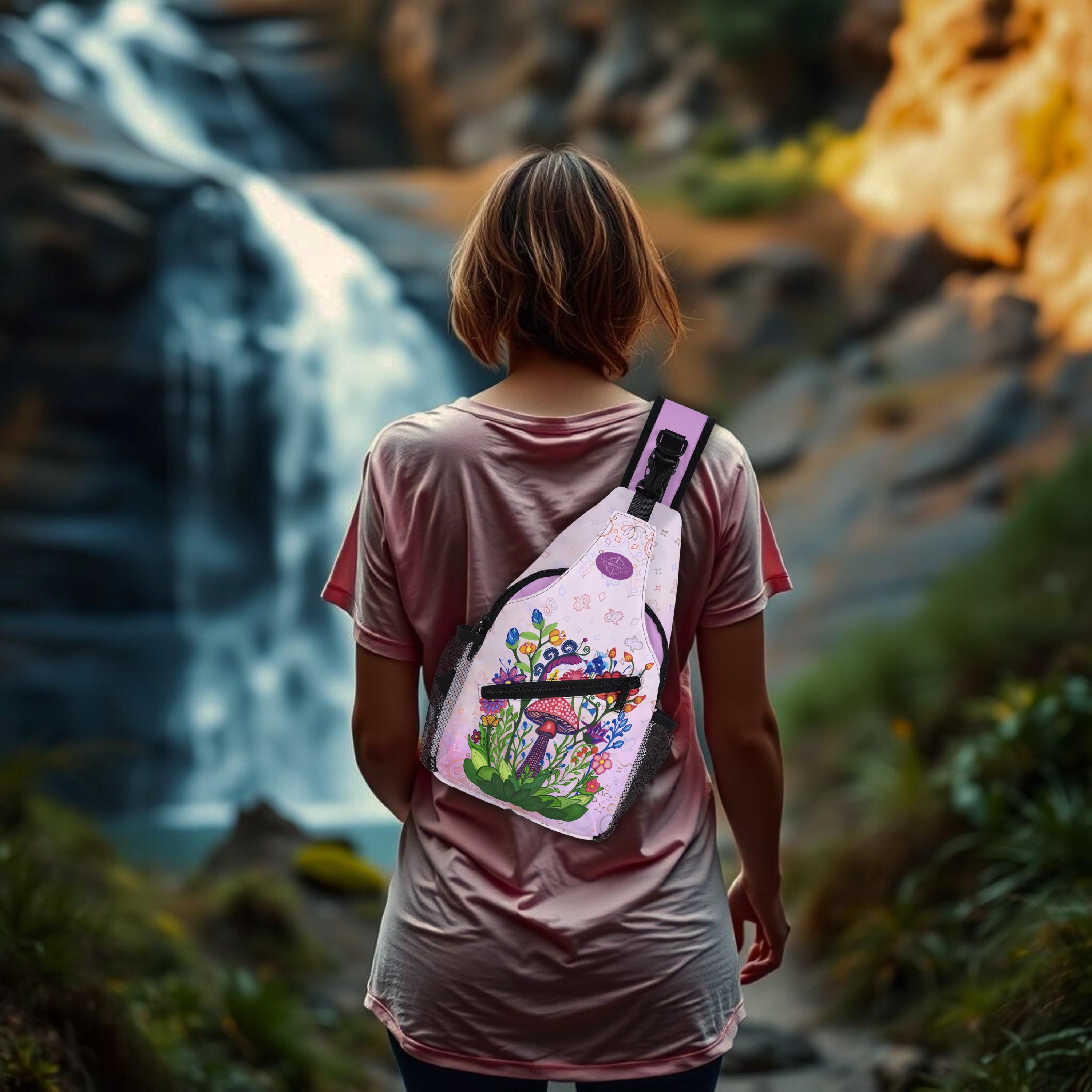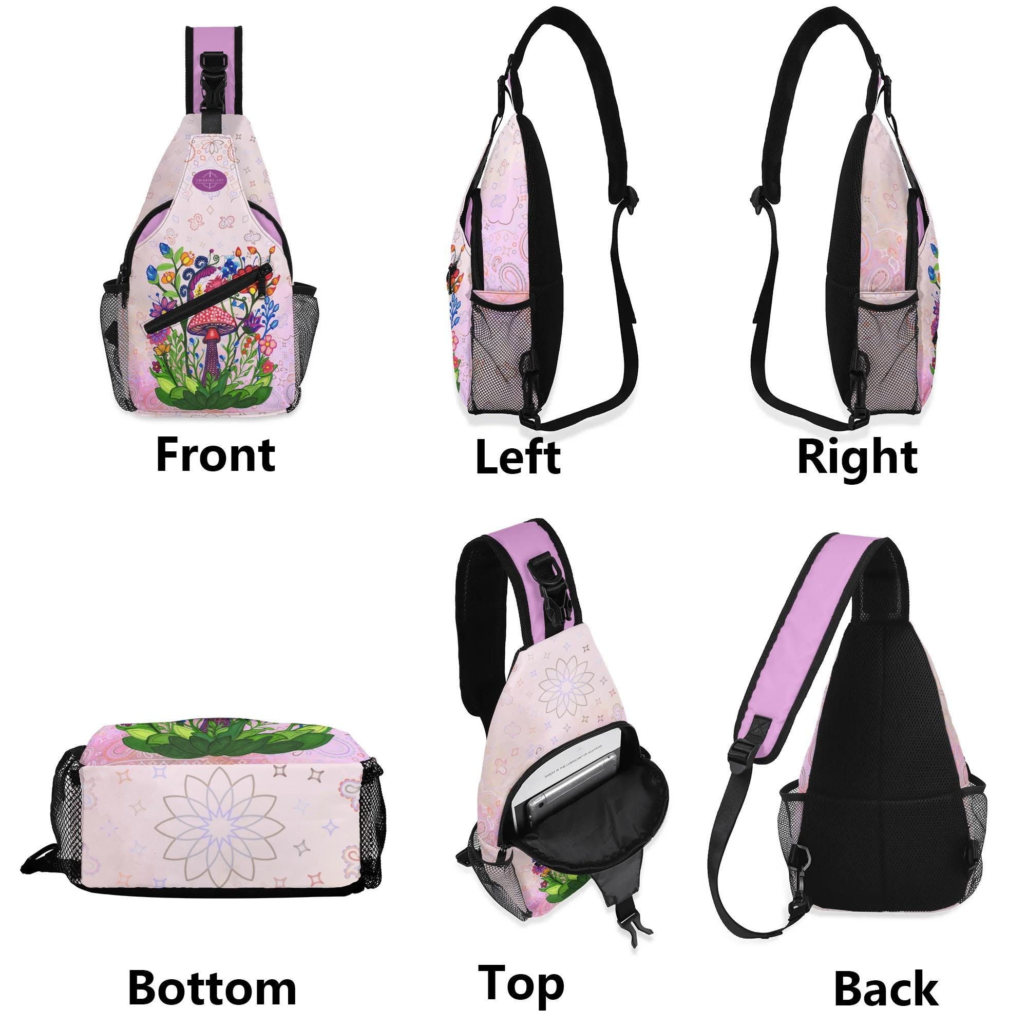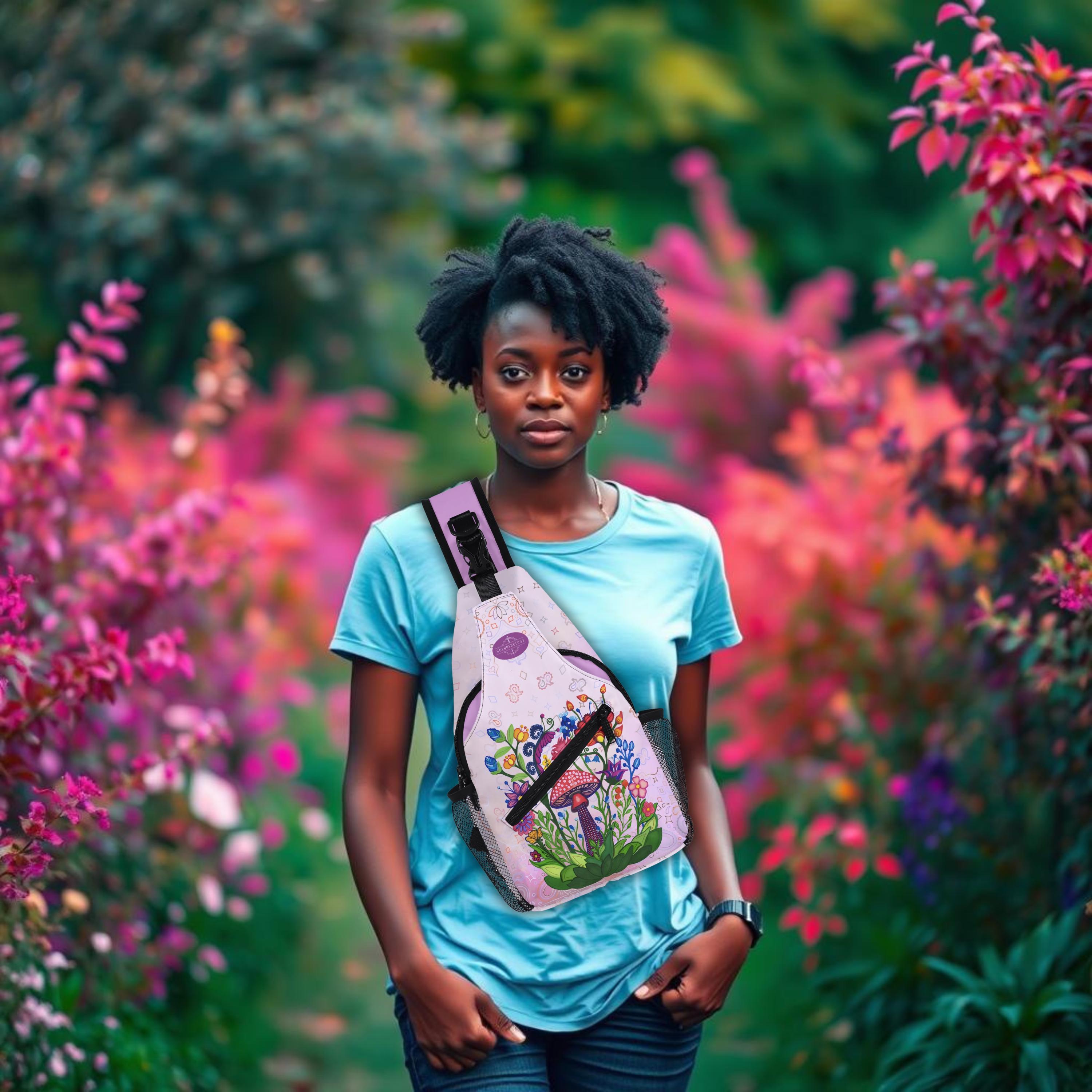 Our Pink Fairy Garden Design Crossbody Sling Bag has a surreal crimson and orange floral mosaic design. Whether you're going for a leisurely walk, hitting the gym, or exploring a new city, this versatile sling bag is the perfect companion. This small backpack is designed with both functionality and style in mind, featuring a main compartment and three small pockets to hold all your essentials, as well as a comfortable crossbody strap for easy carrying. Made from eco-friendly materials, this boho chic bag is a must-have for your vacation essentials and everyday carry. Let the uniqueness of our design inspire your adventures with our Crimson Brocadesque Design Chest Bag. Treat yourself today!