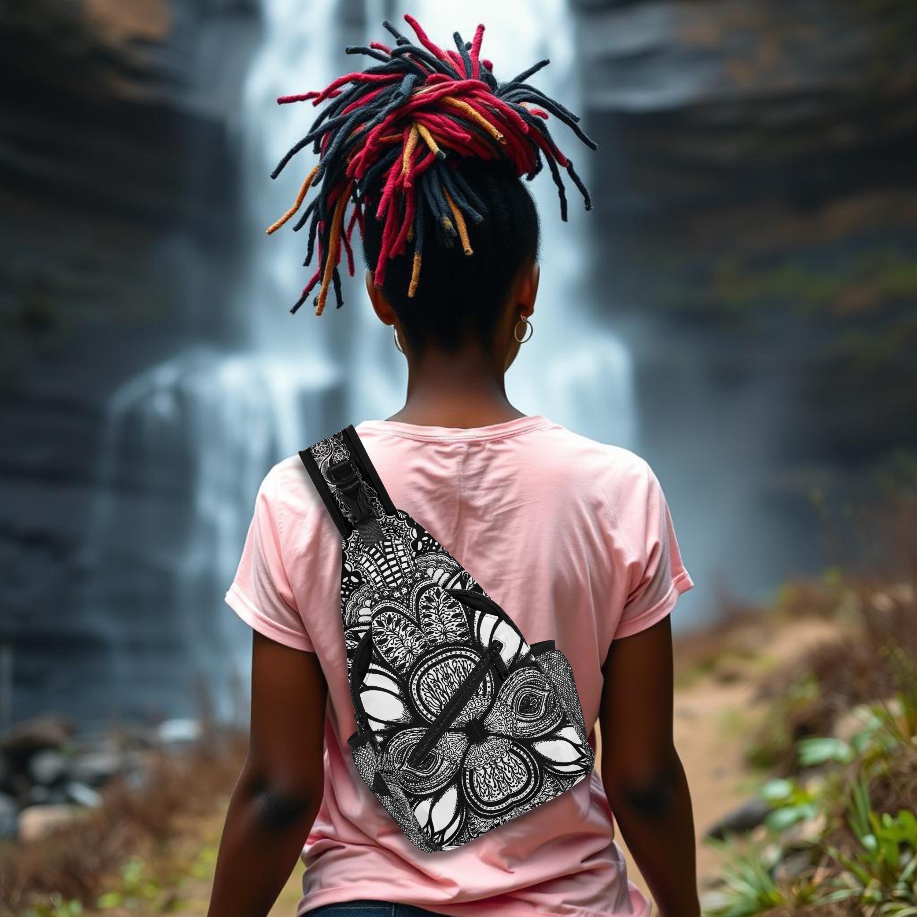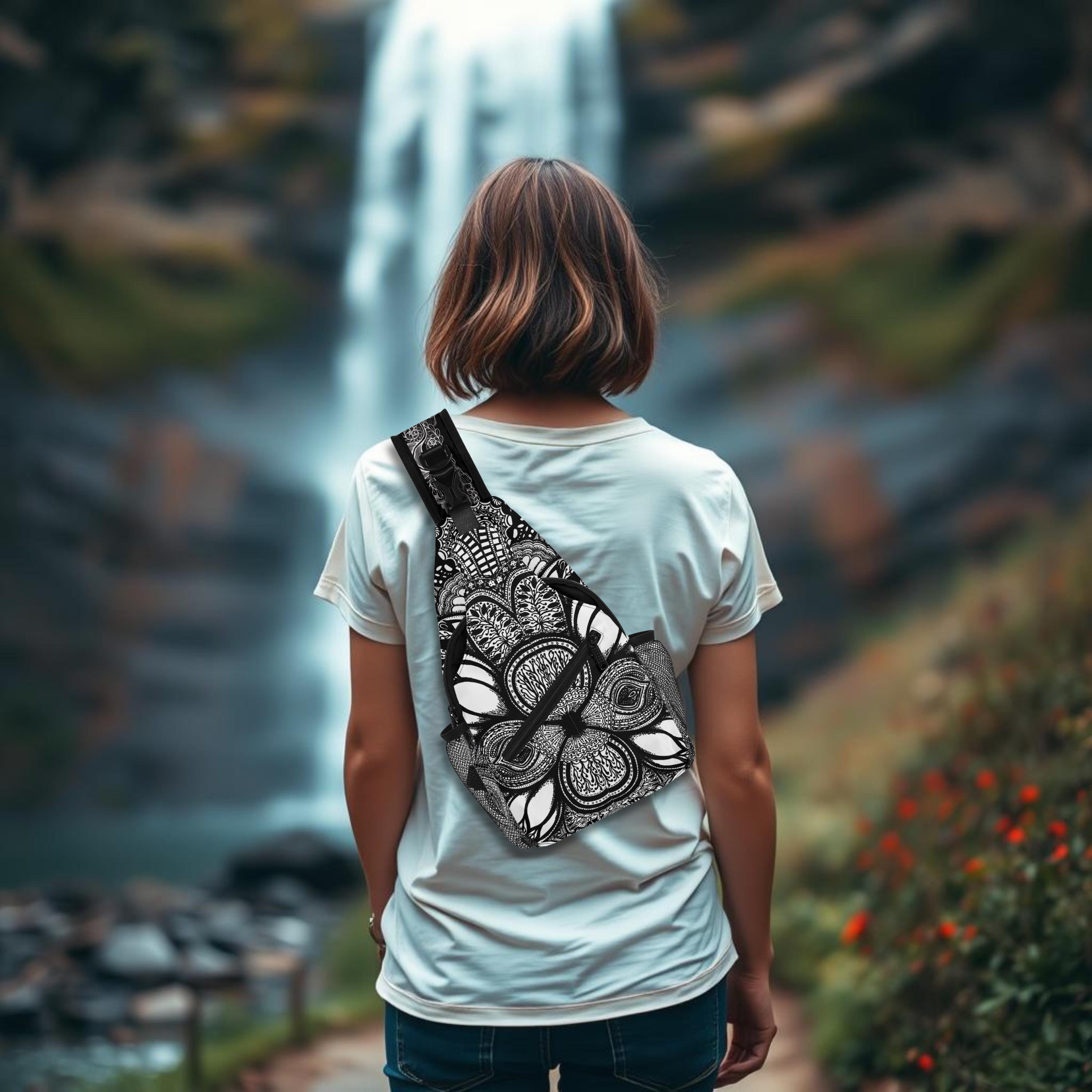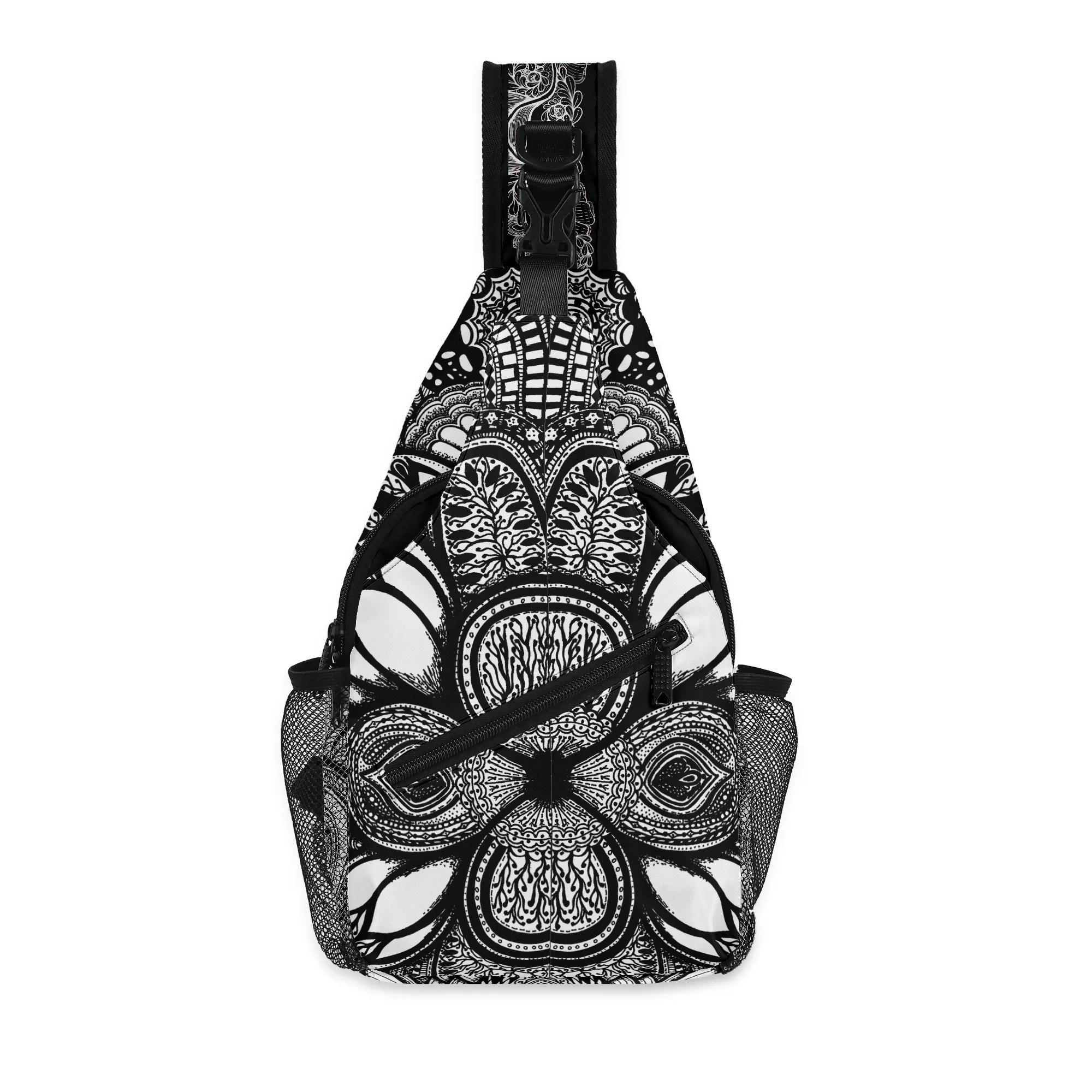Our Georgia Crossbody Sling Bag has a surreal black and white floral design. Whether you're going for a leisurely walk, hitting the gym, or exploring a new city, this versatile sling bag is the perfect companion. This small backpack is designed with both functionality and style in mind, featuring a main compartment and three small pockets to hold all your essentials, as well as a comfortable crossbody strap for easy carrying. Made from eco-friendly materials, this boho chic bag is a must-have for your vacation essentials and everyday carry. Let the uniqueness of our design inspire your adventures with our Georgia Chest Bag. Treat yourself today!