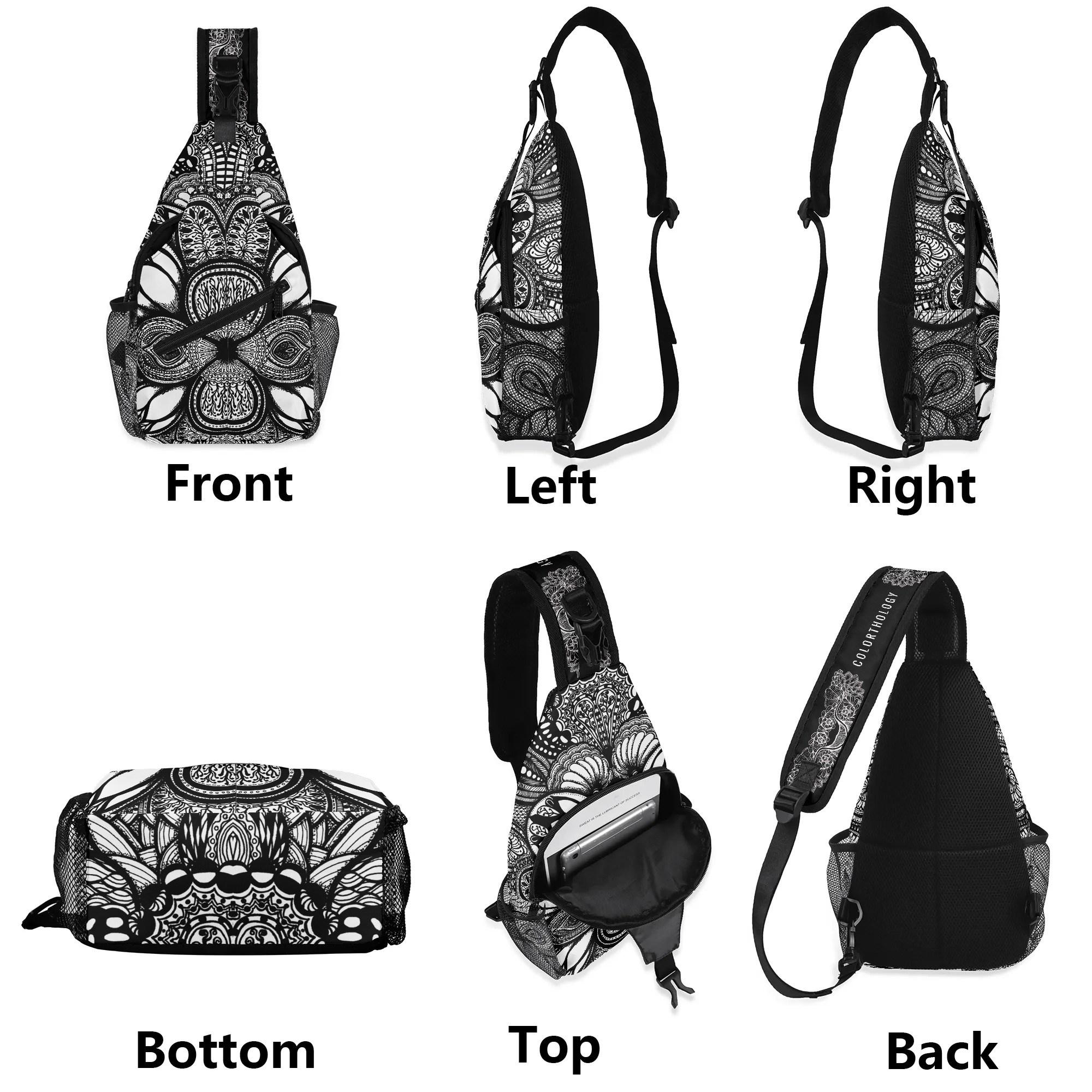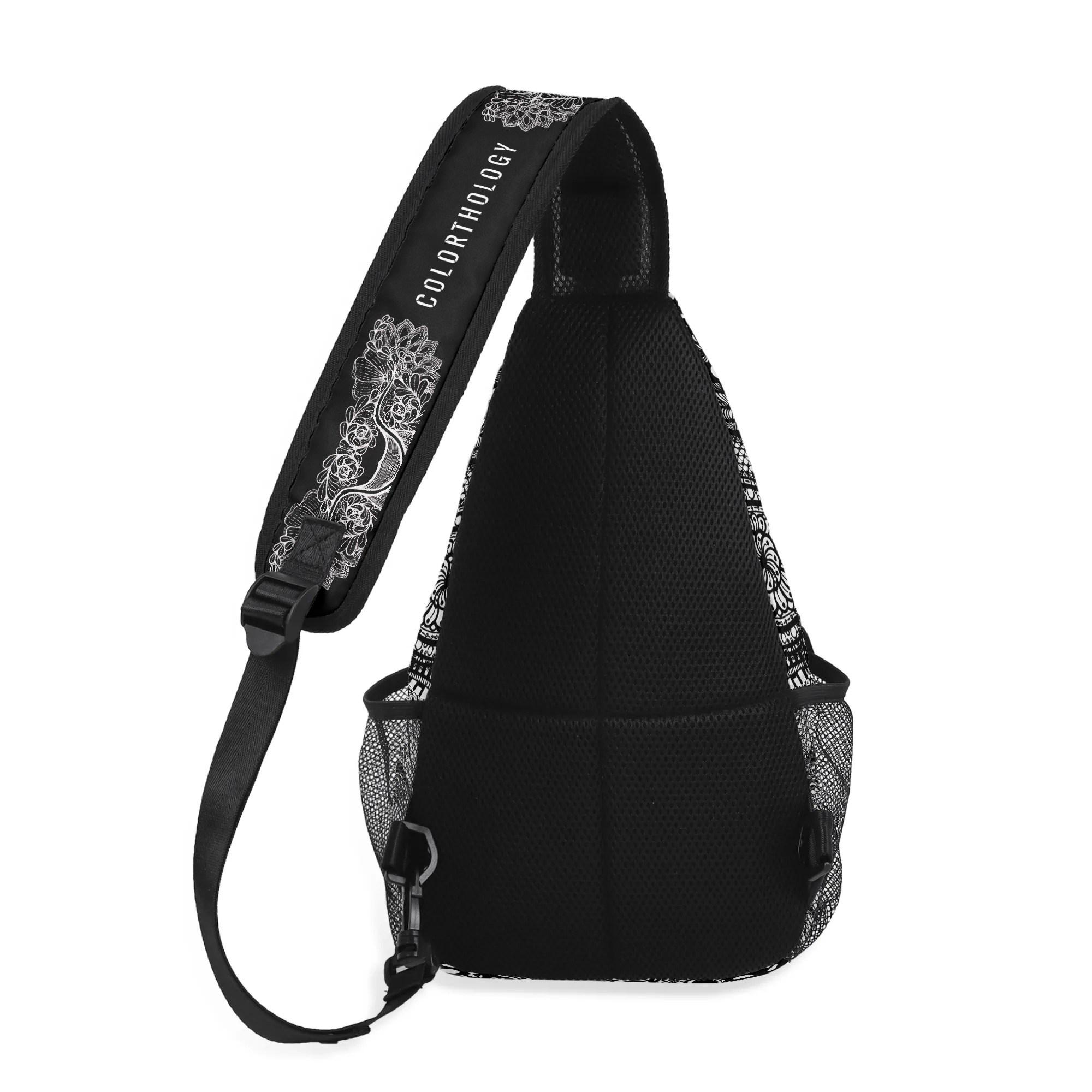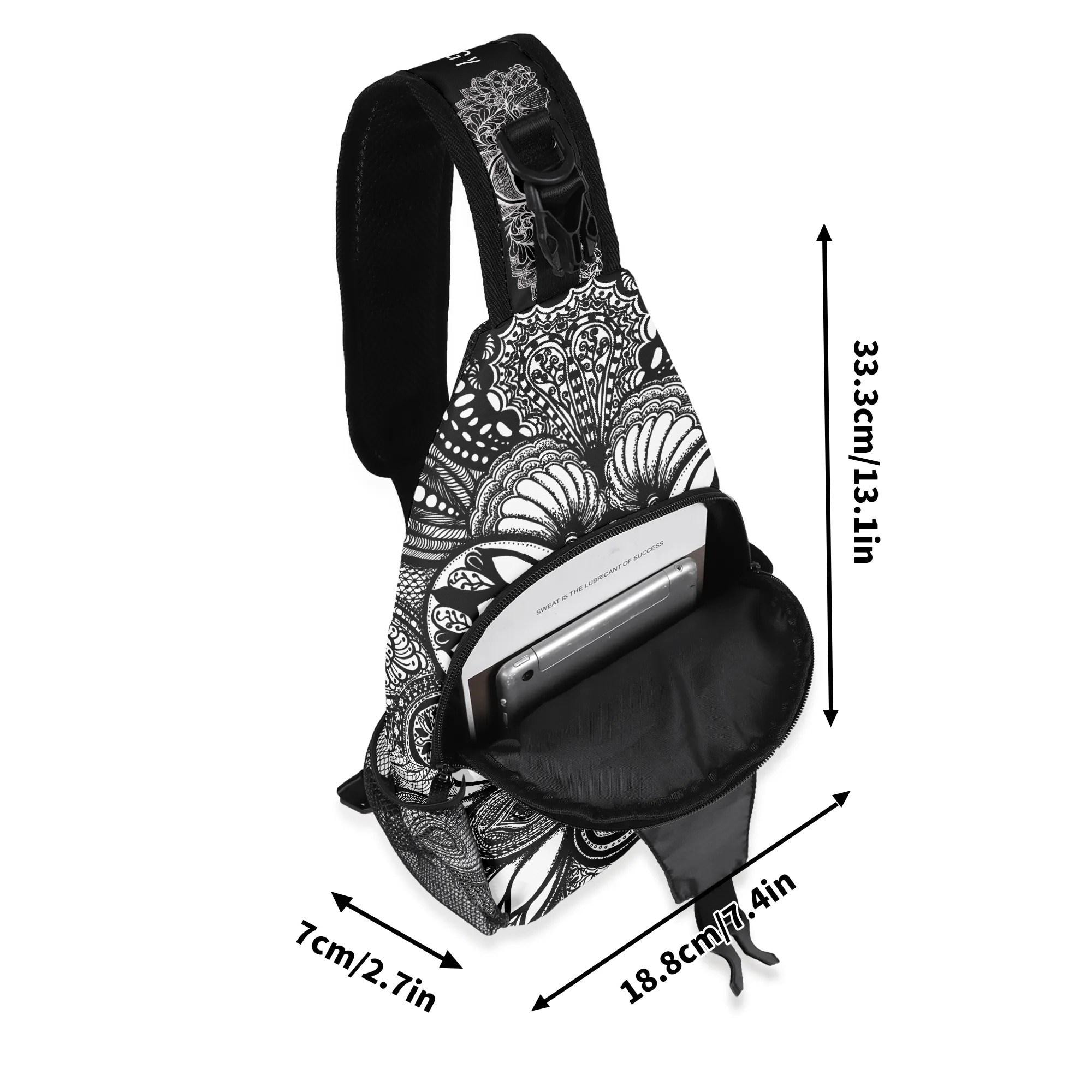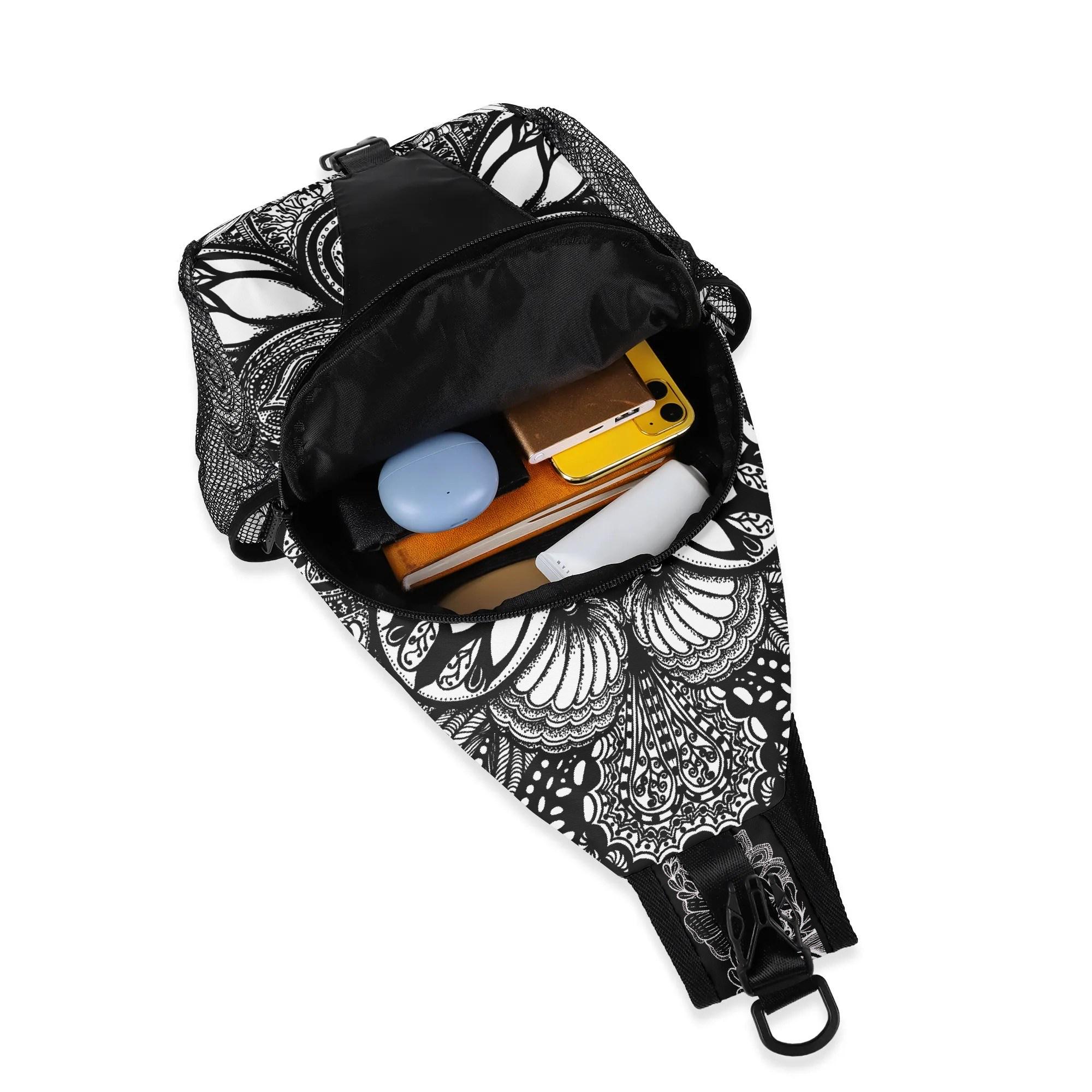 Our Georgia Crossbody Sling Bag has a surreal black and white floral design. Whether you're going for a leisurely walk, hitting the gym, or exploring a new city, this versatile sling bag is the perfect companion. This small backpack is designed with both functionality and style in mind, featuring a main compartment and three small pockets to hold all your essentials, as well as a comfortable crossbody strap for easy carrying. Made from eco-friendly materials, this boho chic bag is a must-have for your vacation essentials and everyday carry. Let the uniqueness of our design inspire your adventures with our Georgia Chest Bag. Treat yourself today!