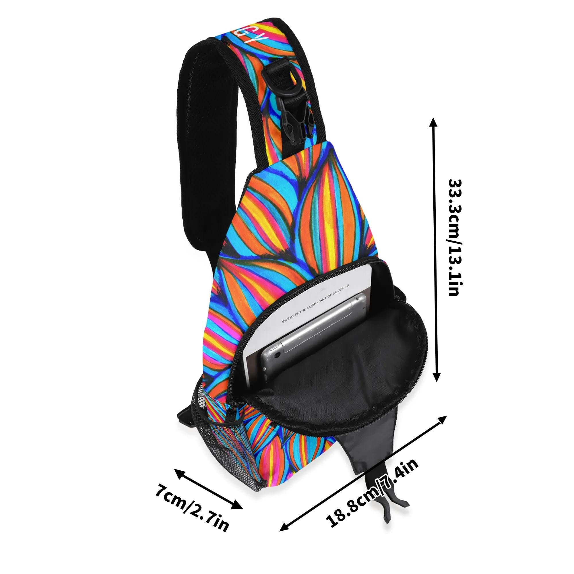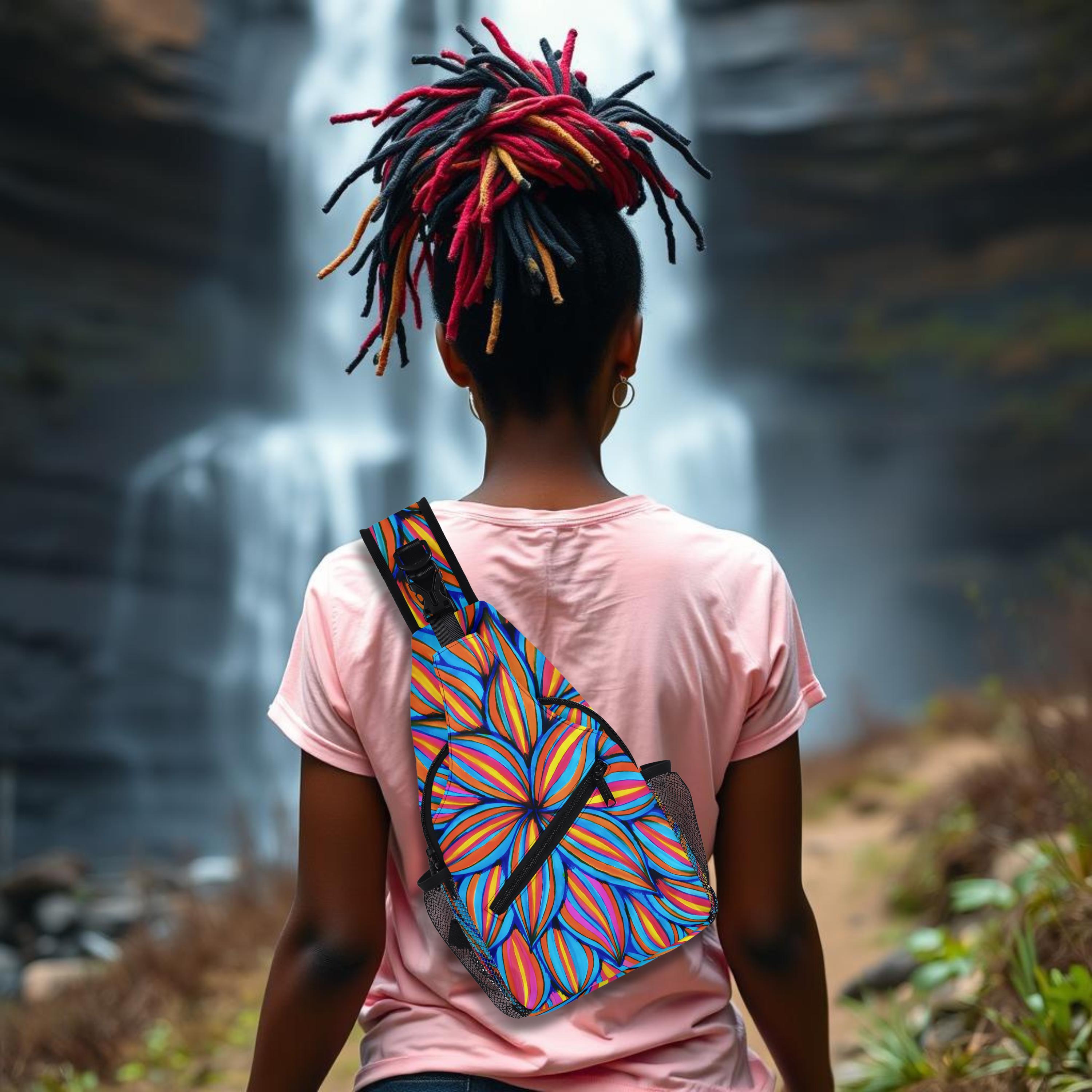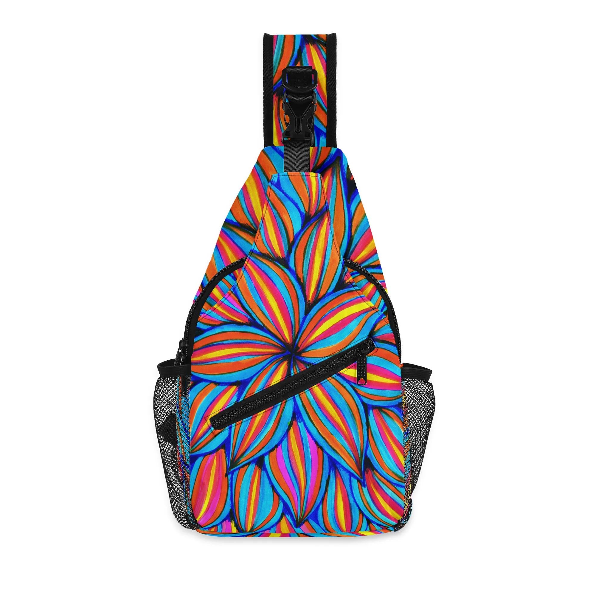 Our Radiance Crossbody Sling Bag has a surreal blue and red floral mosaic design. Whether you're going for a leisurely walk, hitting the gym, or exploring a new city, this versatile sling bag is the perfect companion. This small backpack is designed with both functionality and style in mind, featuring a main compartment and three small pockets to hold all your essentials, as well as a comfortable crossbody strap for easy carrying. Made from eco-friendly materials, this boho chic bag is a must-have for your vacation essentials and everyday carry. Let the uniqueness of our design inspire your adventures with our Radiance Chest Bag. Treat yourself today!