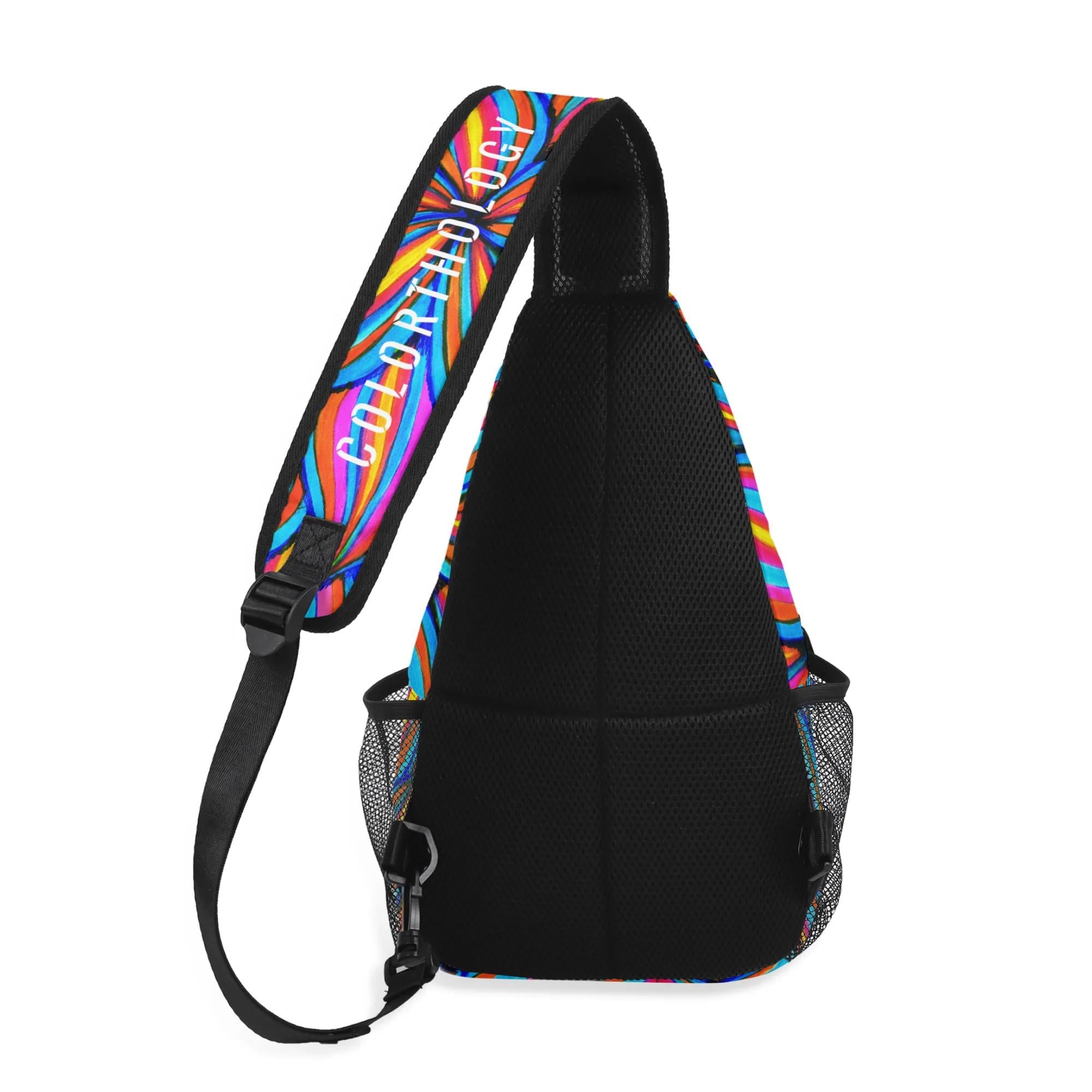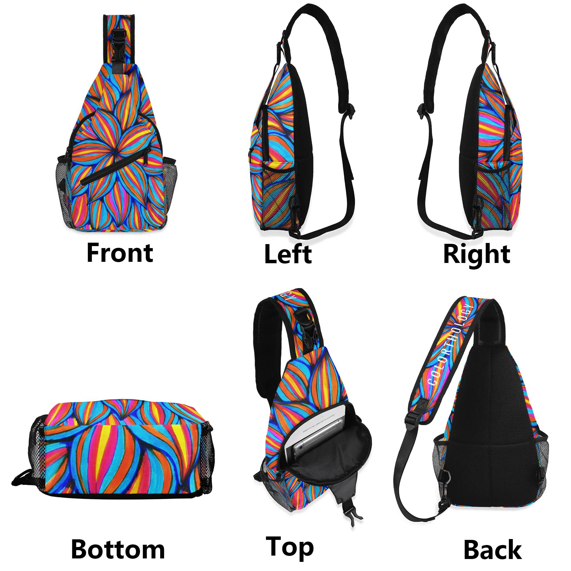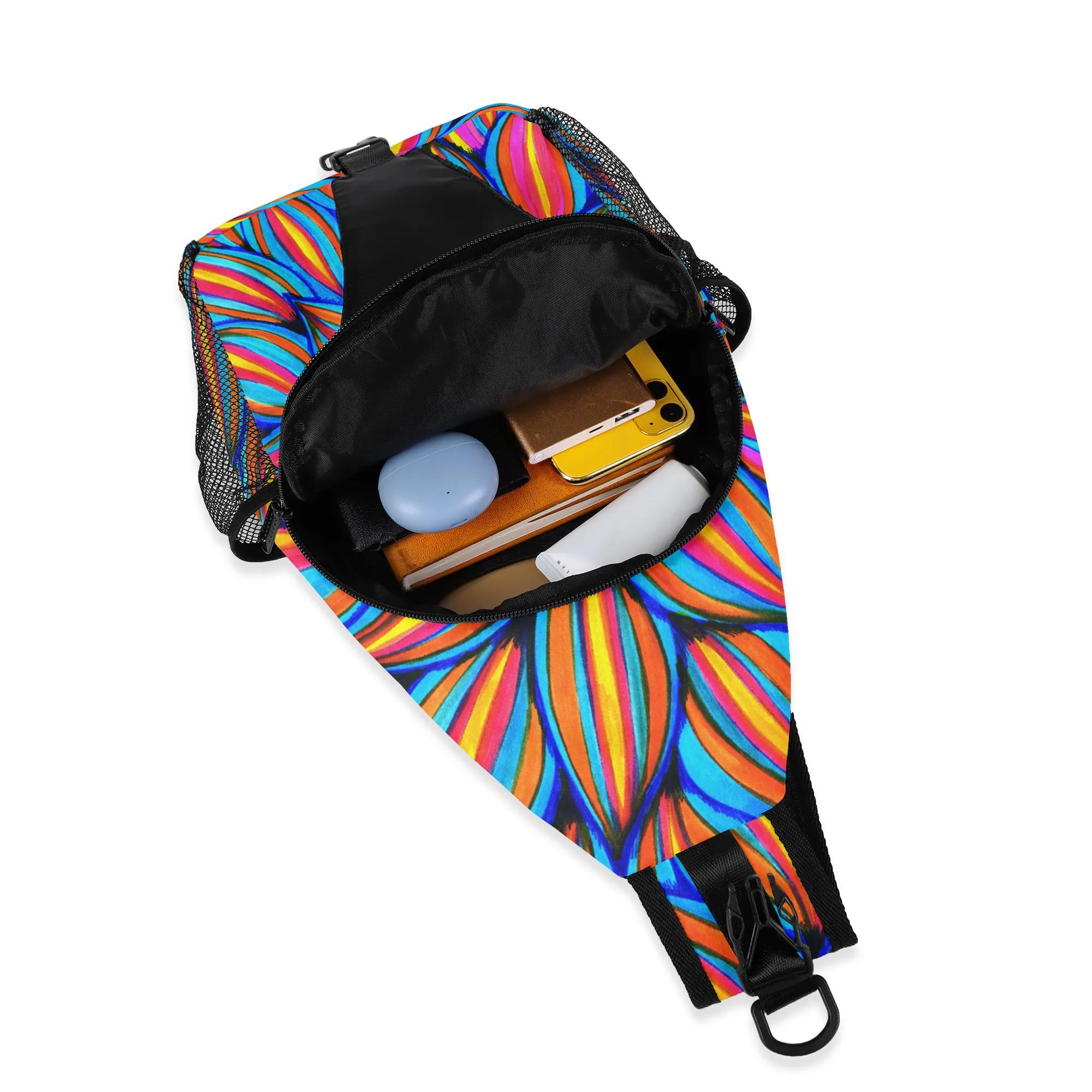 Our Radiance Crossbody Sling Bag has a surreal blue and red floral mosaic design. Whether you're going for a leisurely walk, hitting the gym, or exploring a new city, this versatile sling bag is the perfect companion. This small backpack is designed with both functionality and style in mind, featuring a main compartment and three small pockets to hold all your essentials, as well as a comfortable crossbody strap for easy carrying. Made from eco-friendly materials, this boho chic bag is a must-have for your vacation essentials and everyday carry. Let the uniqueness of our design inspire your adventures with our Radiance Chest Bag. Treat yourself today!