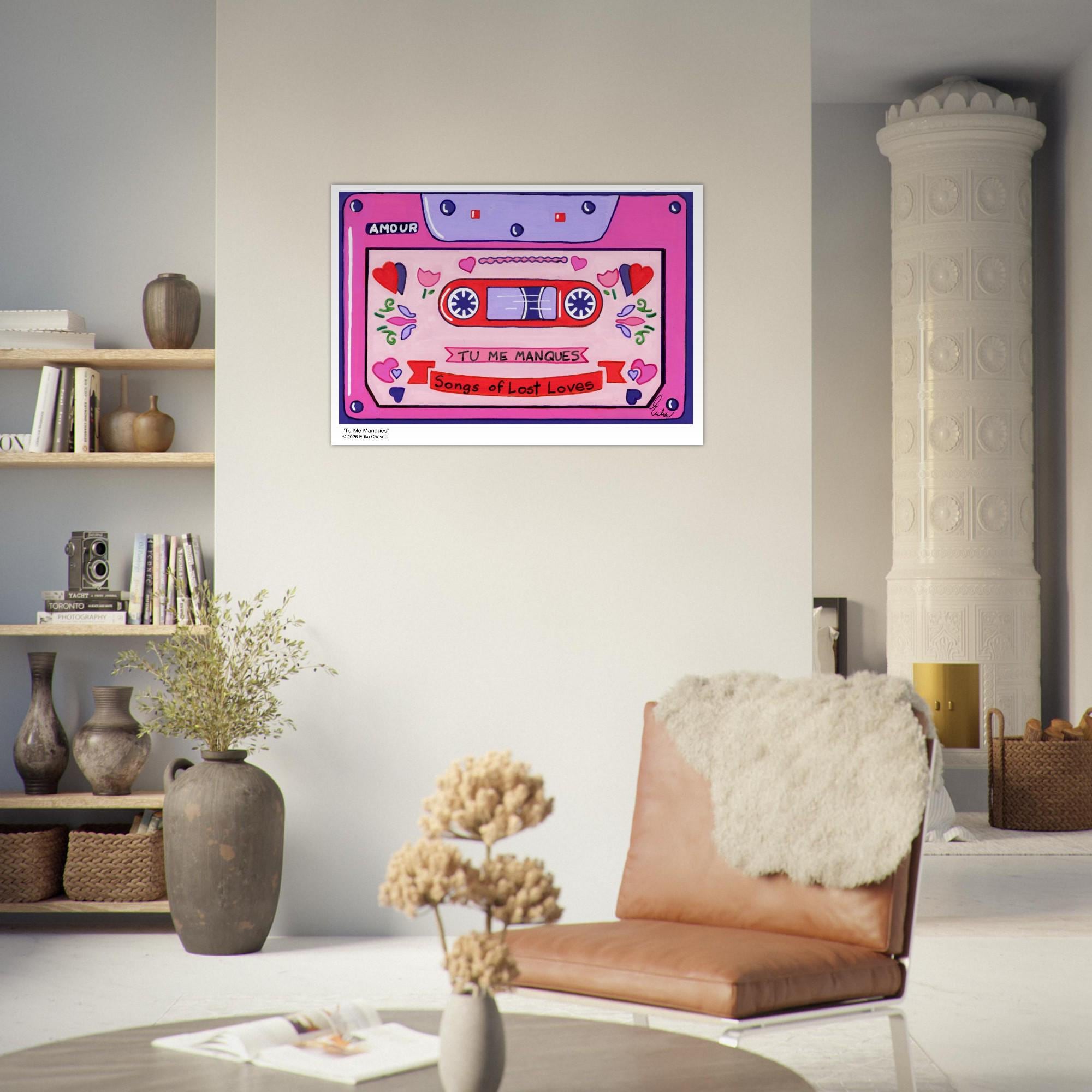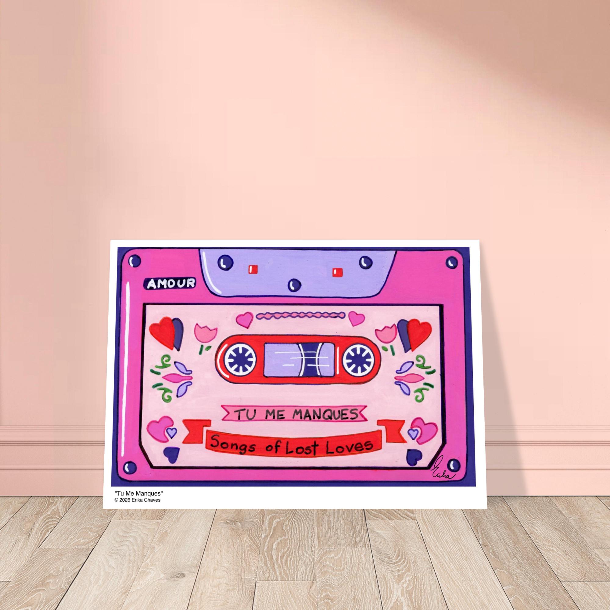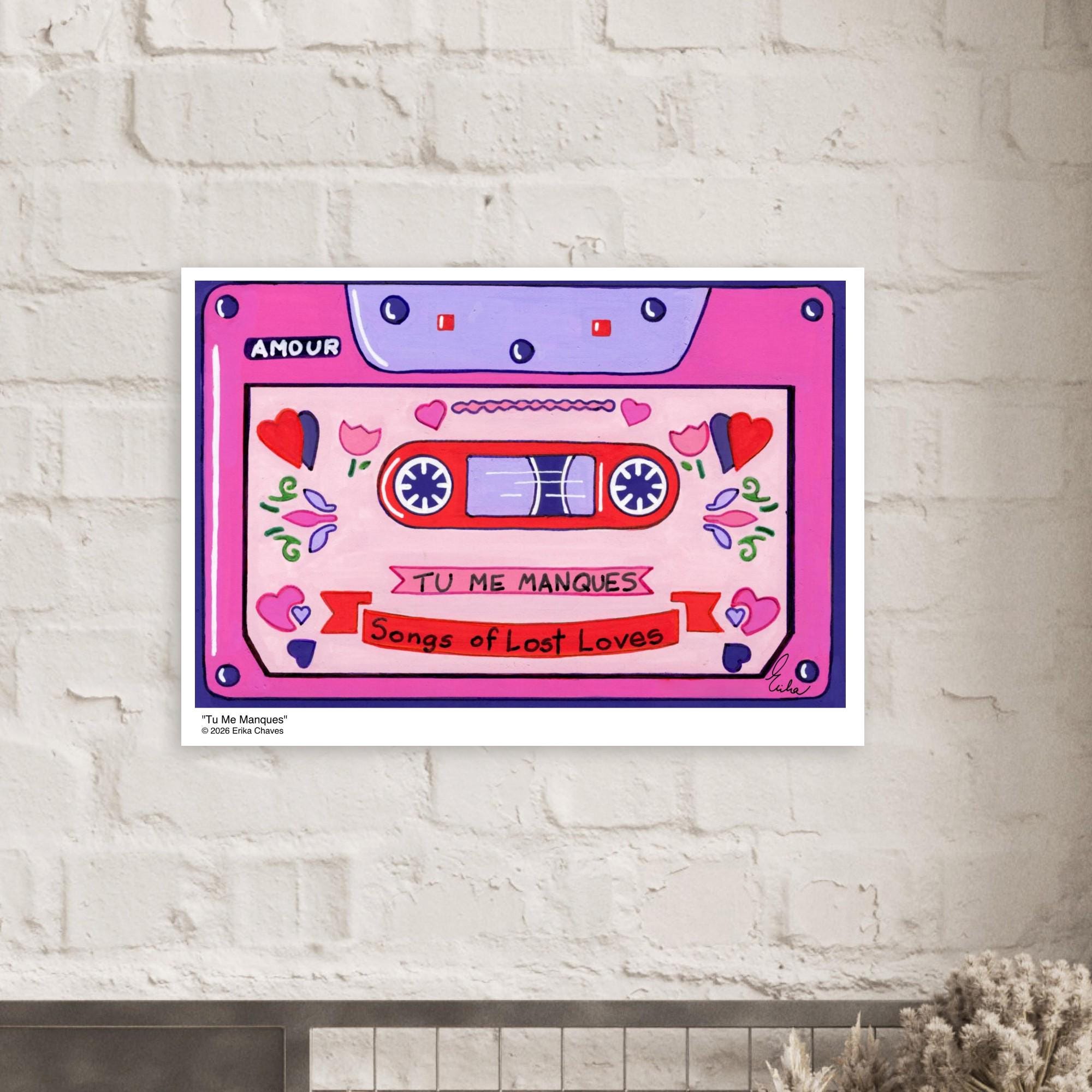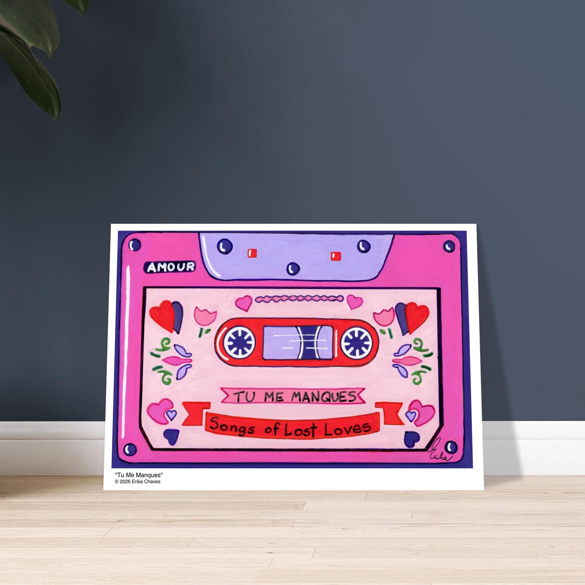 This Retro Cassette Tape art print is a representation of the retro Cassette Tape artwork “Tu Me Manques” by artist and Colorthology owner Erika Chaves. Created from imagination, emotion, and layered pattern work, this piece blends florals, intricate motifs, and a whimsical sense of character to create a joyful, eye‑catching centerpiece for any room.