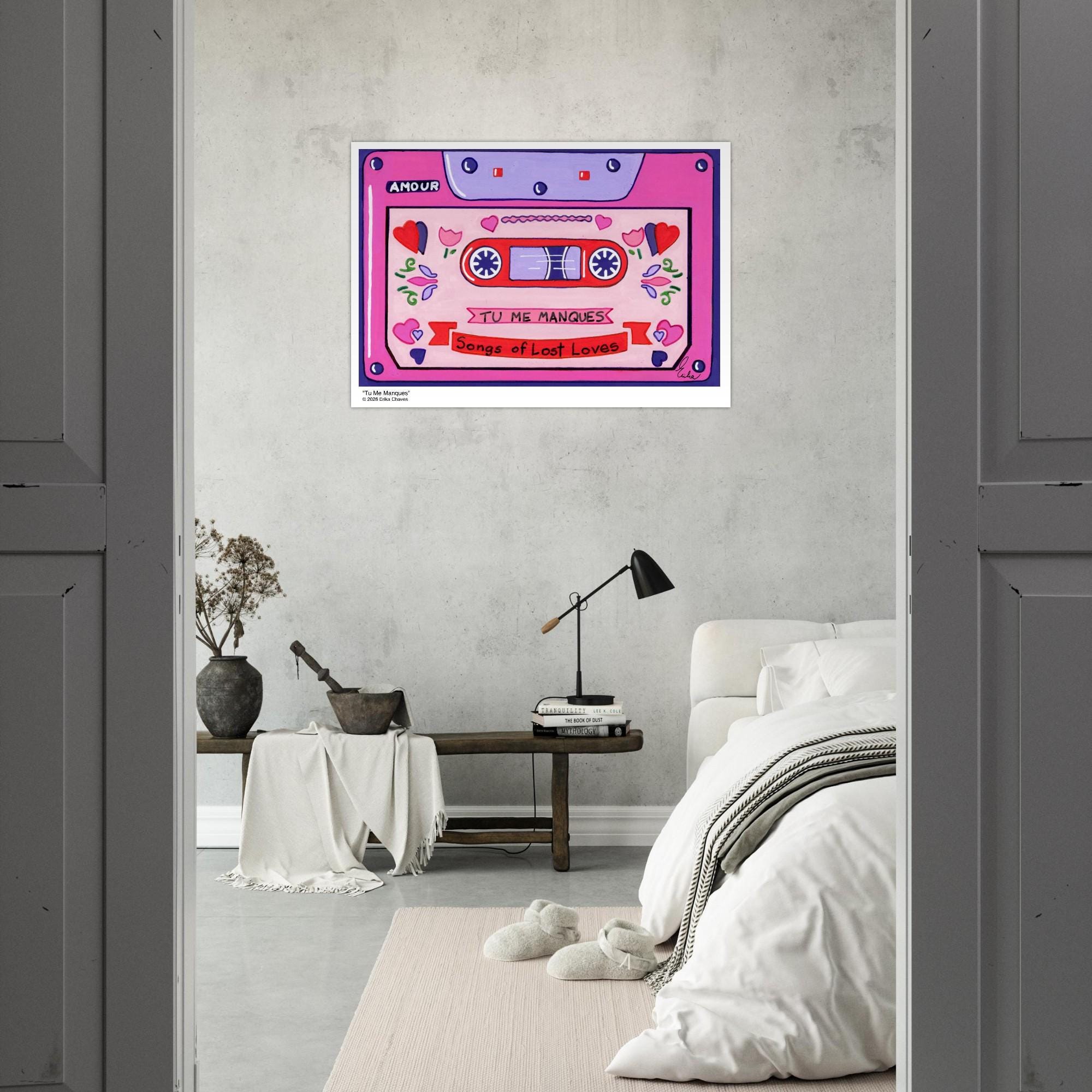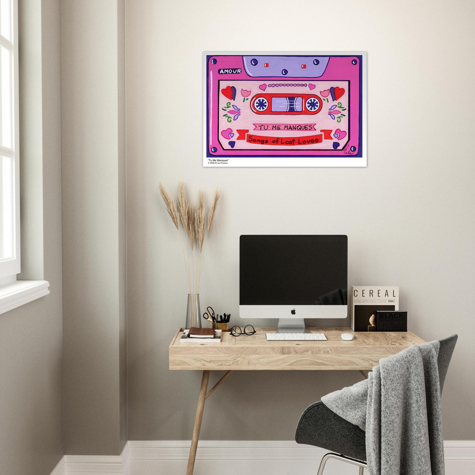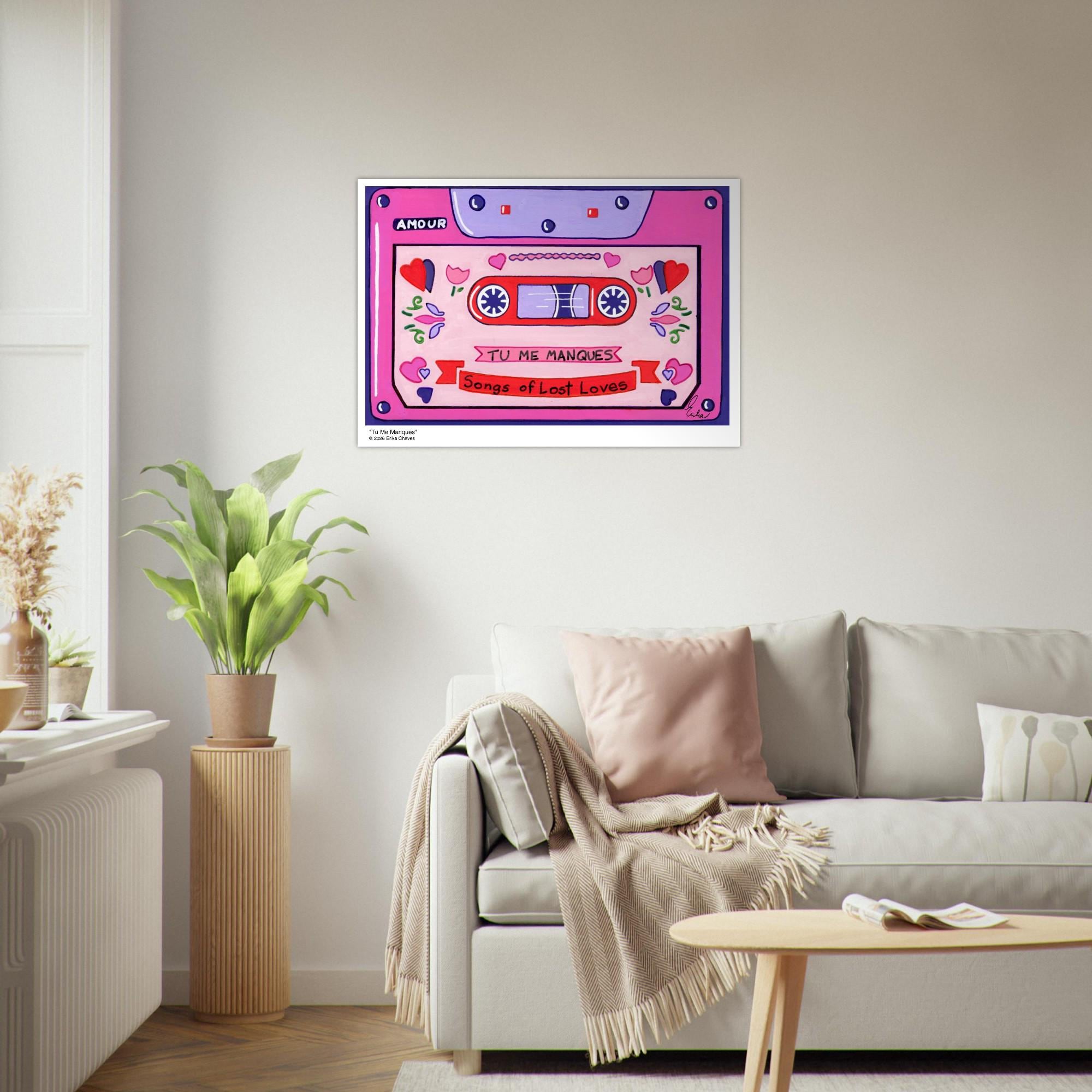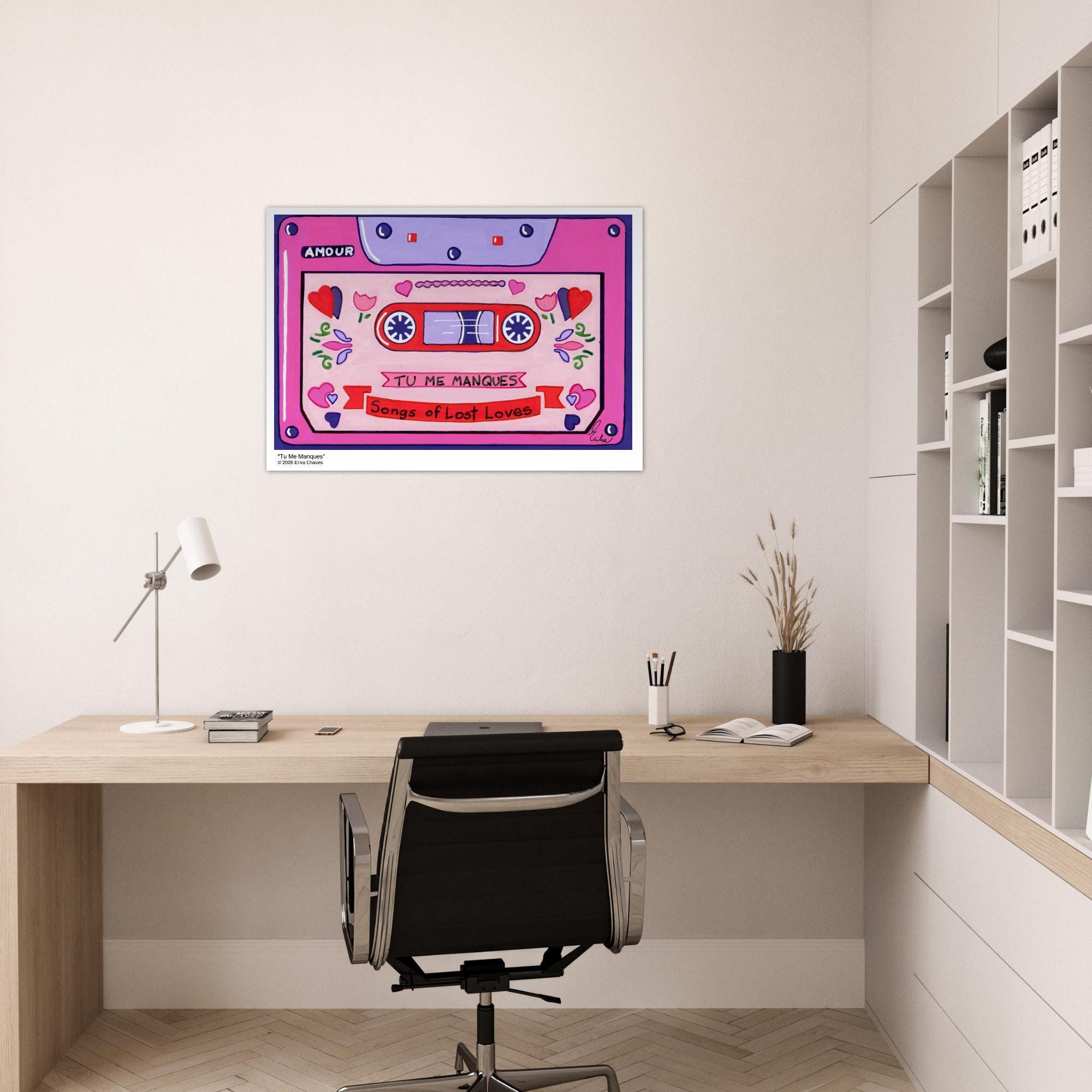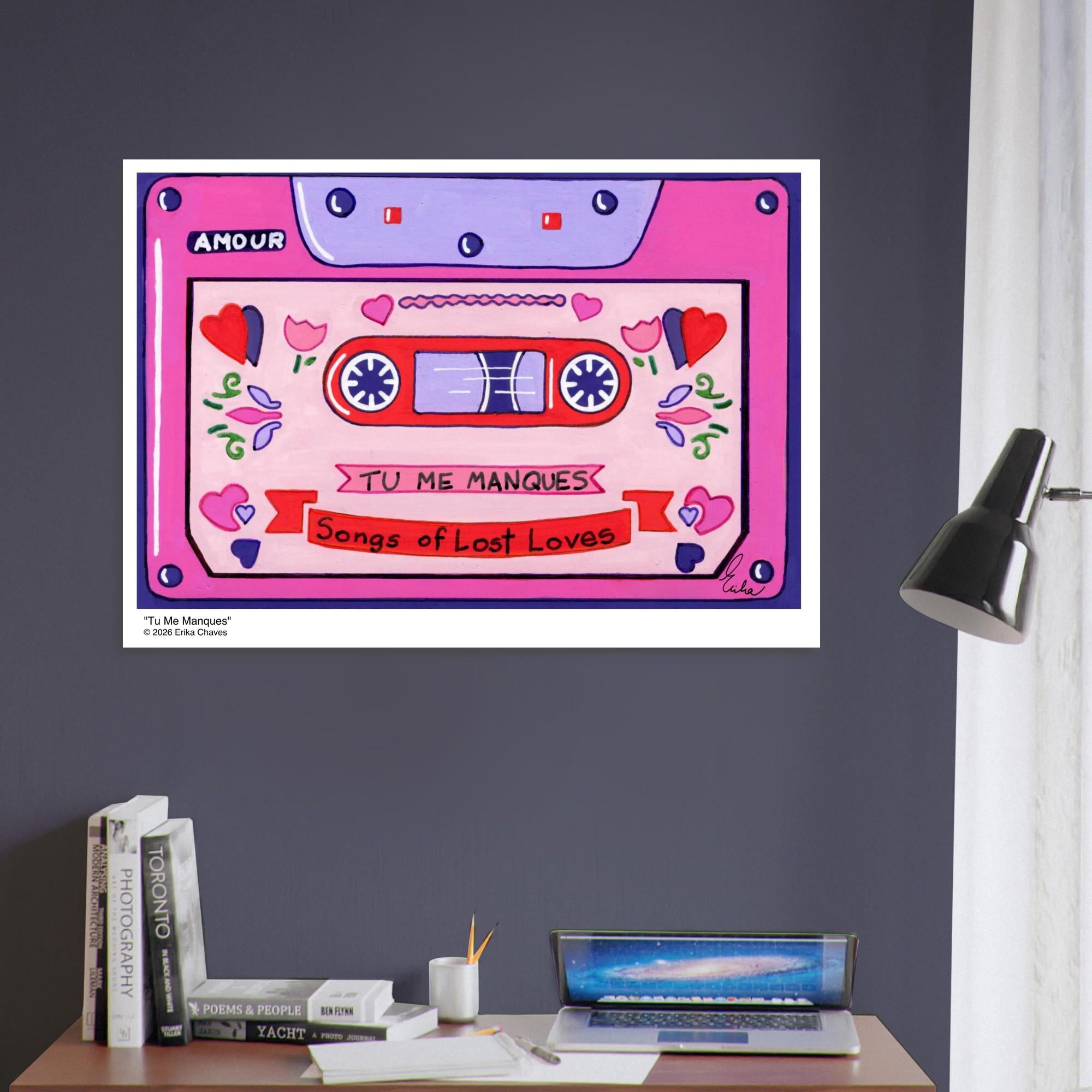This Retro Cassette Tape art print is a representation of the retro Cassette Tape artwork “Tu Me Manques” by artist and Colorthology owner Erika Chaves. Created from imagination, emotion, and layered pattern work, this piece blends florals, intricate motifs, and a whimsical sense of character to create a joyful, eye‑catching centerpiece for any room.