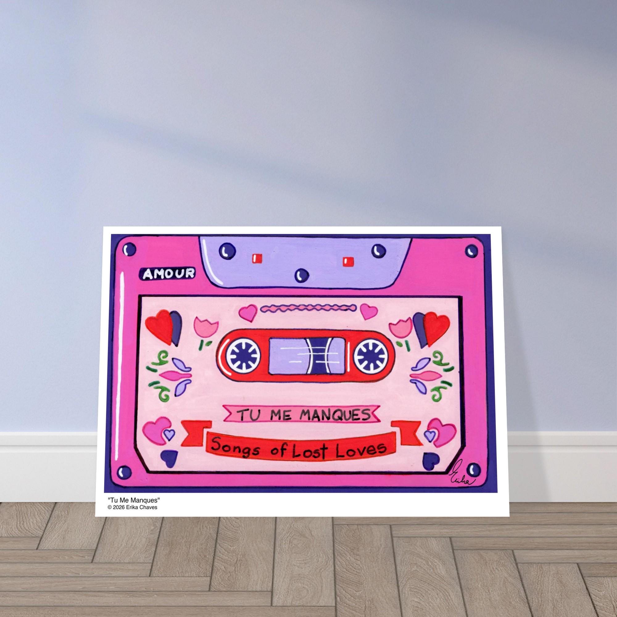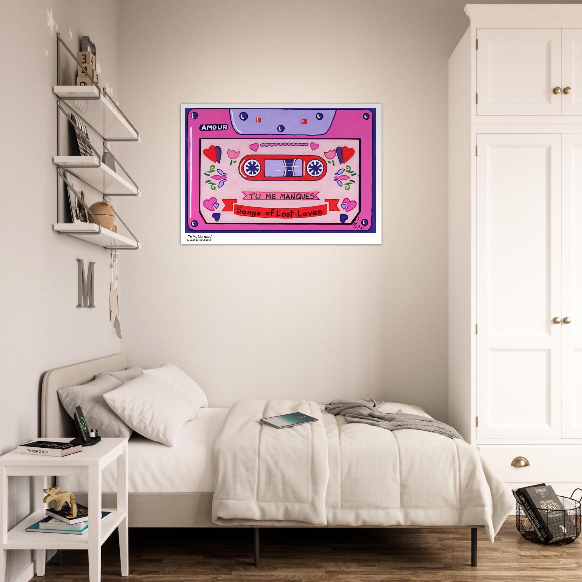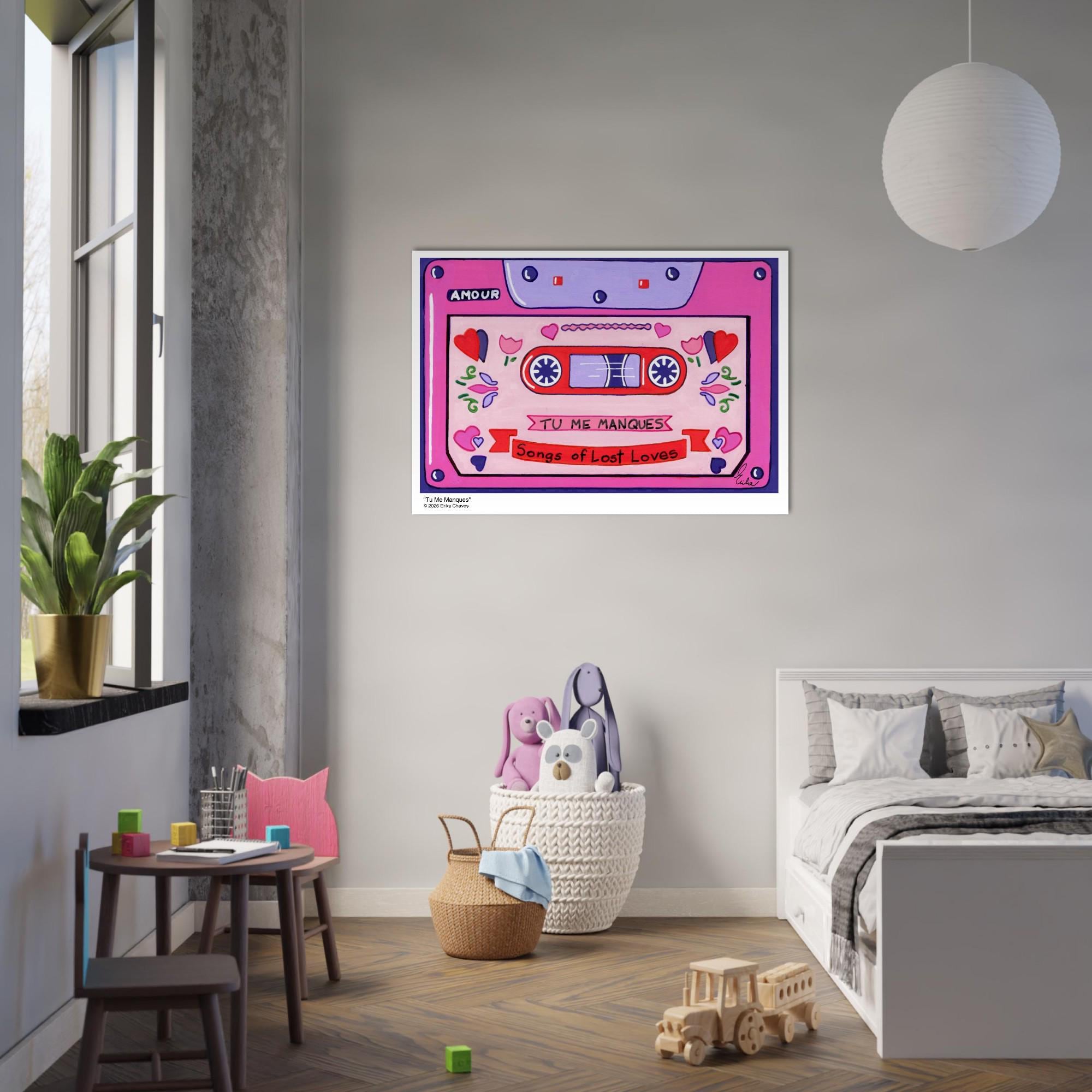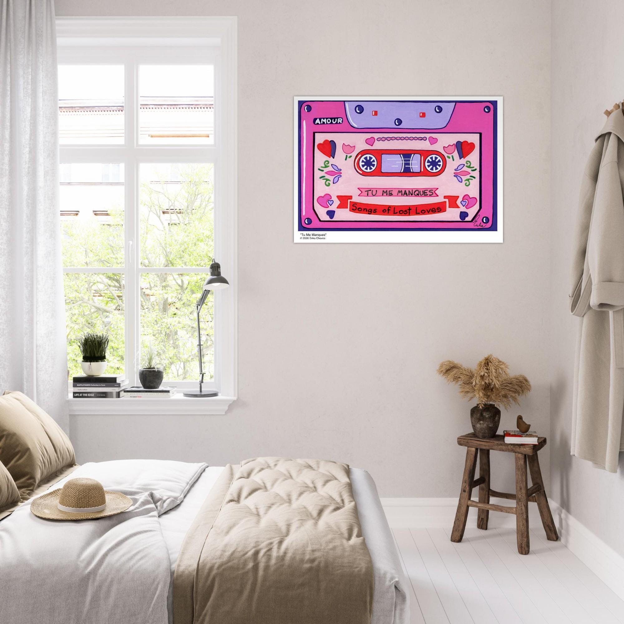 This Retro Cassette Tape art print is a representation of the retro Cassette Tape artwork “Tu Me Manques” by artist and Colorthology owner Erika Chaves. Created from imagination, emotion, and layered pattern work, this piece blends florals, intricate motifs, and a whimsical sense of character to create a joyful, eye‑catching centerpiece for any room.