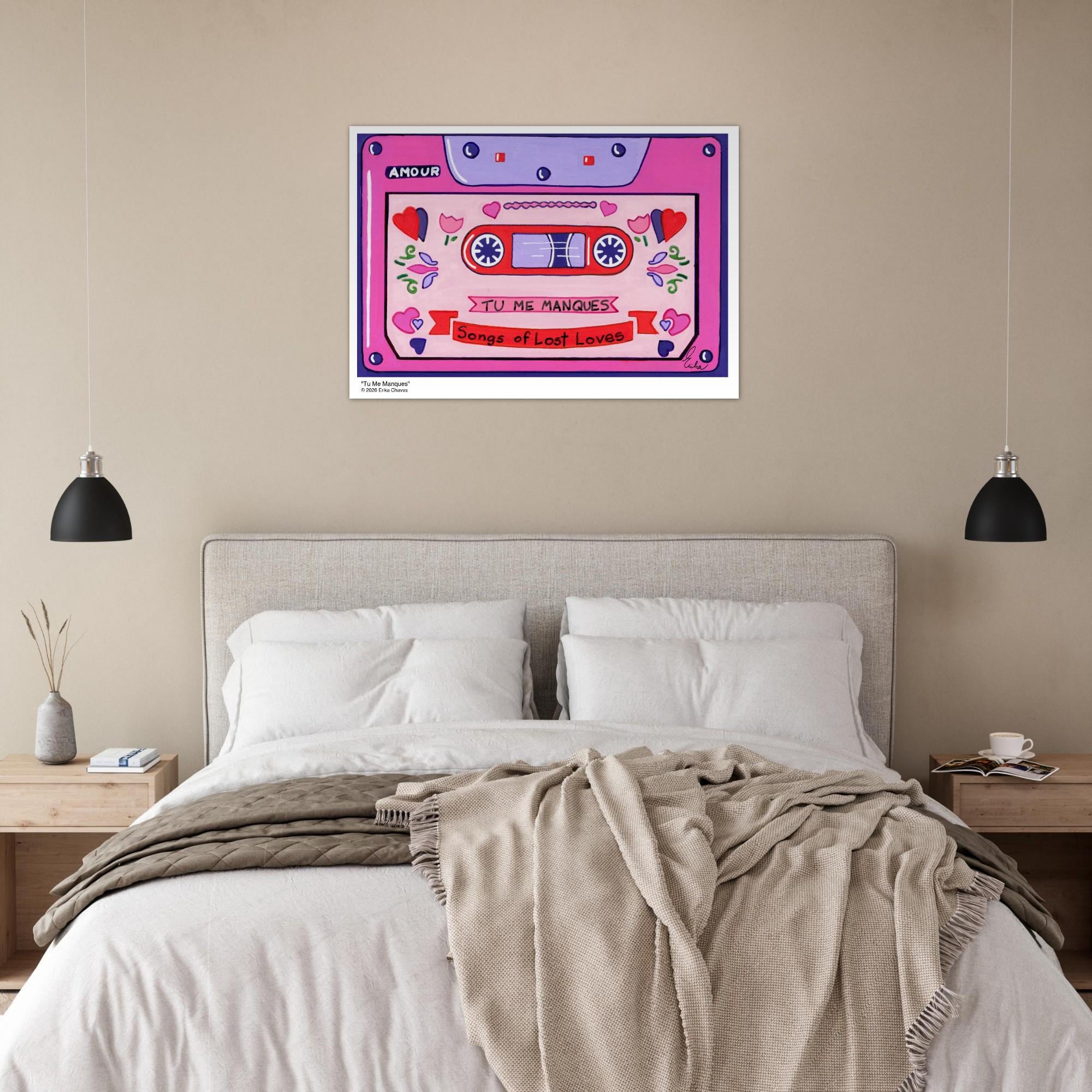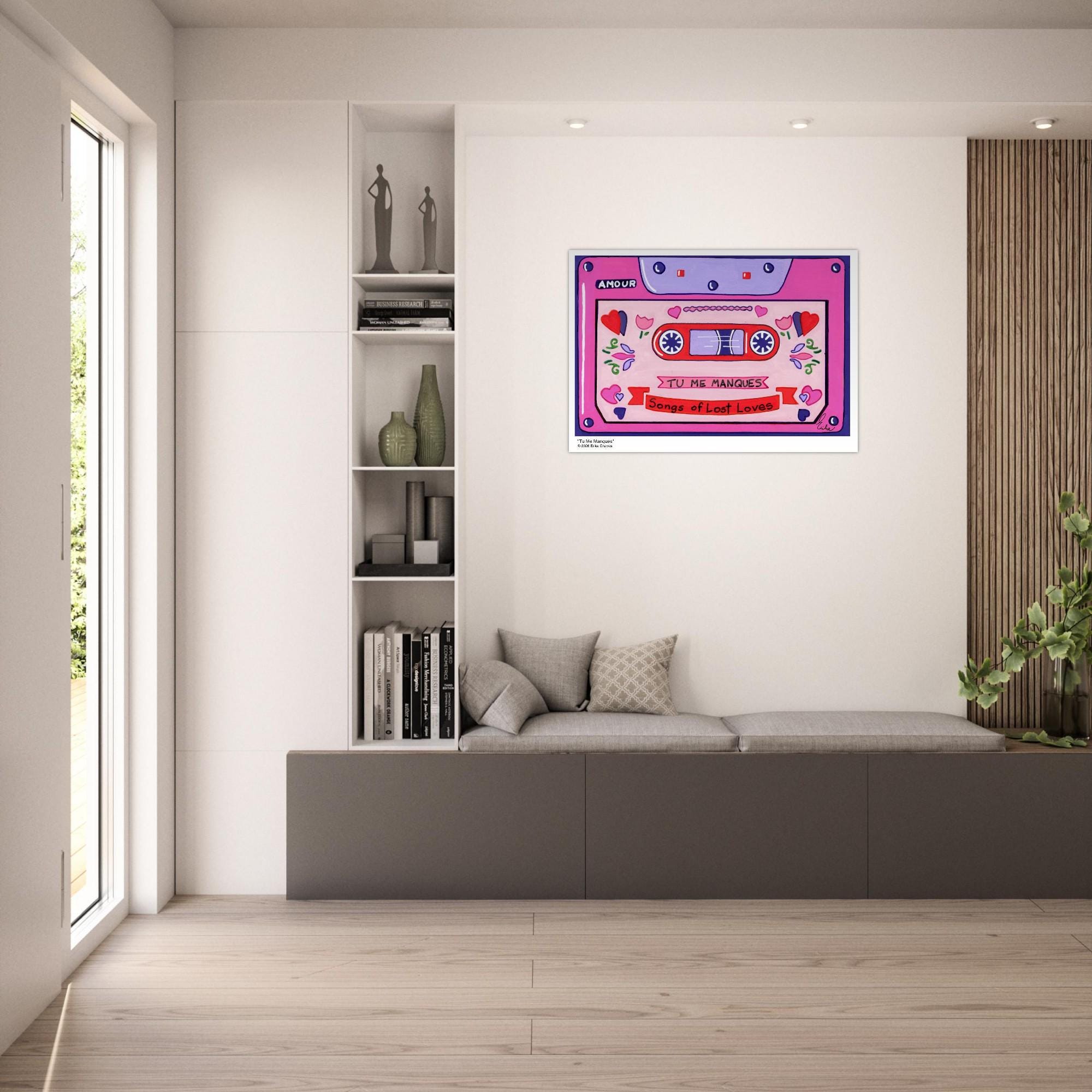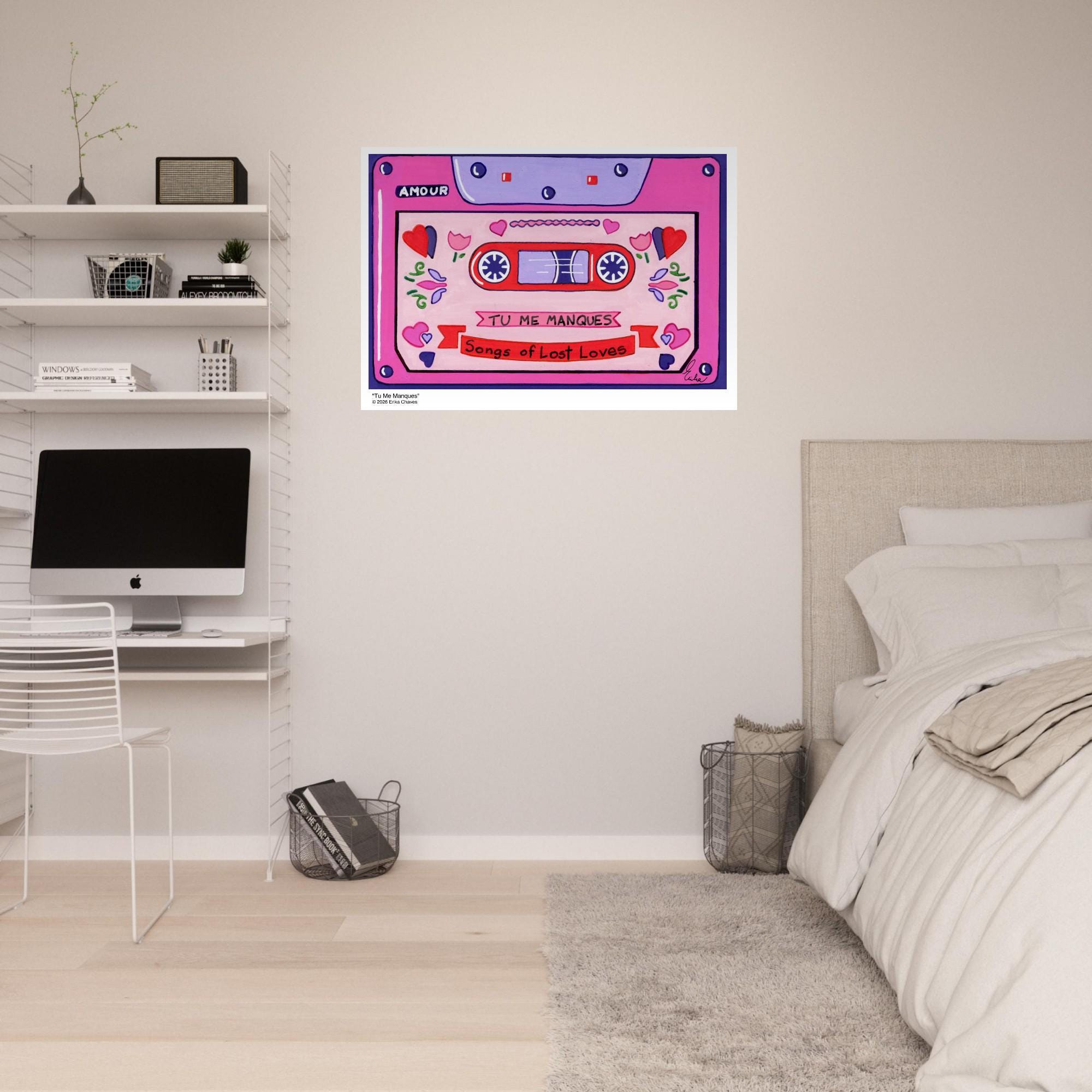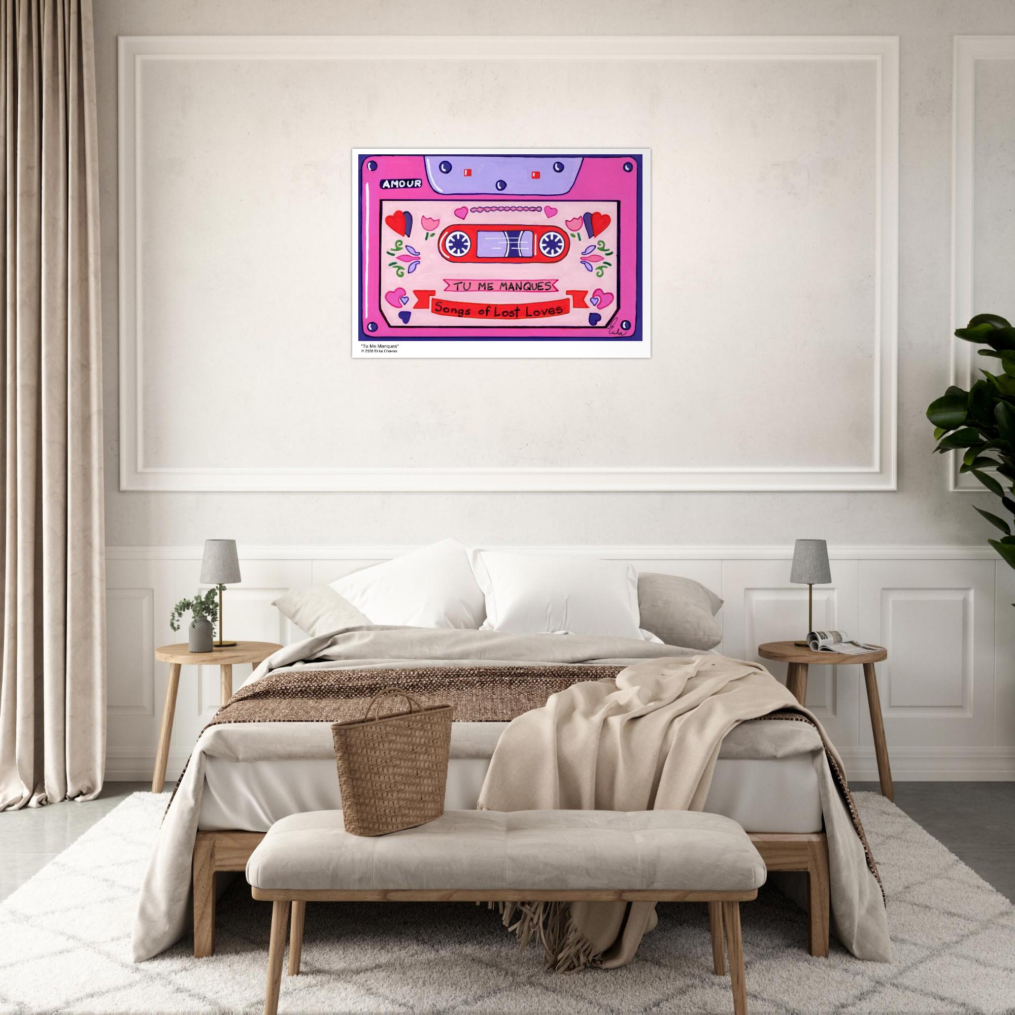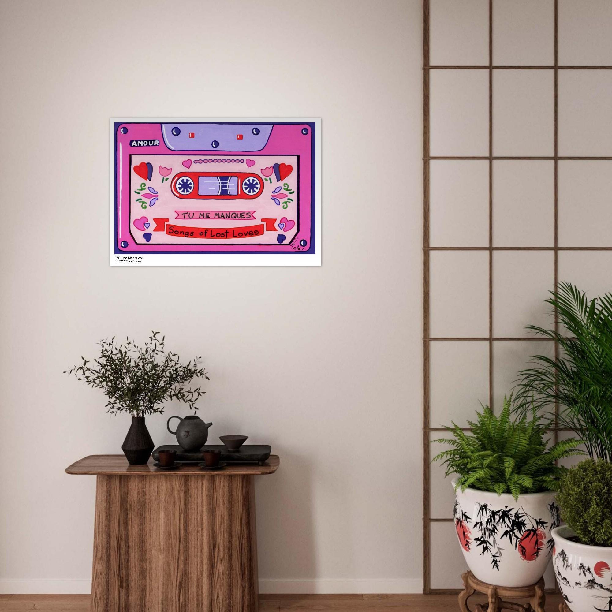 This Retro Cassette Tape art print is a representation of the retro Cassette Tape artwork “Tu Me Manques” by artist and Colorthology owner Erika Chaves. Created from imagination, emotion, and layered pattern work, this piece blends florals, intricate motifs, and a whimsical sense of character to create a joyful, eye‑catching centerpiece for any room.