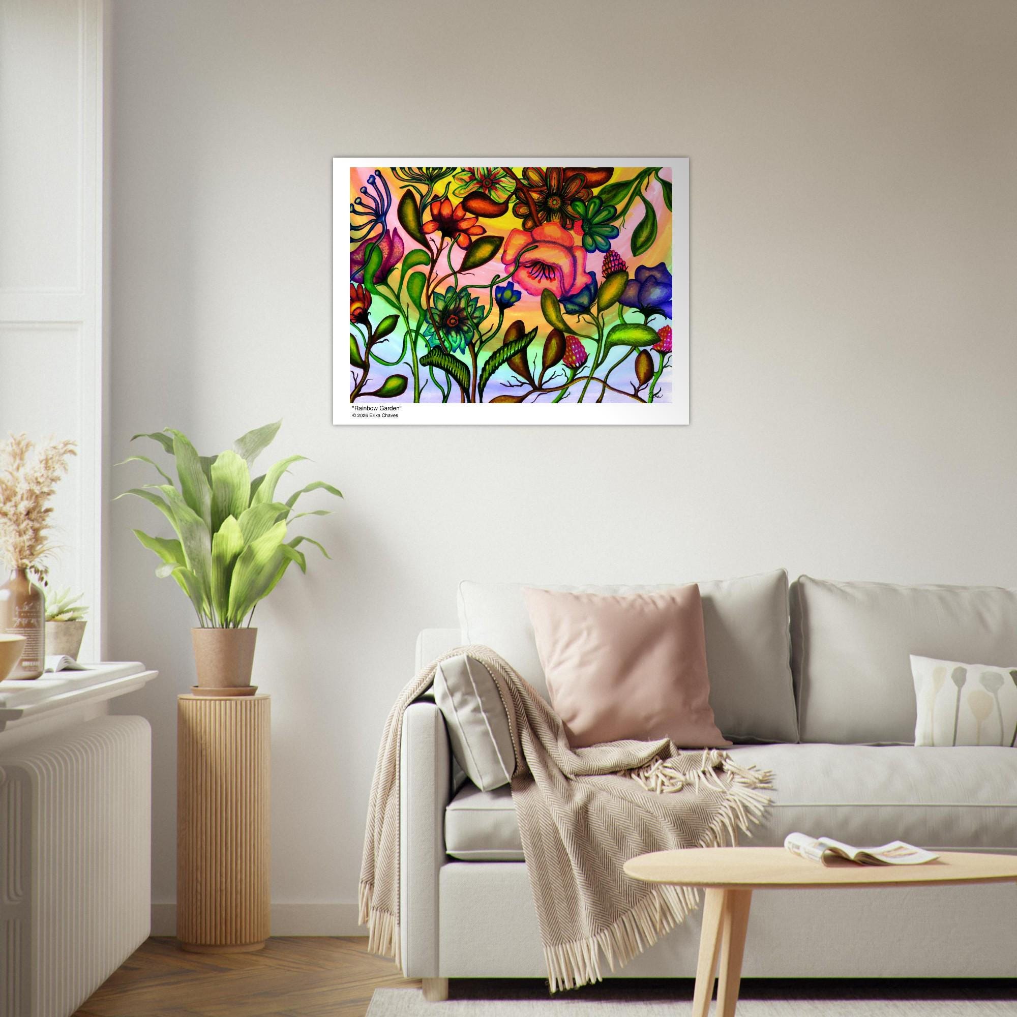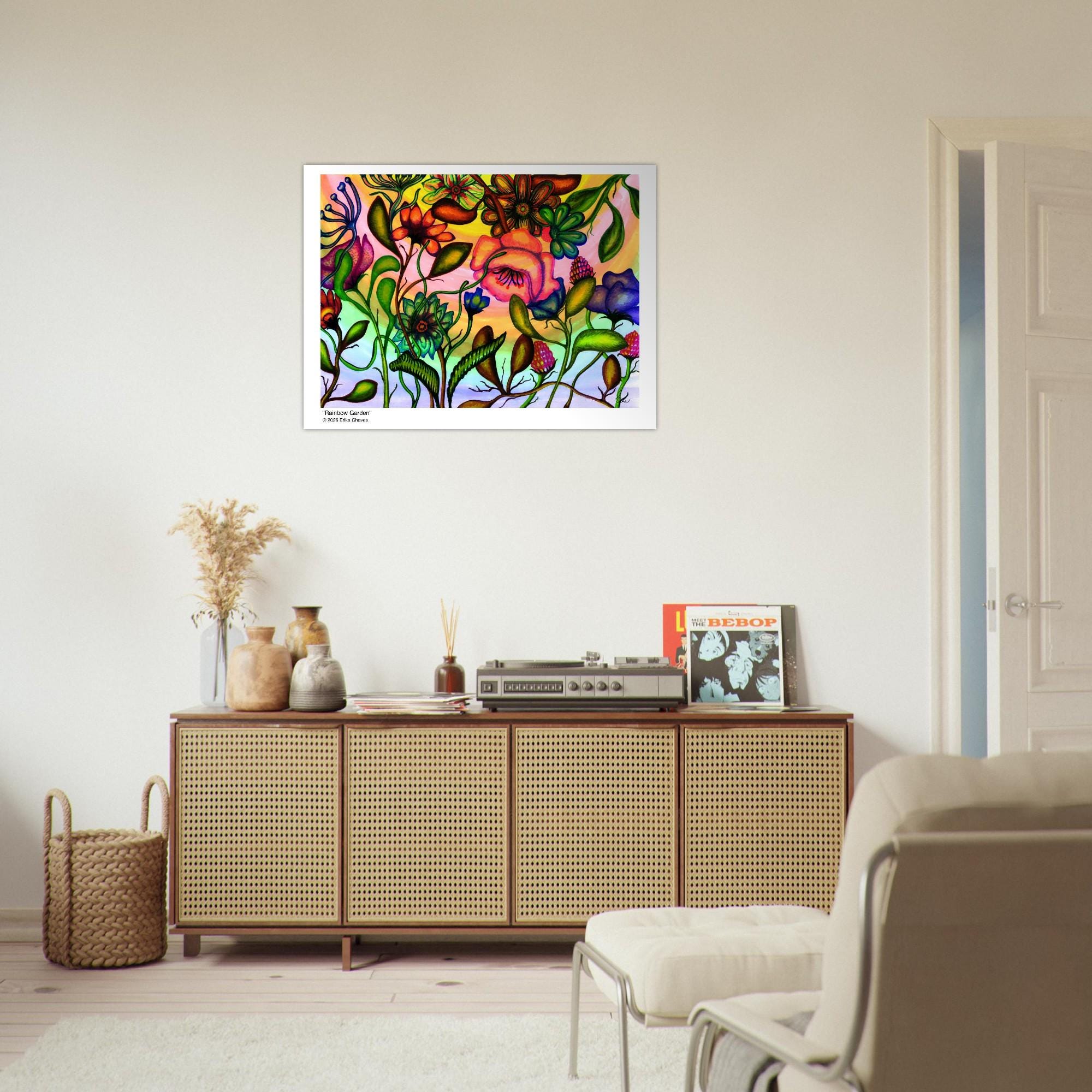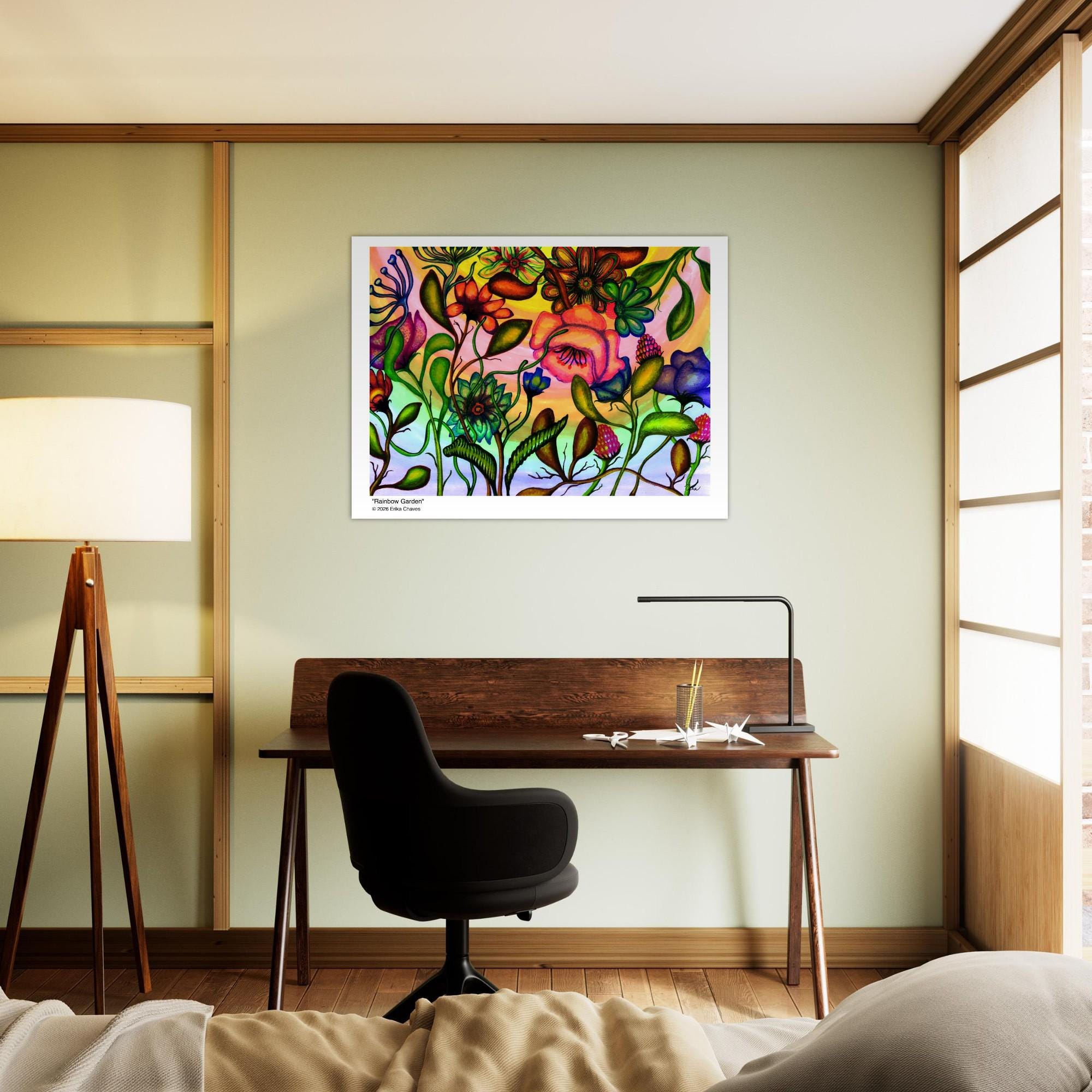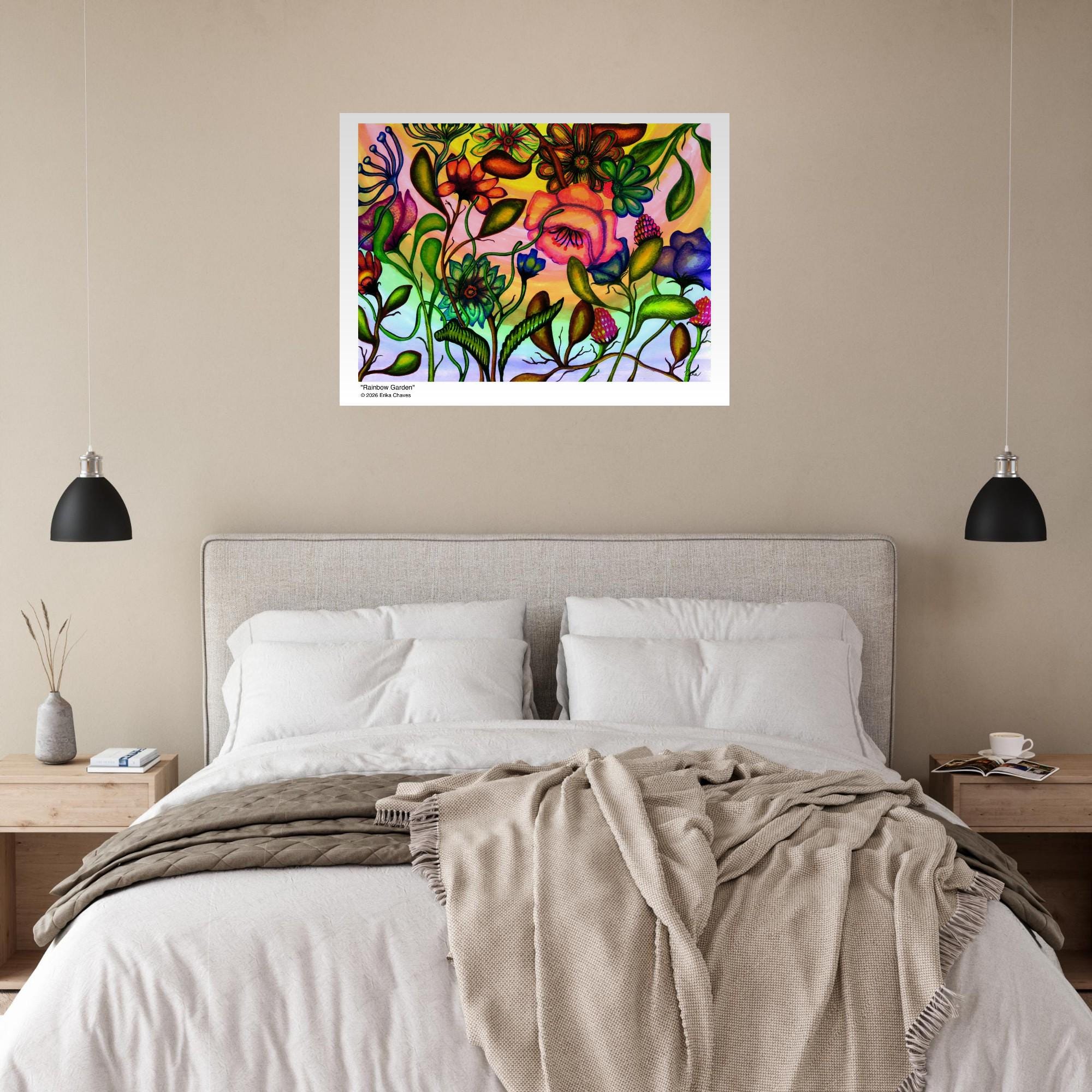 This floral art print is an eclectic wall art poster featuring the colorful patterned artwork “Rainbow Garden” by artist and Colorthology owner Erika Chaves. Created from imagination, emotion, and layered pattern work, this piece blends bold florals, intricate motifs, and a whimsical sense of character to create a joyful, eye‑catching centerpiece for any room.