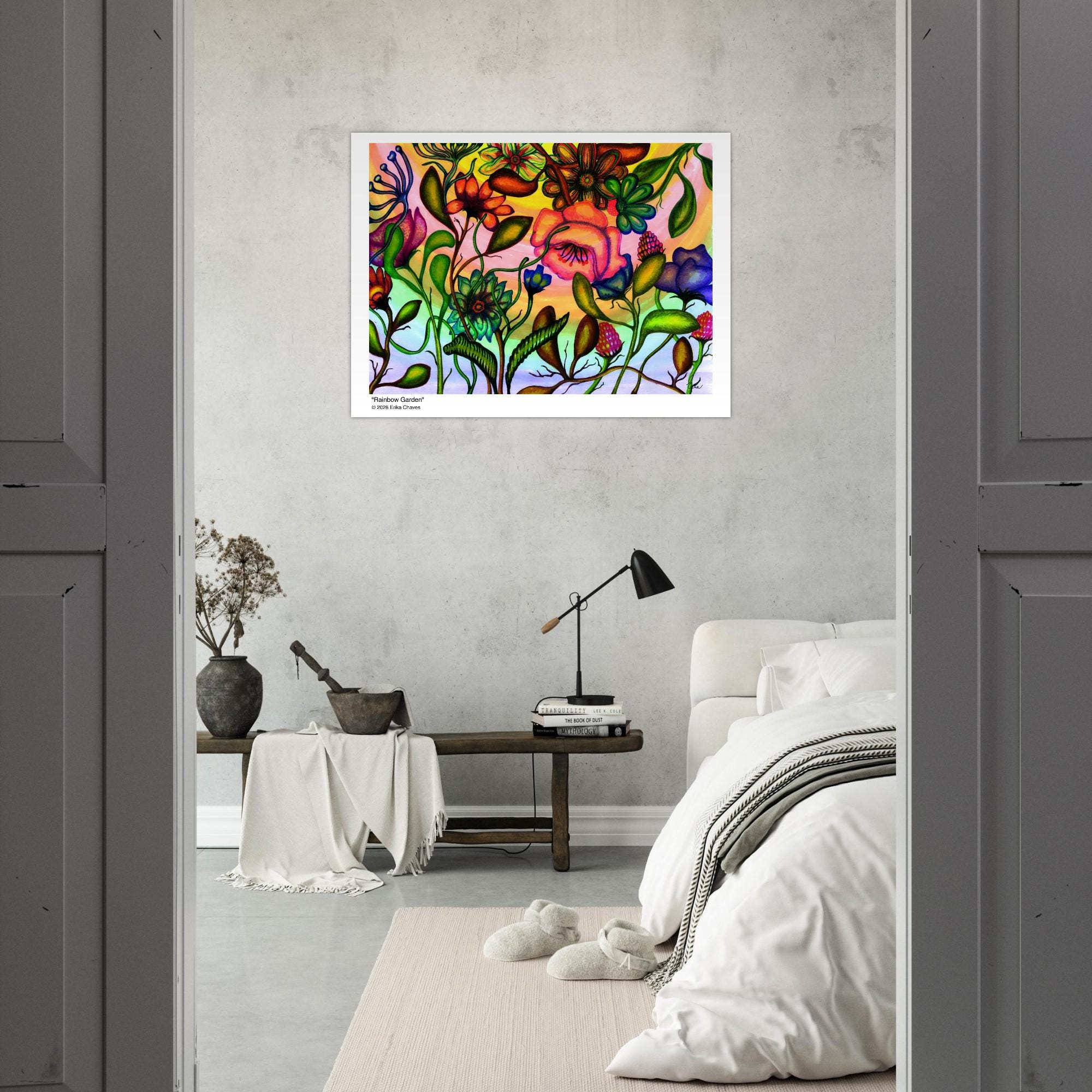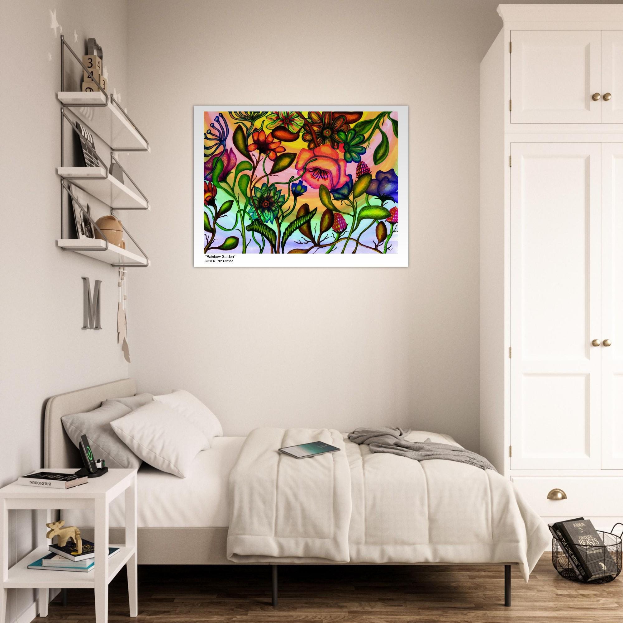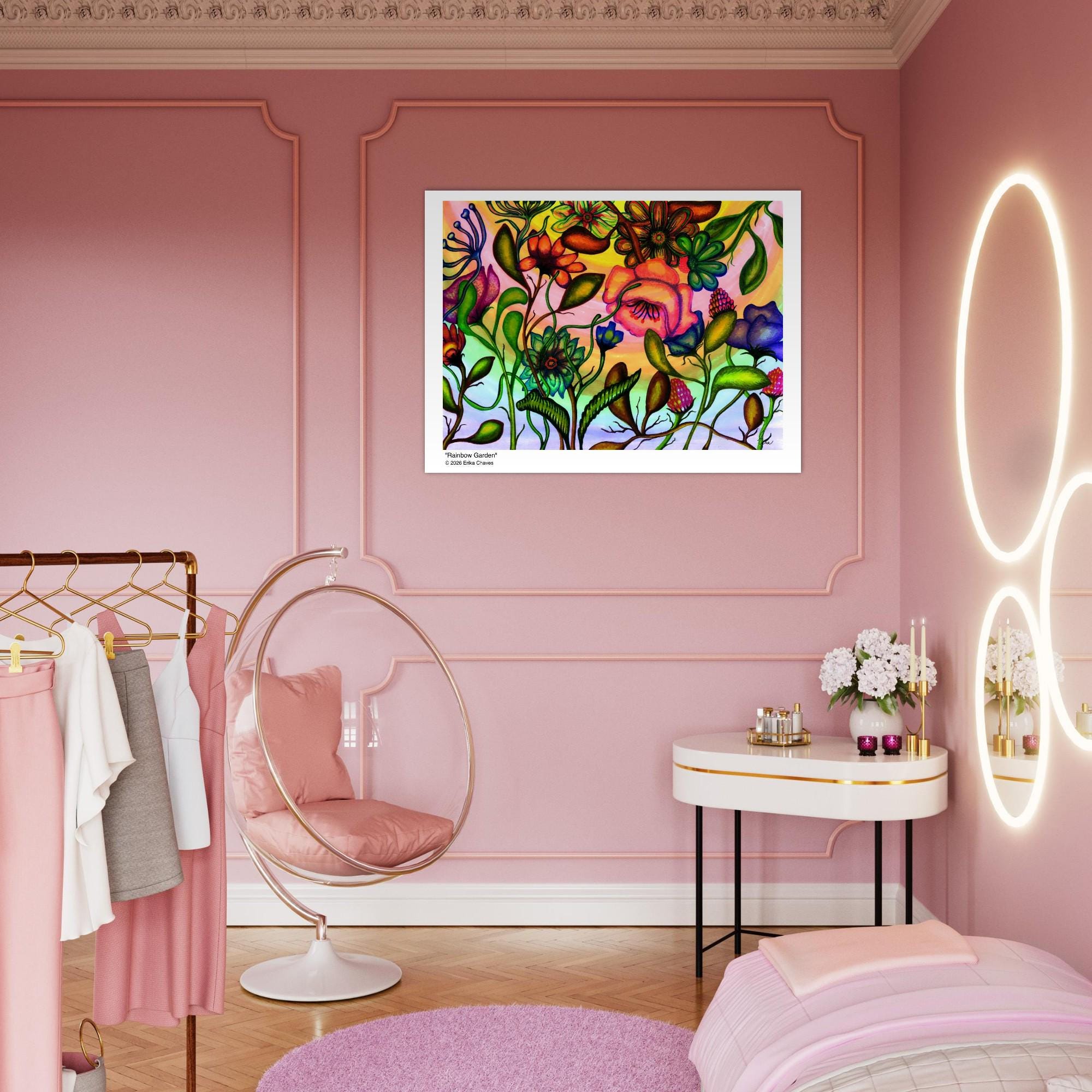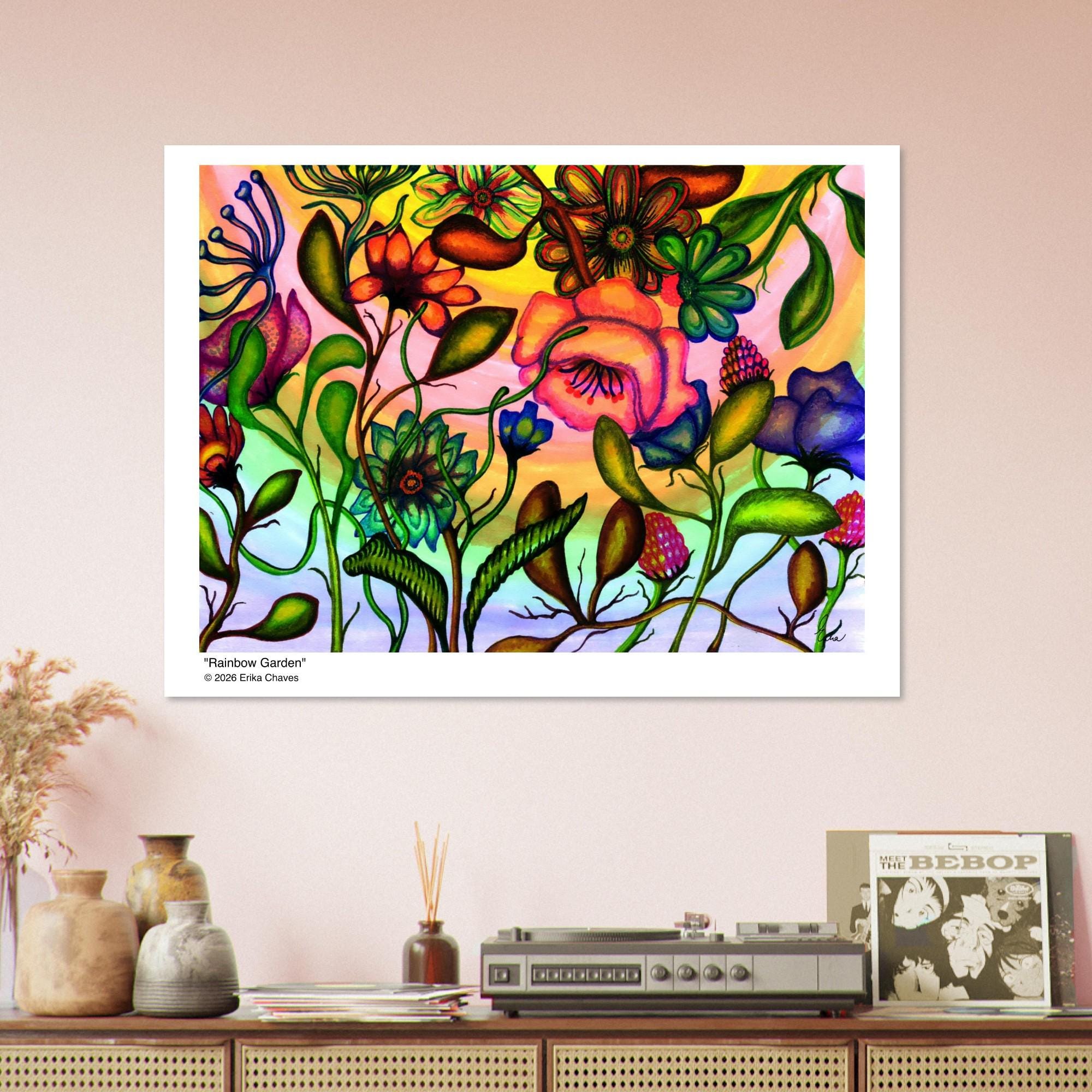 This floral art print is an eclectic wall art poster featuring the colorful patterned artwork “Rainbow Garden” by artist and Colorthology owner Erika Chaves. Created from imagination, emotion, and layered pattern work, this piece blends bold florals, intricate motifs, and a whimsical sense of character to create a joyful, eye‑catching centerpiece for any room.