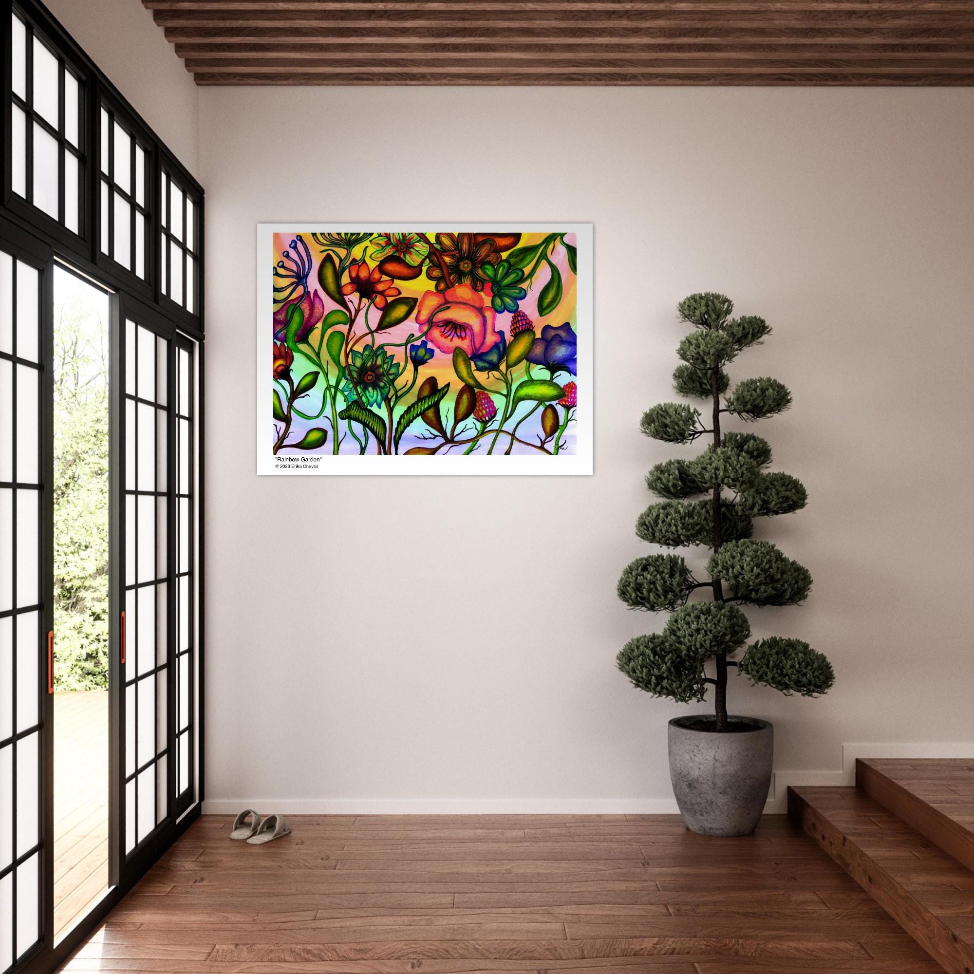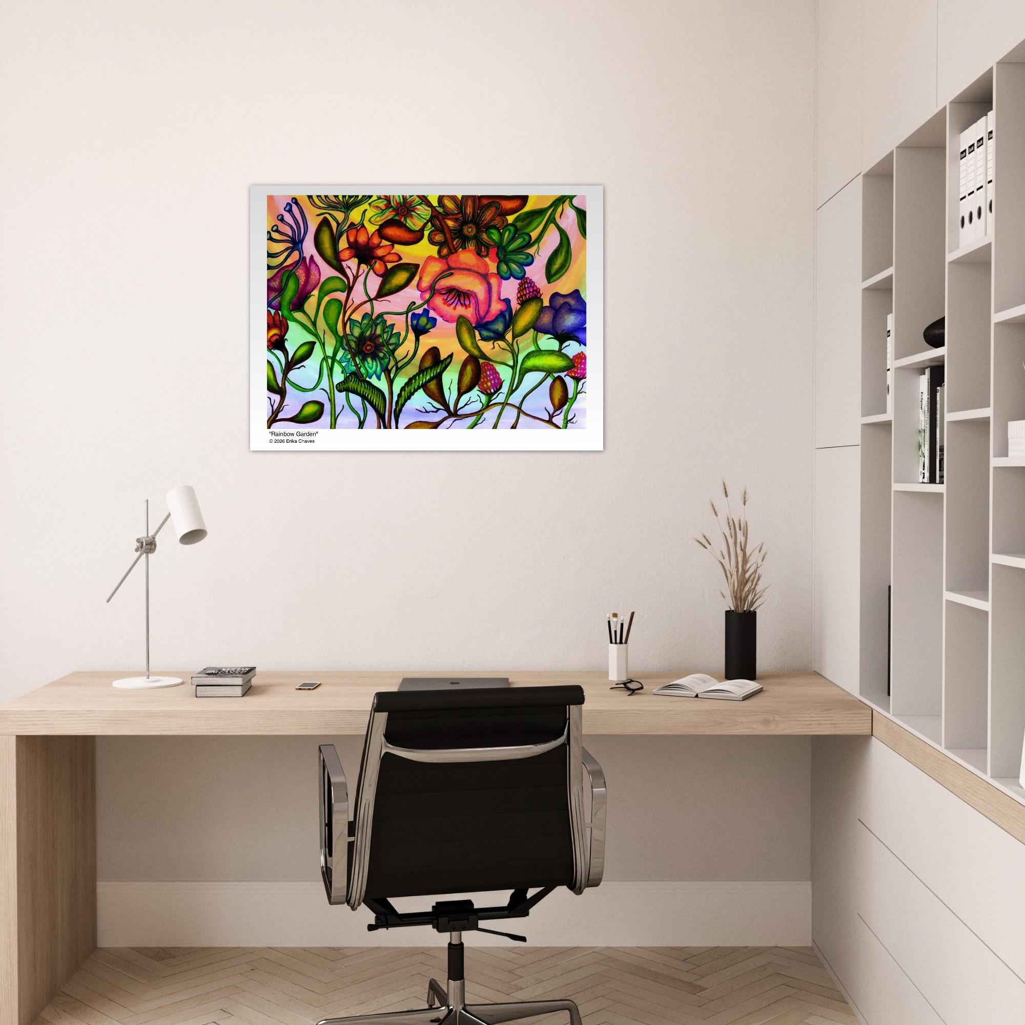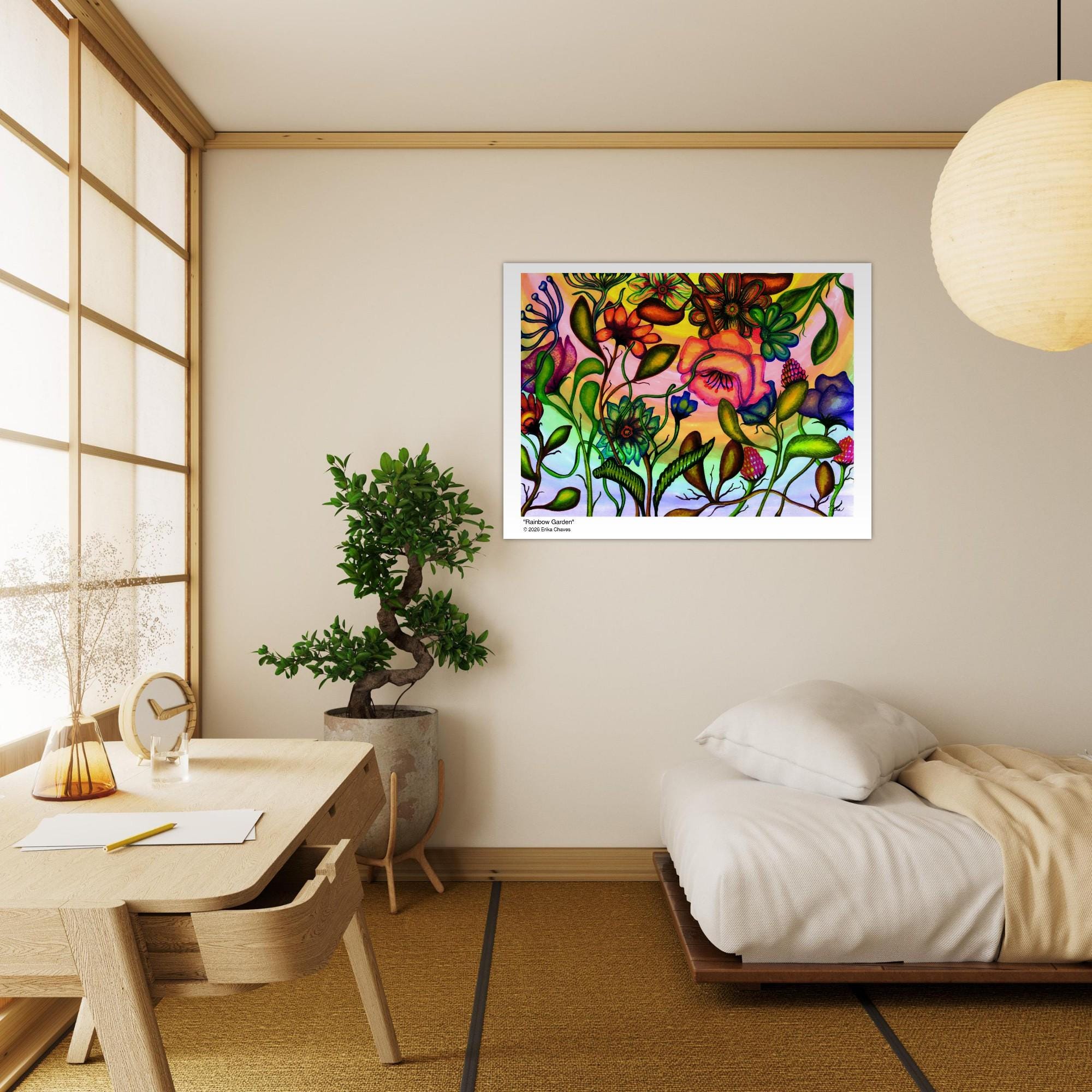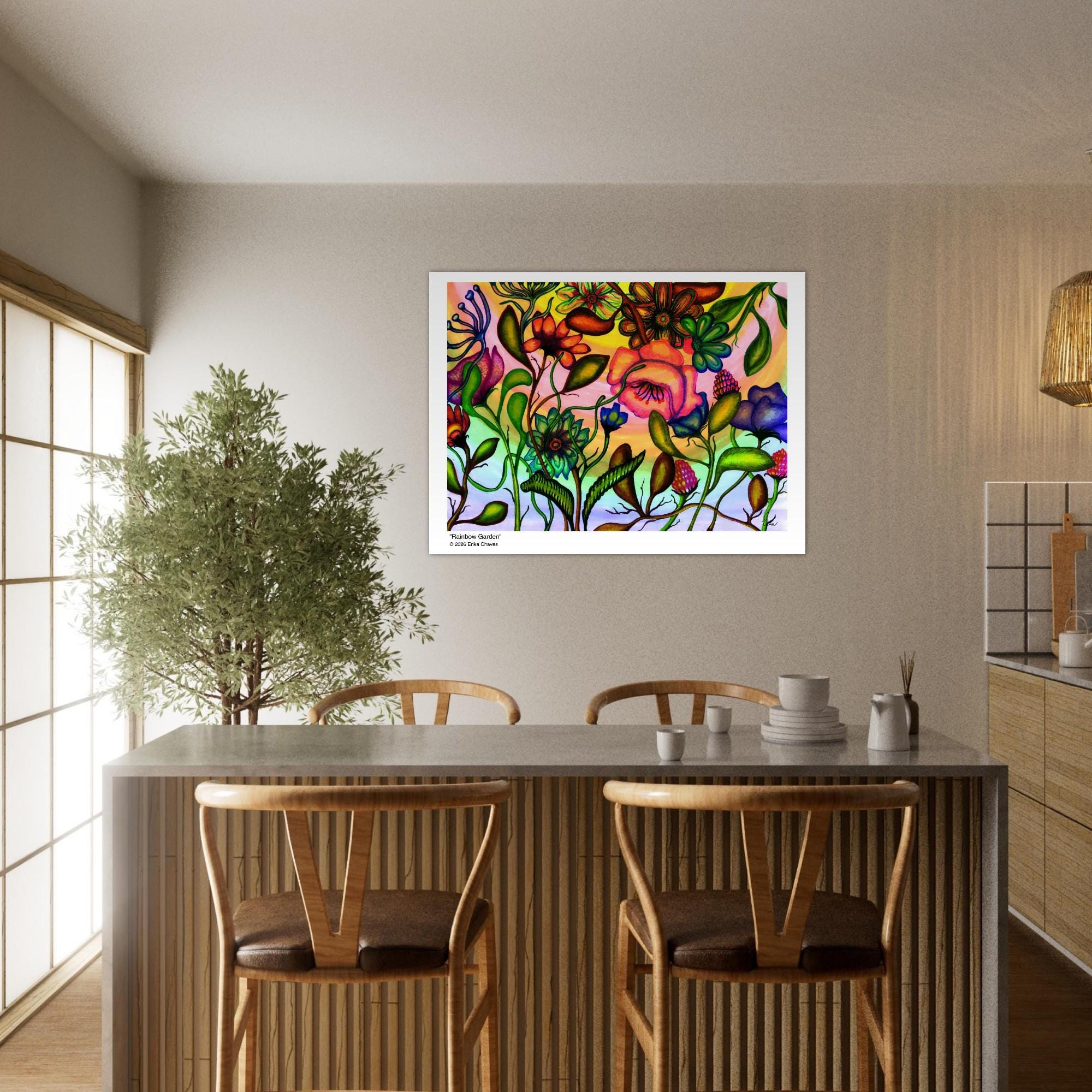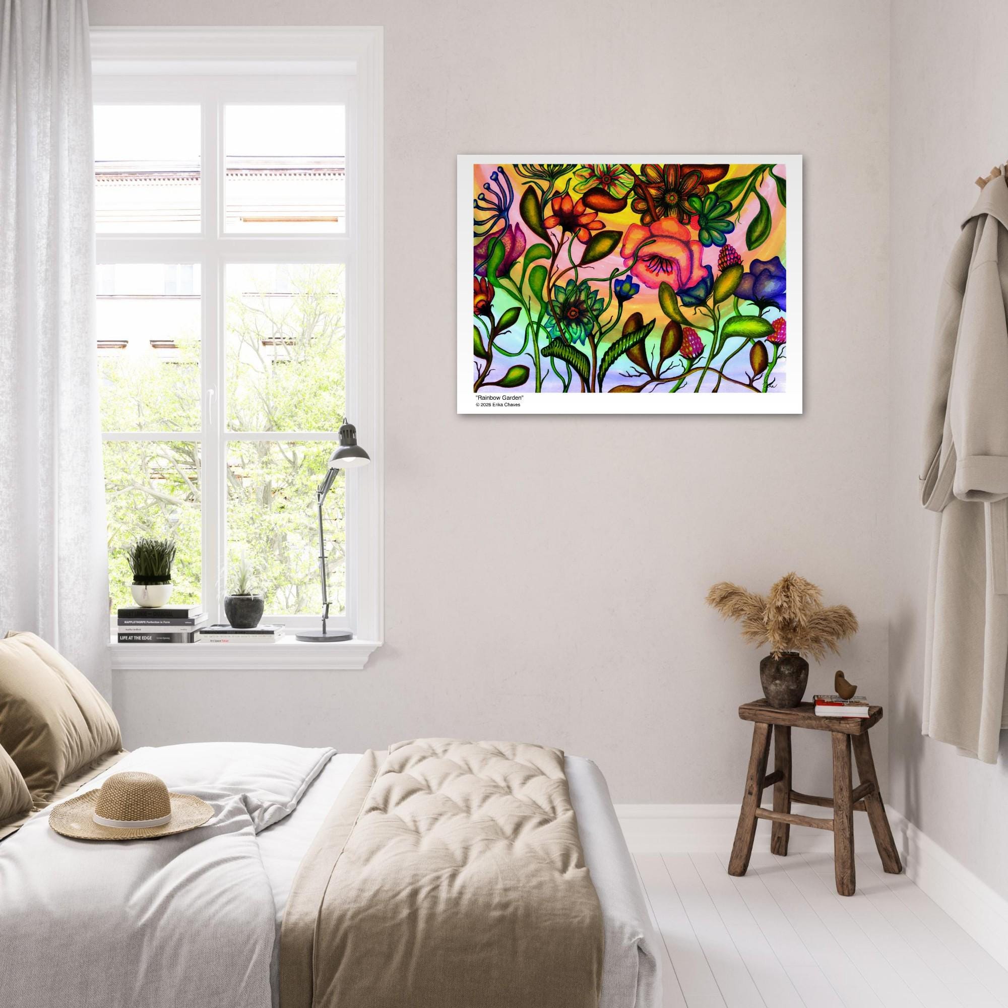This floral art print is an eclectic wall art poster featuring the colorful patterned artwork “Rainbow Garden” by artist and Colorthology owner Erika Chaves. Created from imagination, emotion, and layered pattern work, this piece blends bold florals, intricate motifs, and a whimsical sense of character to create a joyful, eye‑catching centerpiece for any room.