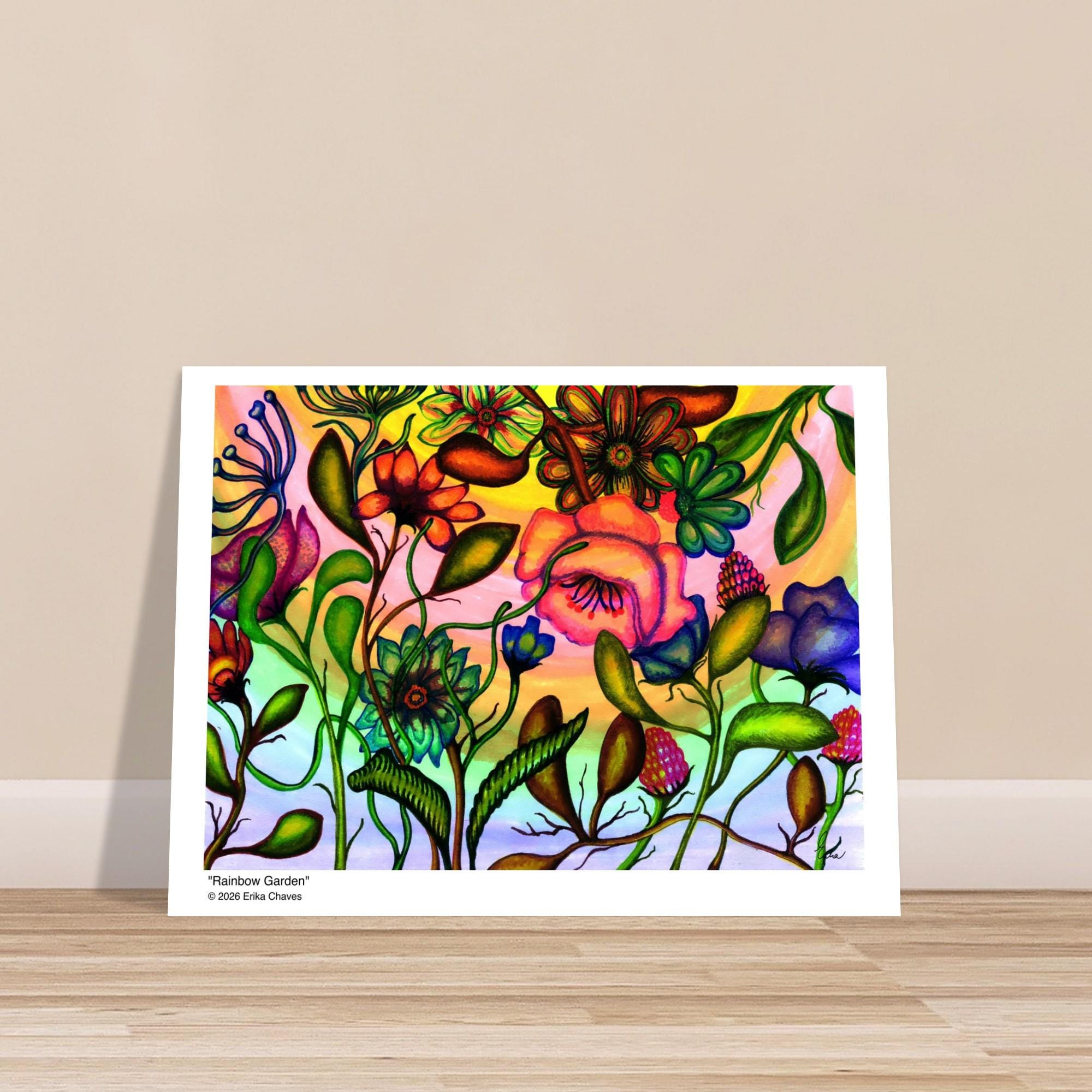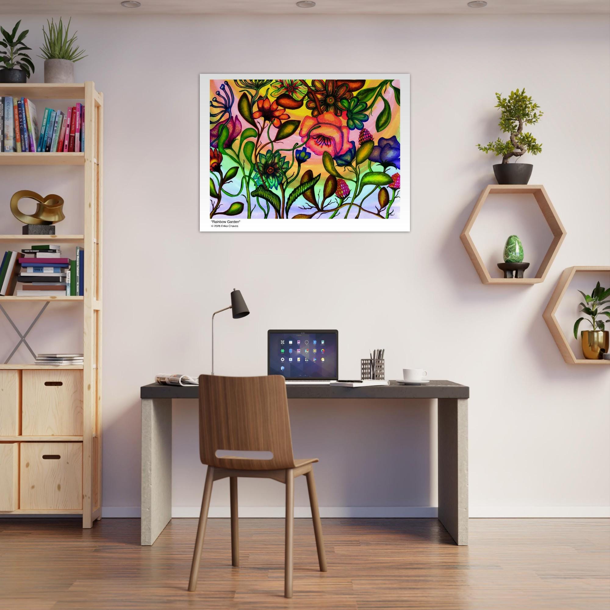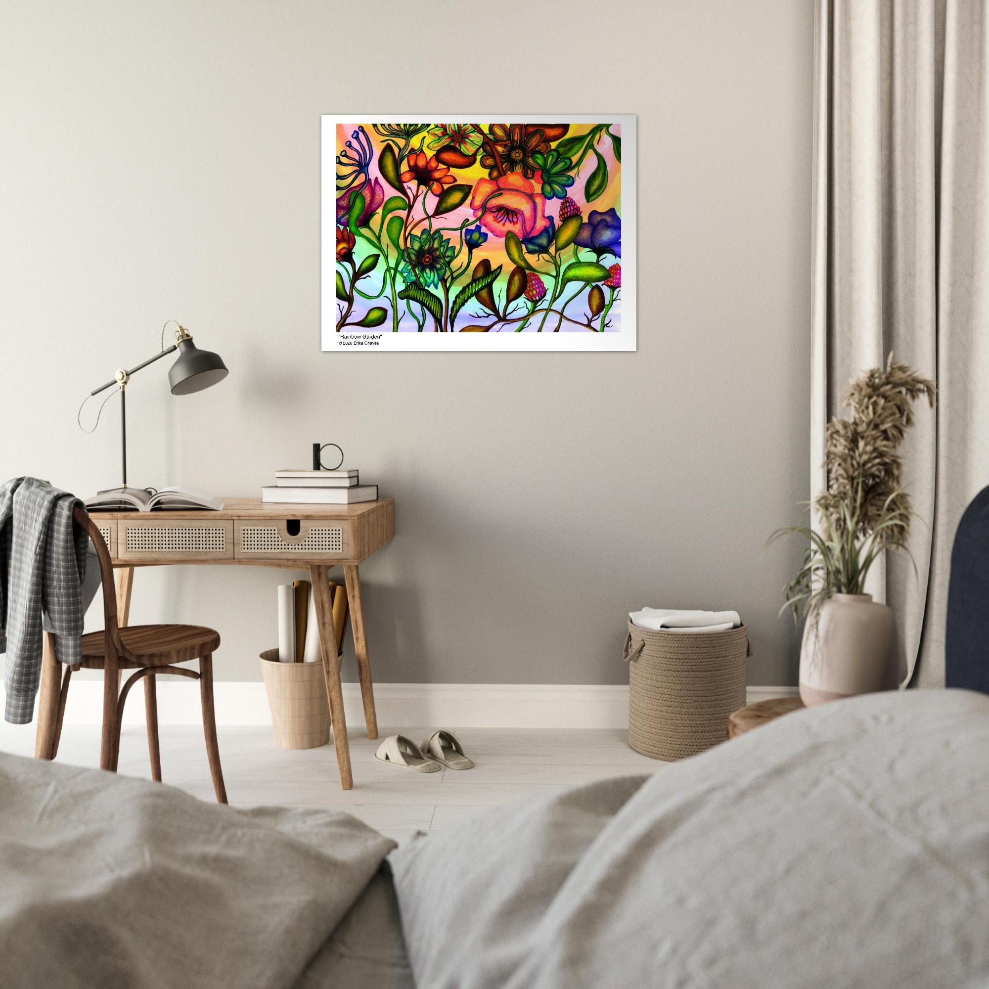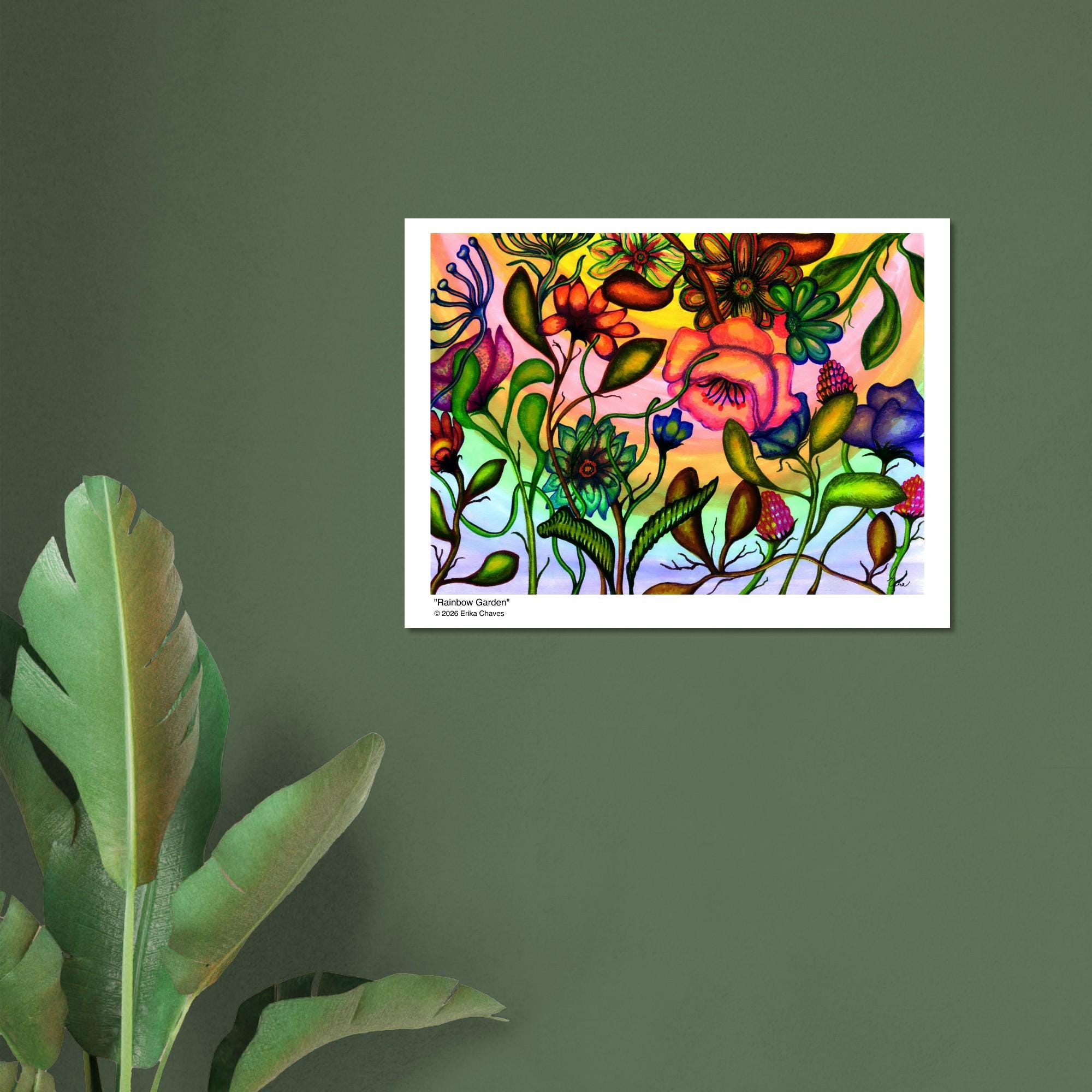 This floral art print is an eclectic wall art poster featuring the colorful patterned artwork “Rainbow Garden” by artist and Colorthology owner Erika Chaves. Created from imagination, emotion, and layered pattern work, this piece blends bold florals, intricate motifs, and a whimsical sense of character to create a joyful, eye‑catching centerpiece for any room.
