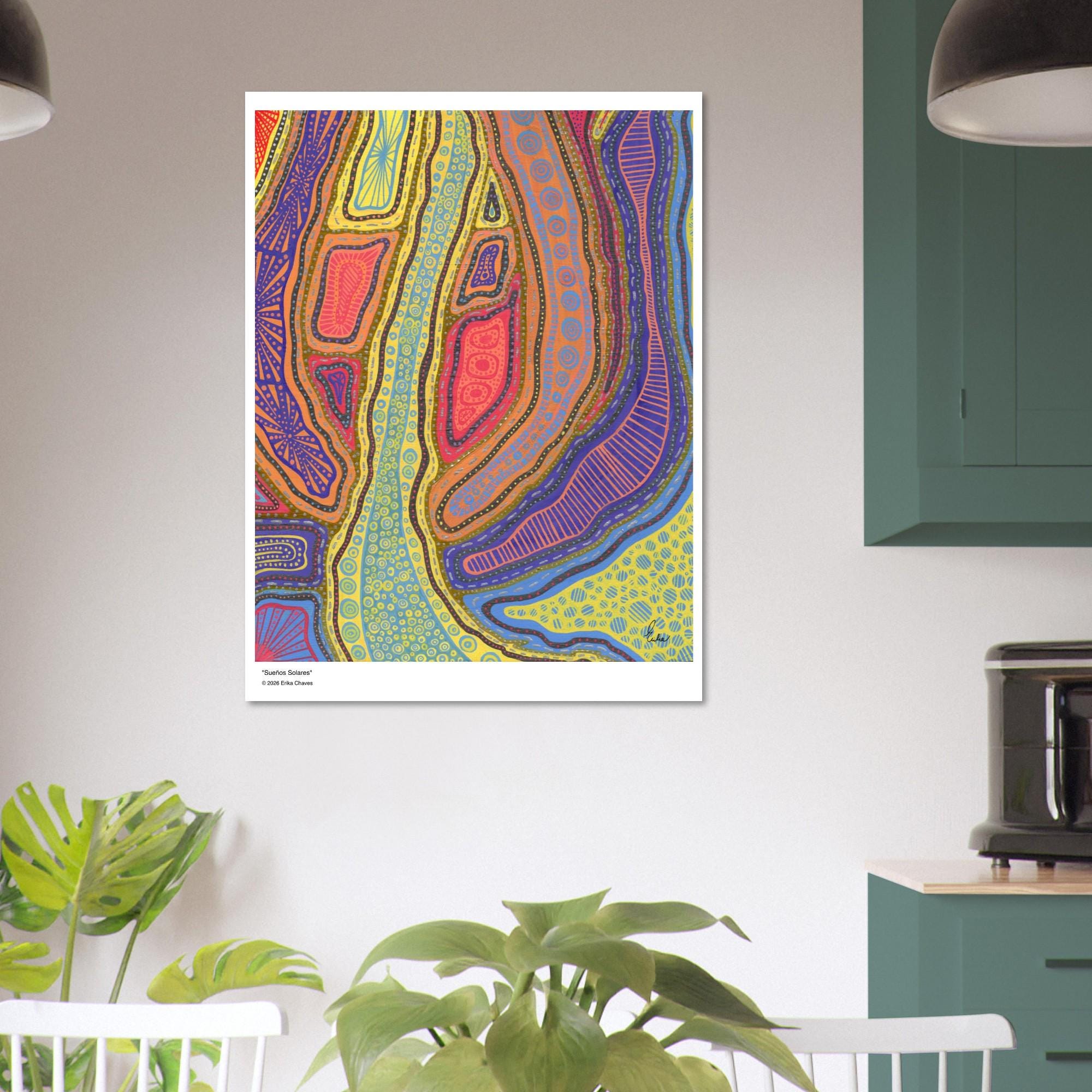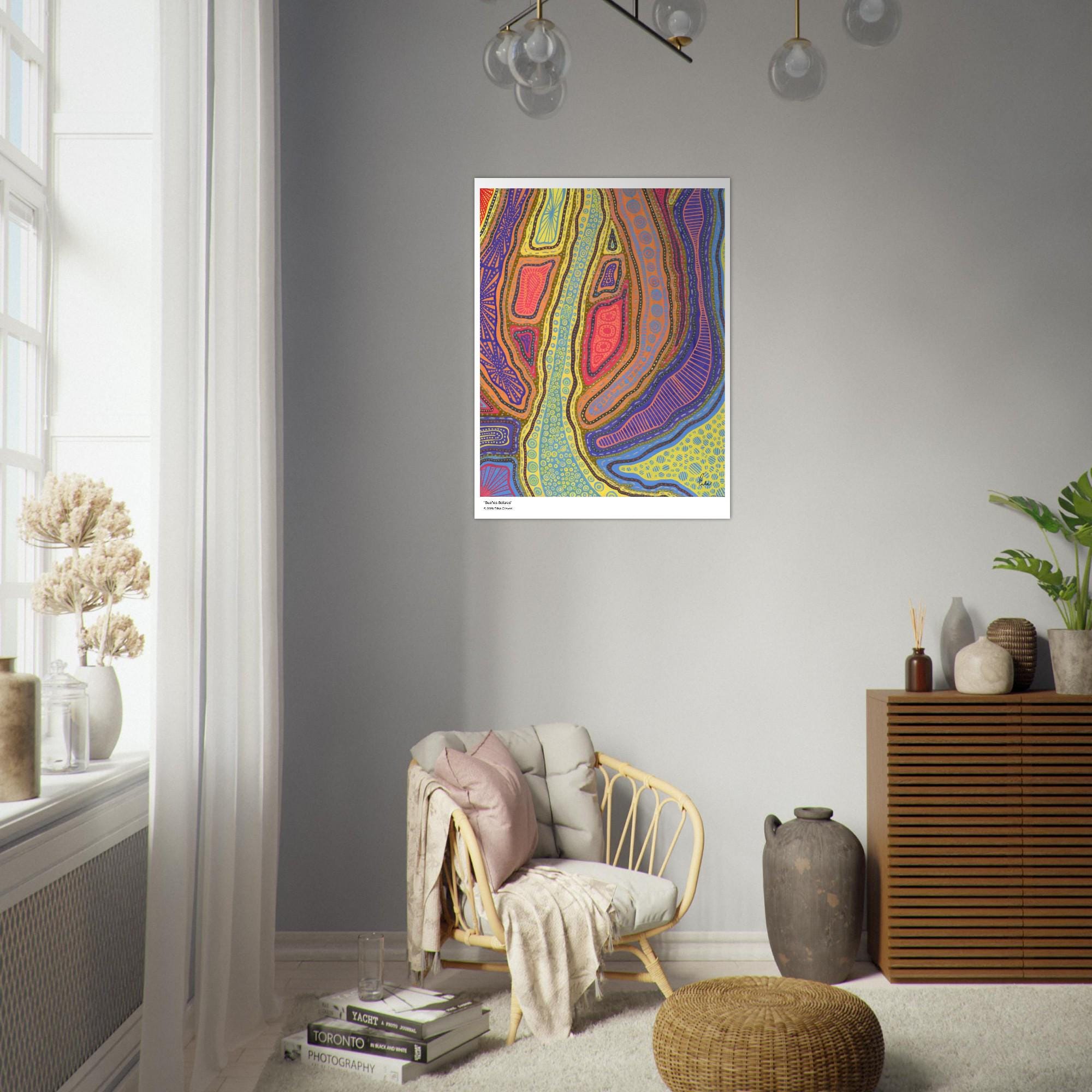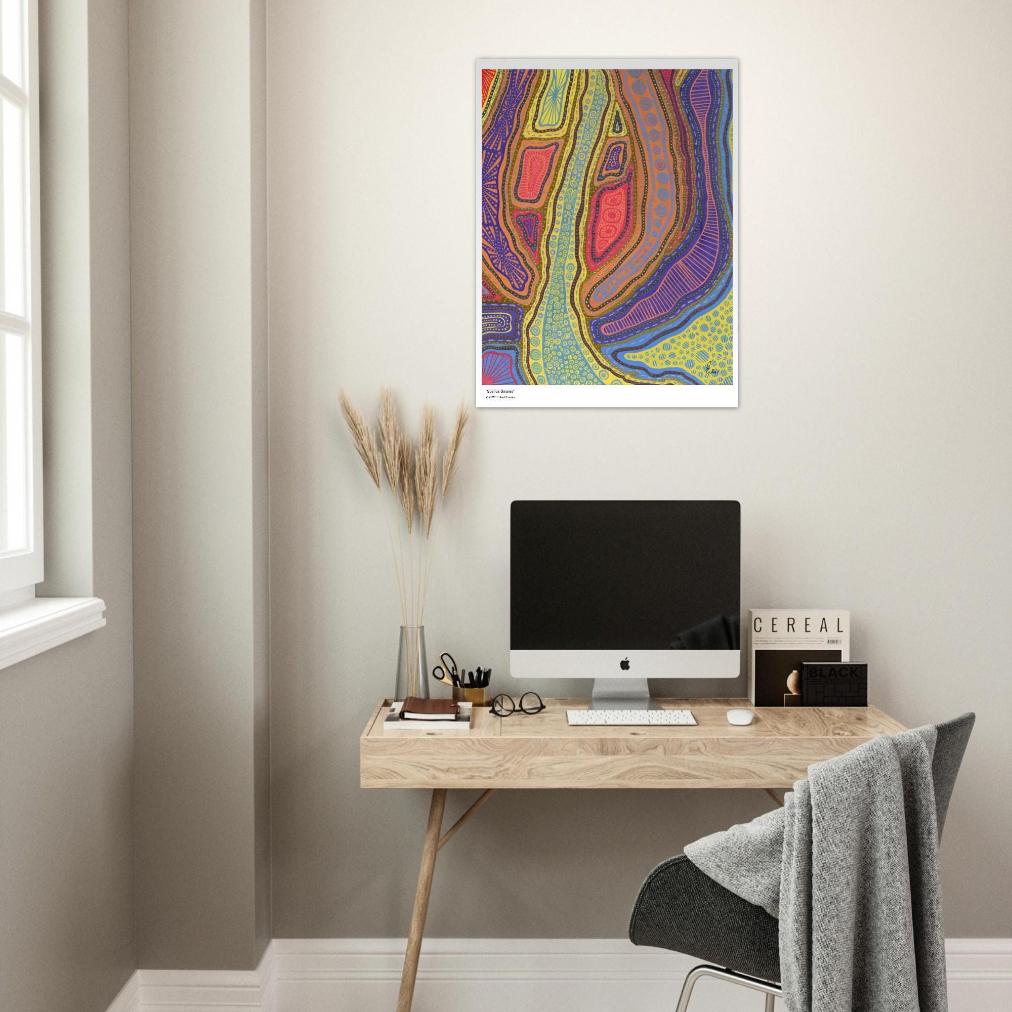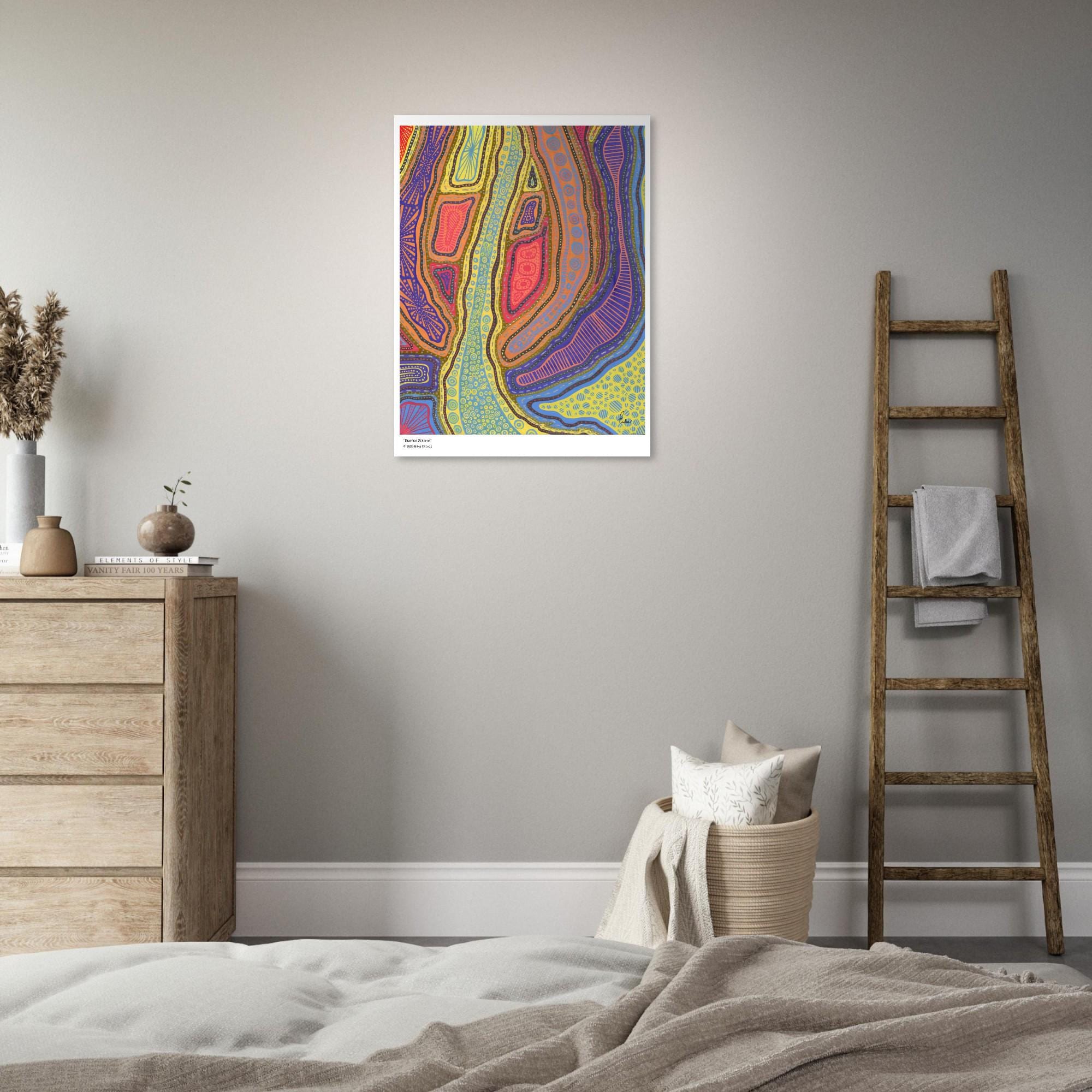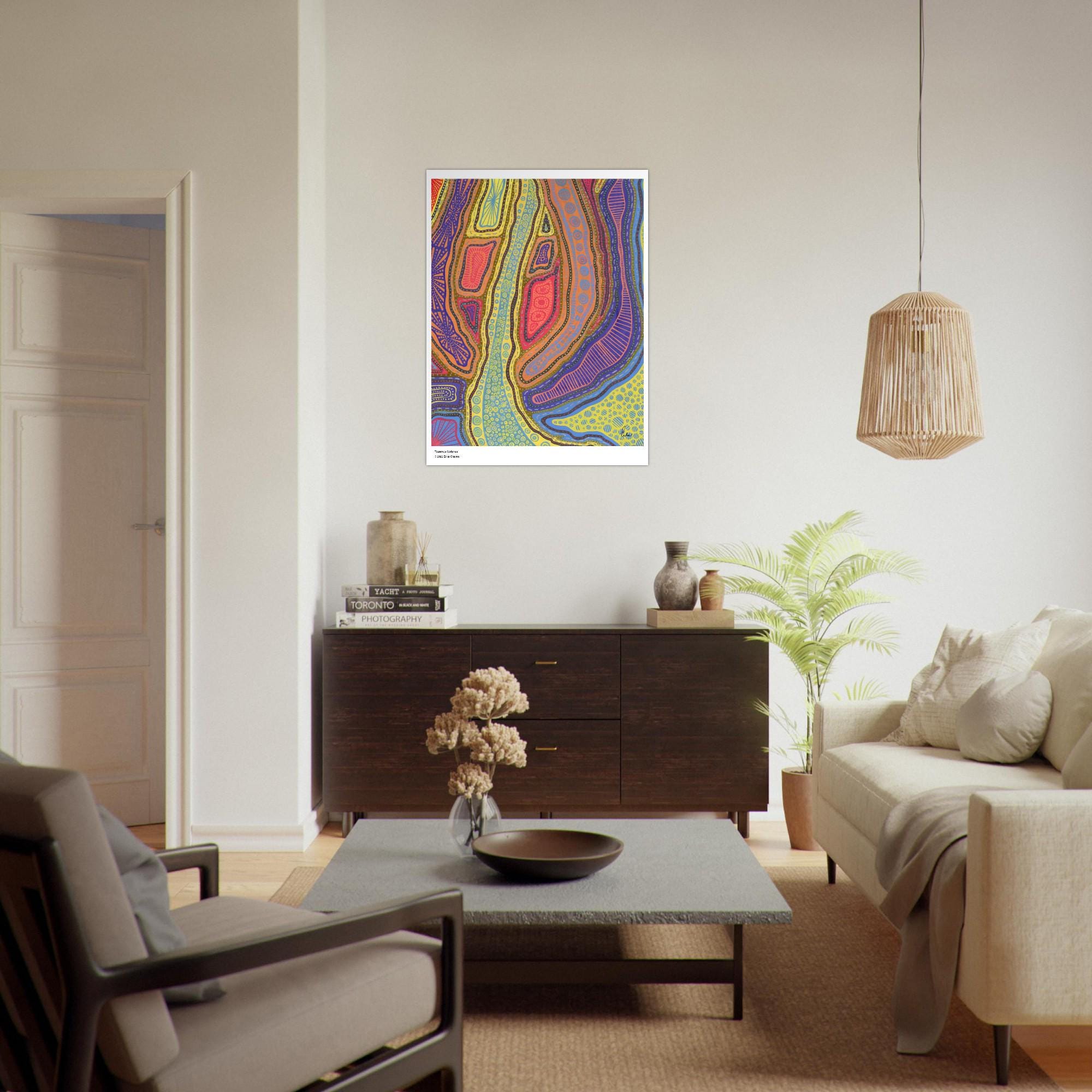 The Kakadu Art Print is a contemporary artwork inspired by the Indigenous Australian Art movement. This is an abstract design, Semi-Glossy Paper Poster, featuring a colorful patterned artwork. “Kakadu” was created by artist and Colorthology owner Erika Chaves. Created from imagination, a beautiful Australian trip, and layered pattern work, this piece features intricate motifs, and a colorful, eye‑catching centerpiece for any room.