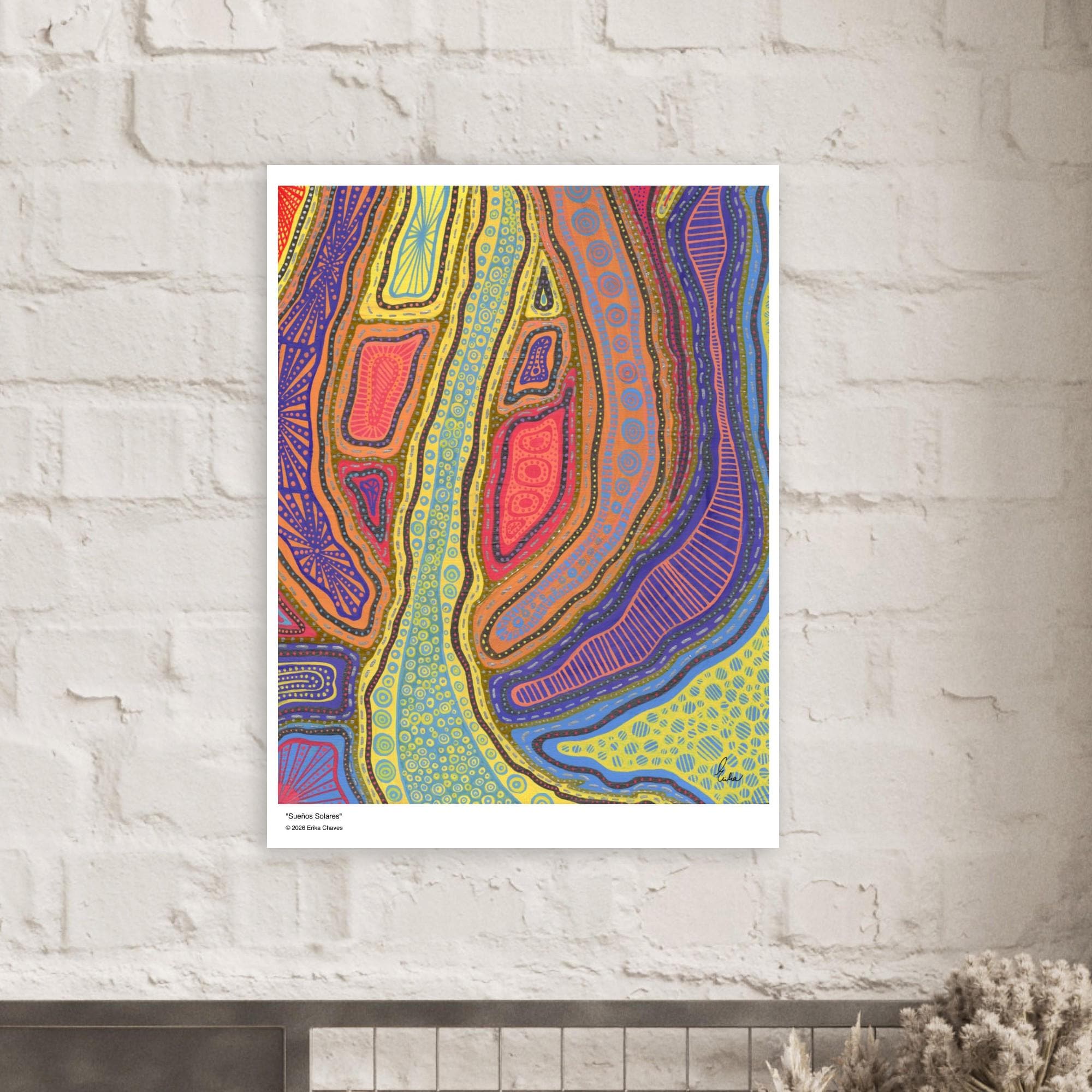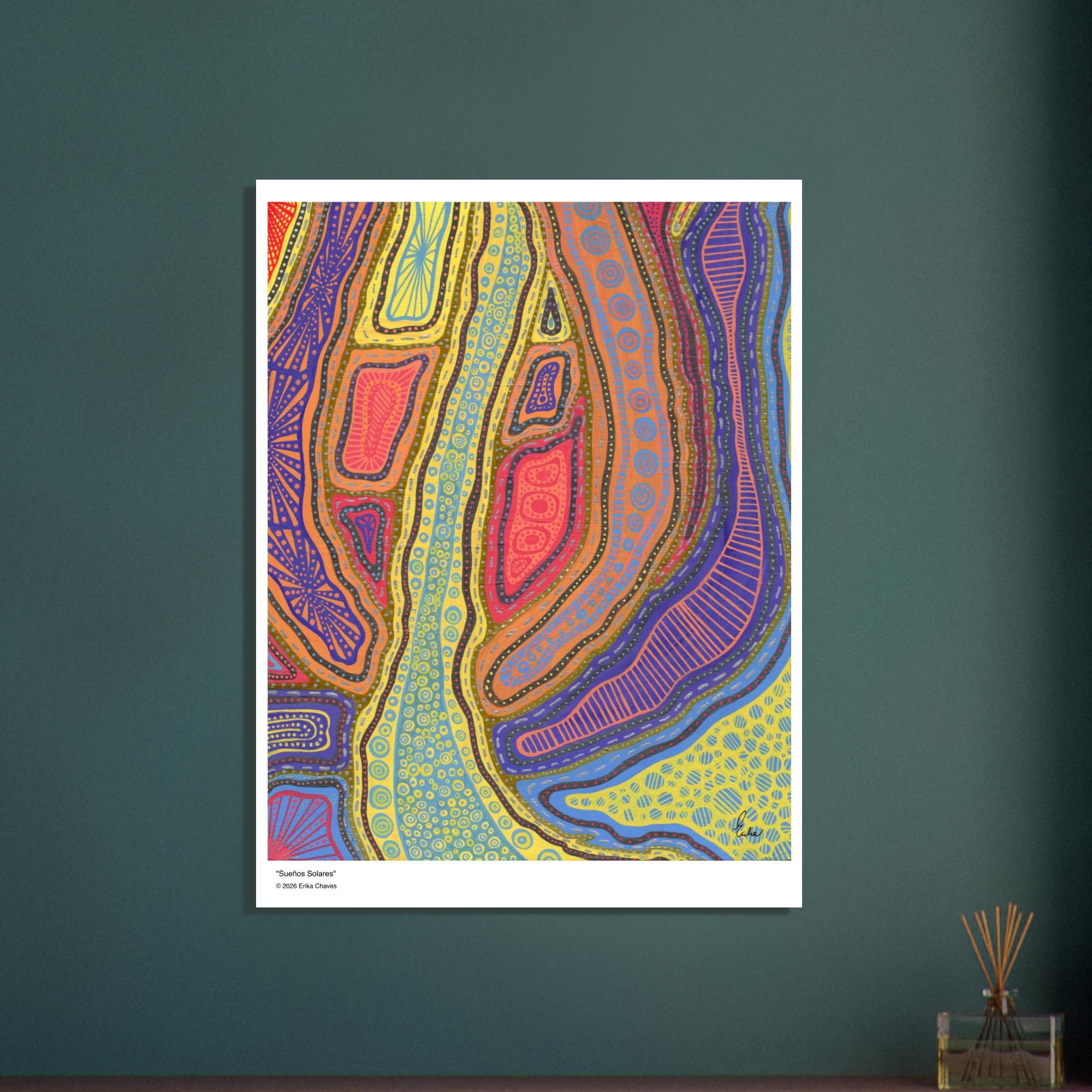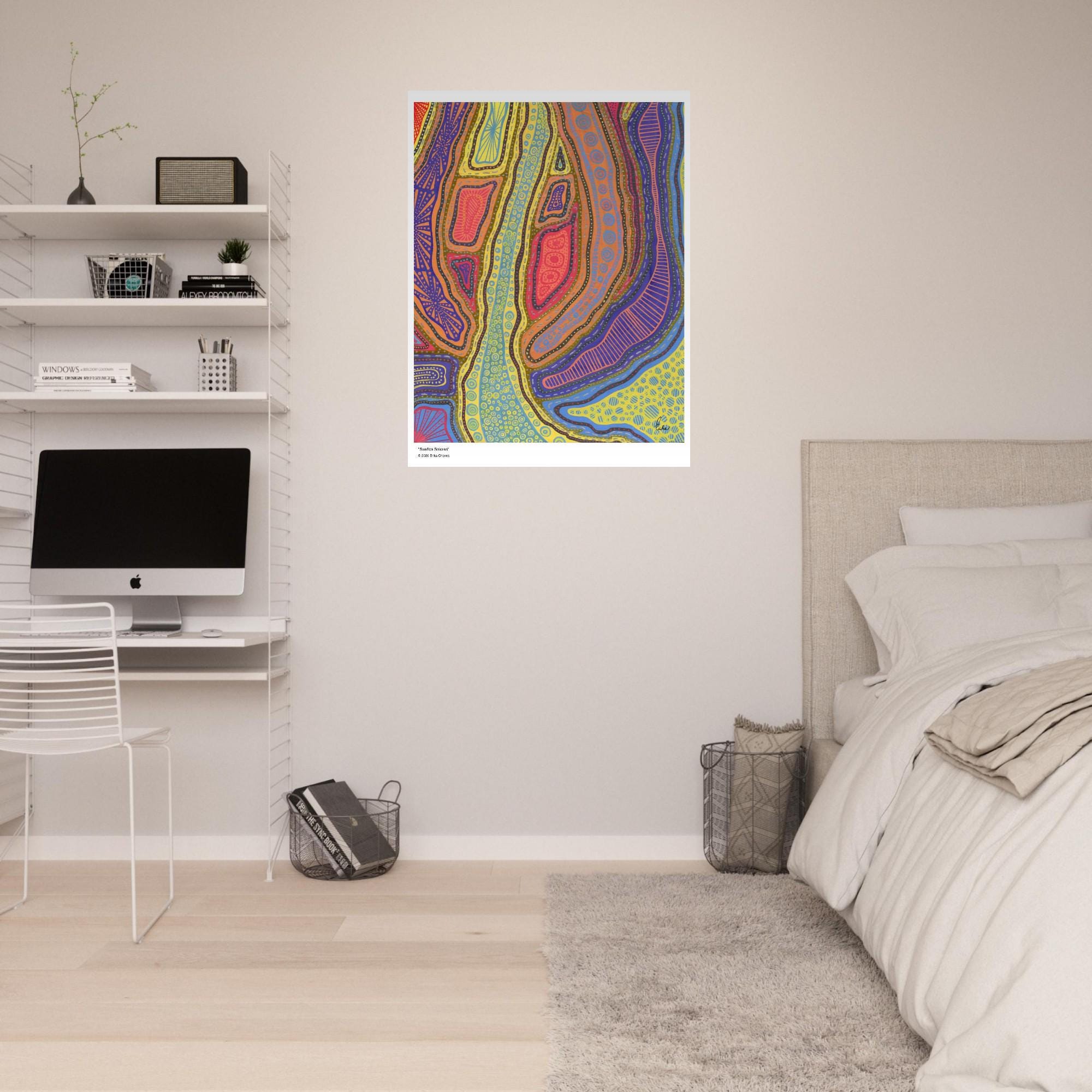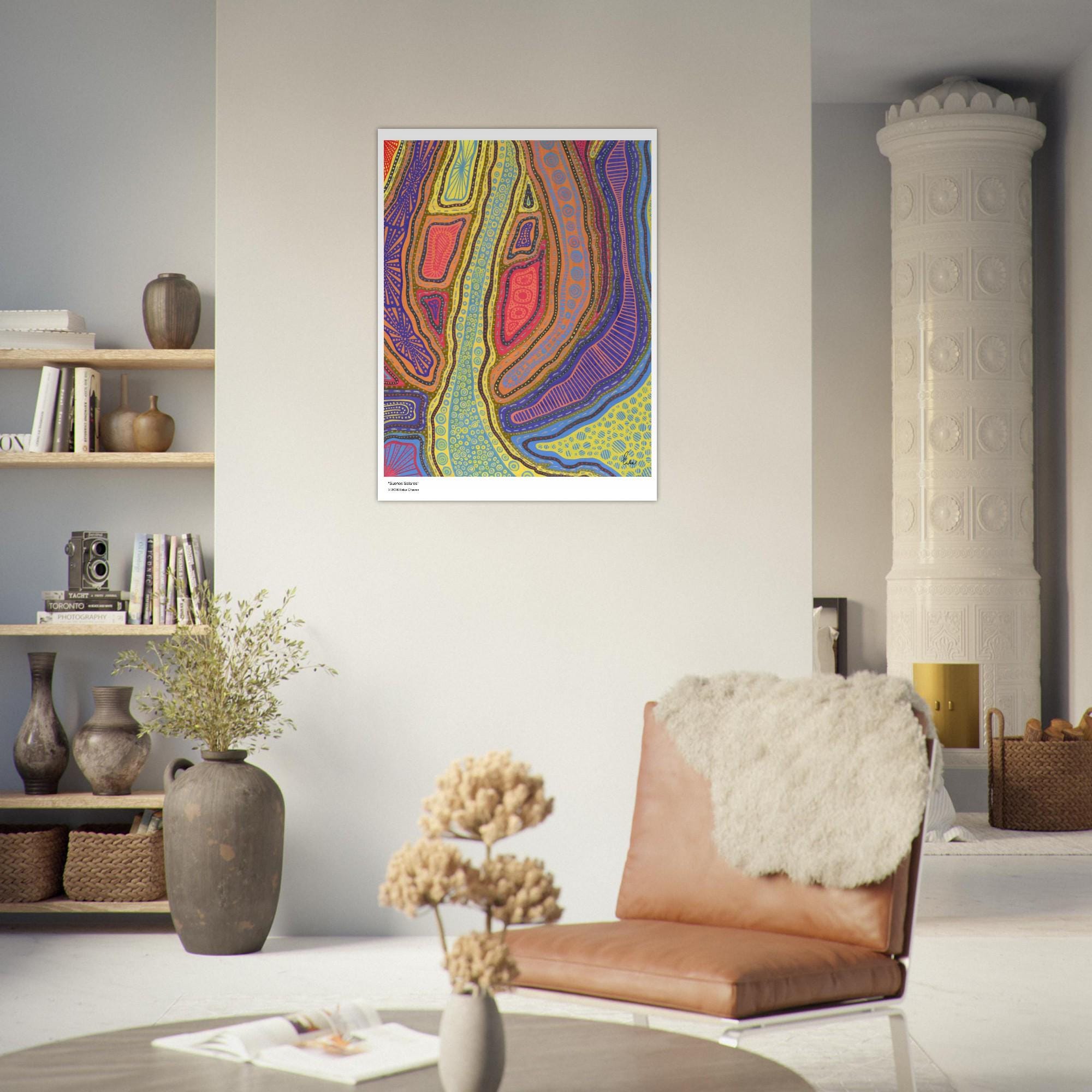 The Kakadu Art Print is a contemporary artwork inspired by the Indigenous Australian Art movement. This is an abstract design, Semi-Glossy Paper Poster, featuring a colorful patterned artwork. “Kakadu” was created by artist and Colorthology owner Erika Chaves. Created from imagination, a beautiful Australian trip, and layered pattern work, this piece features intricate motifs, and a colorful, eye‑catching centerpiece for any room.